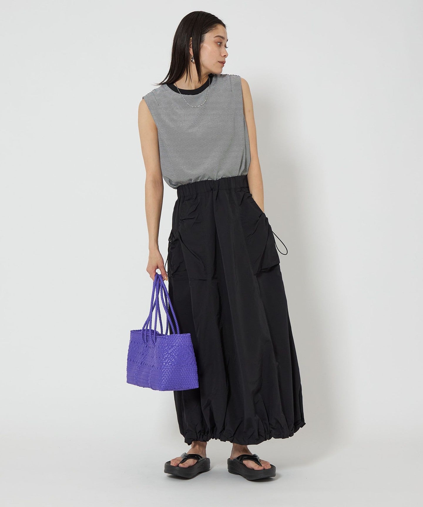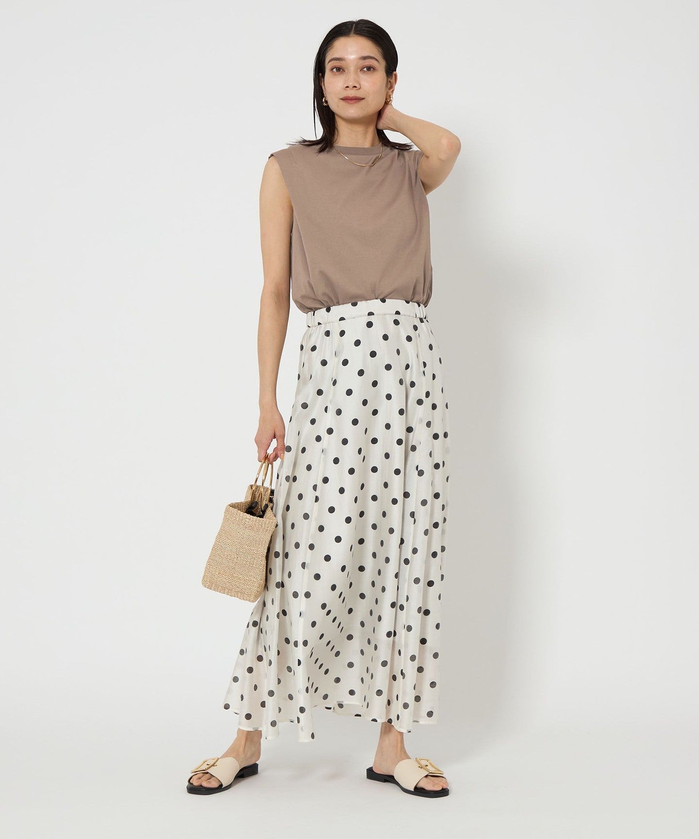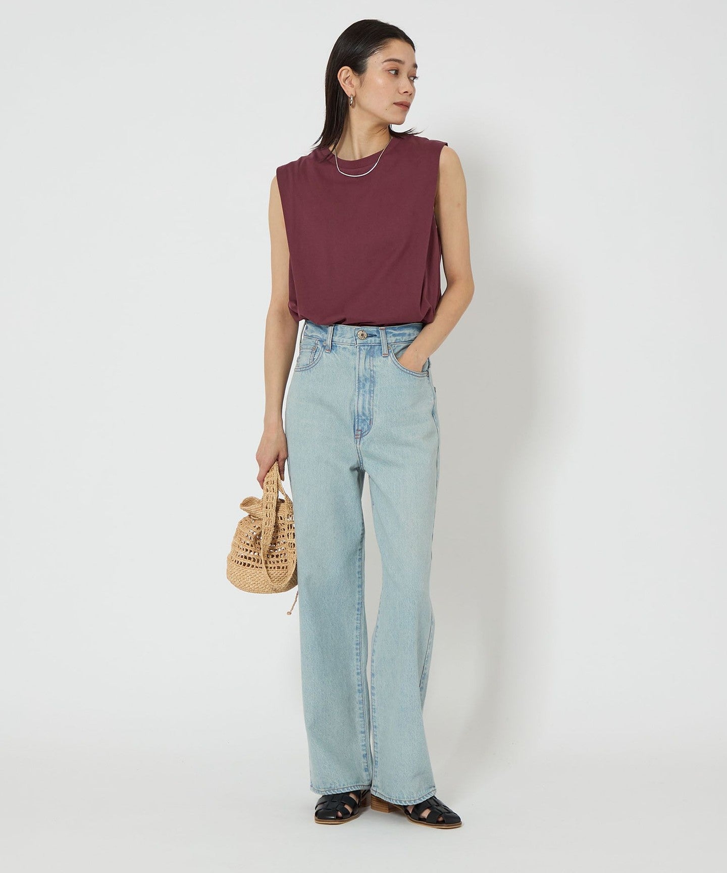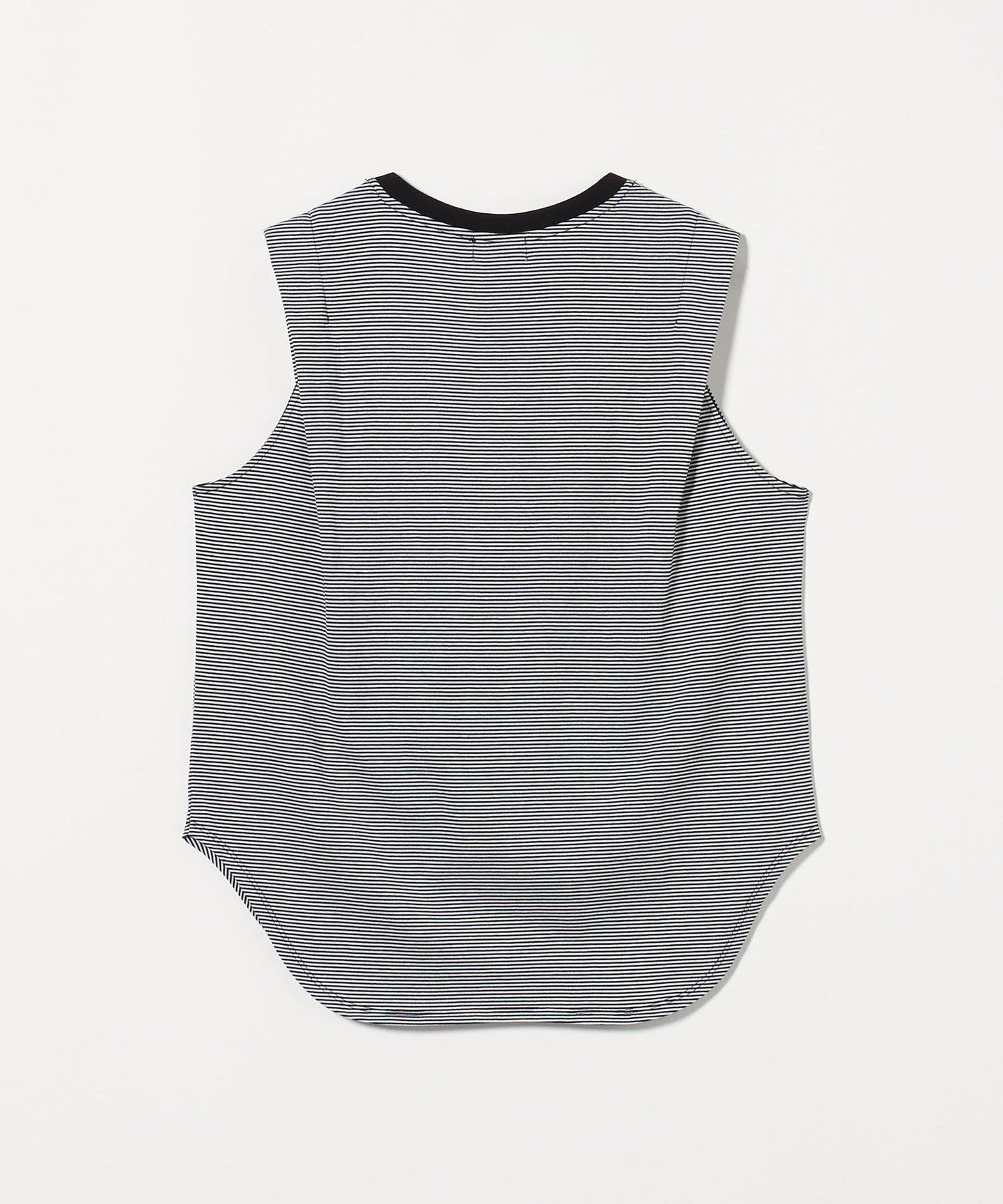 A sleeveless T-shirt with a tuck design on the shoulders.