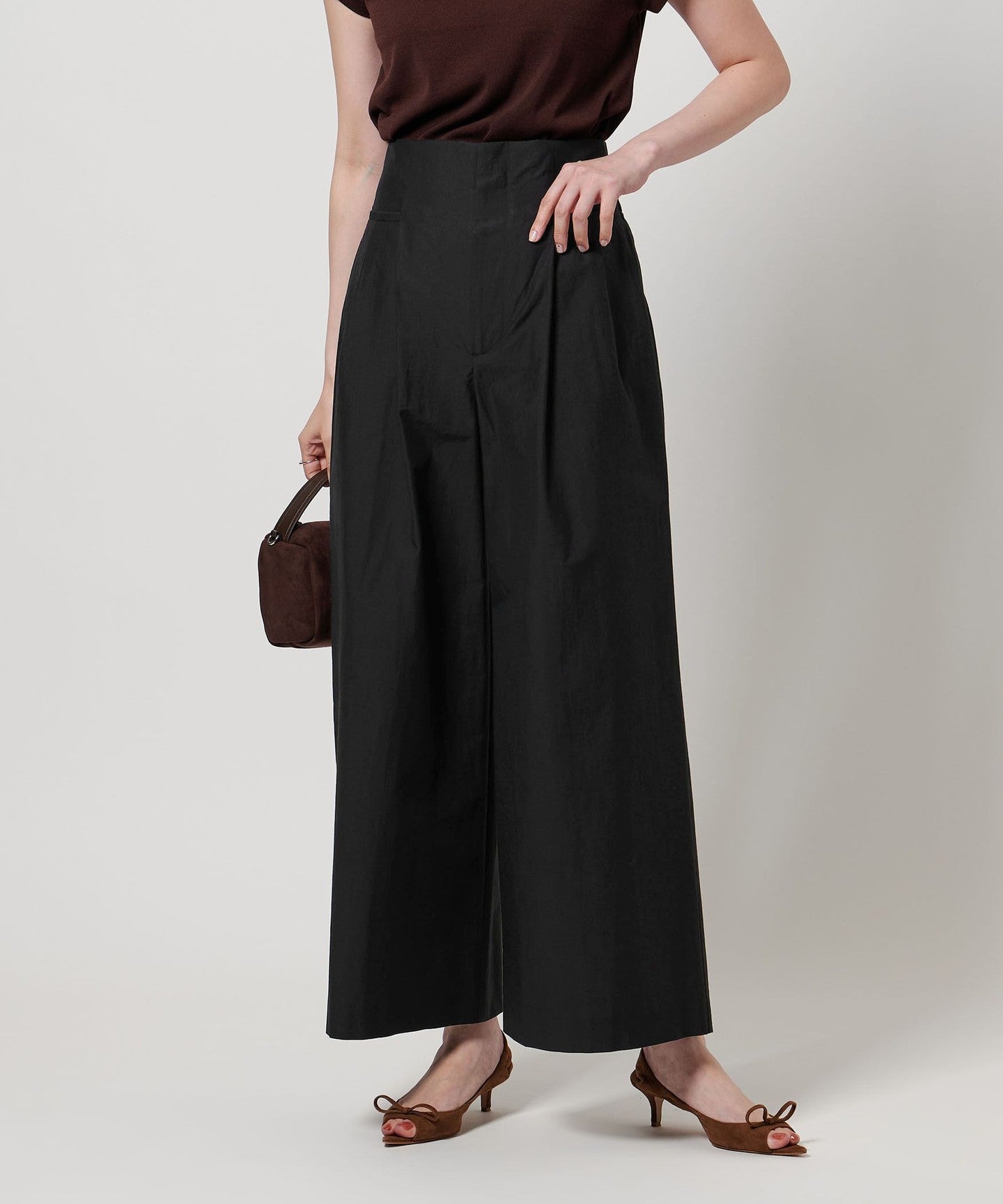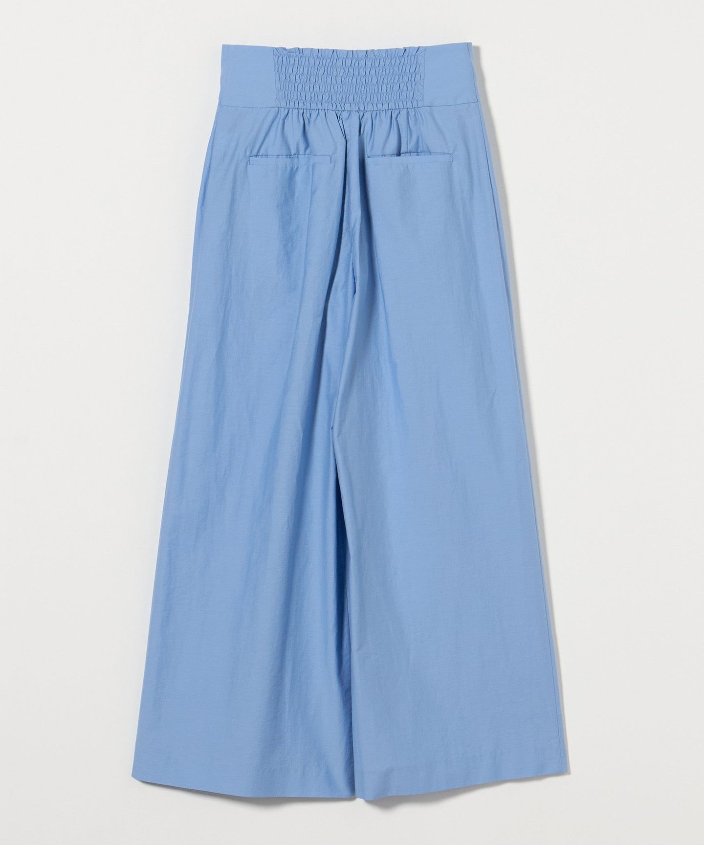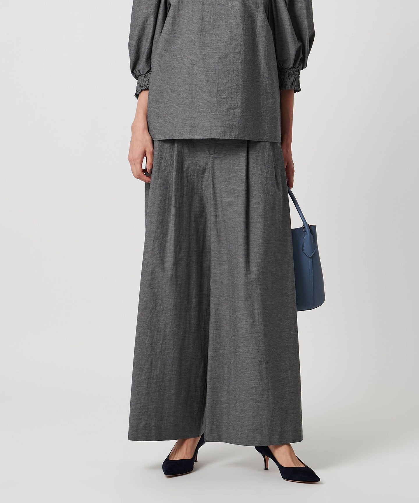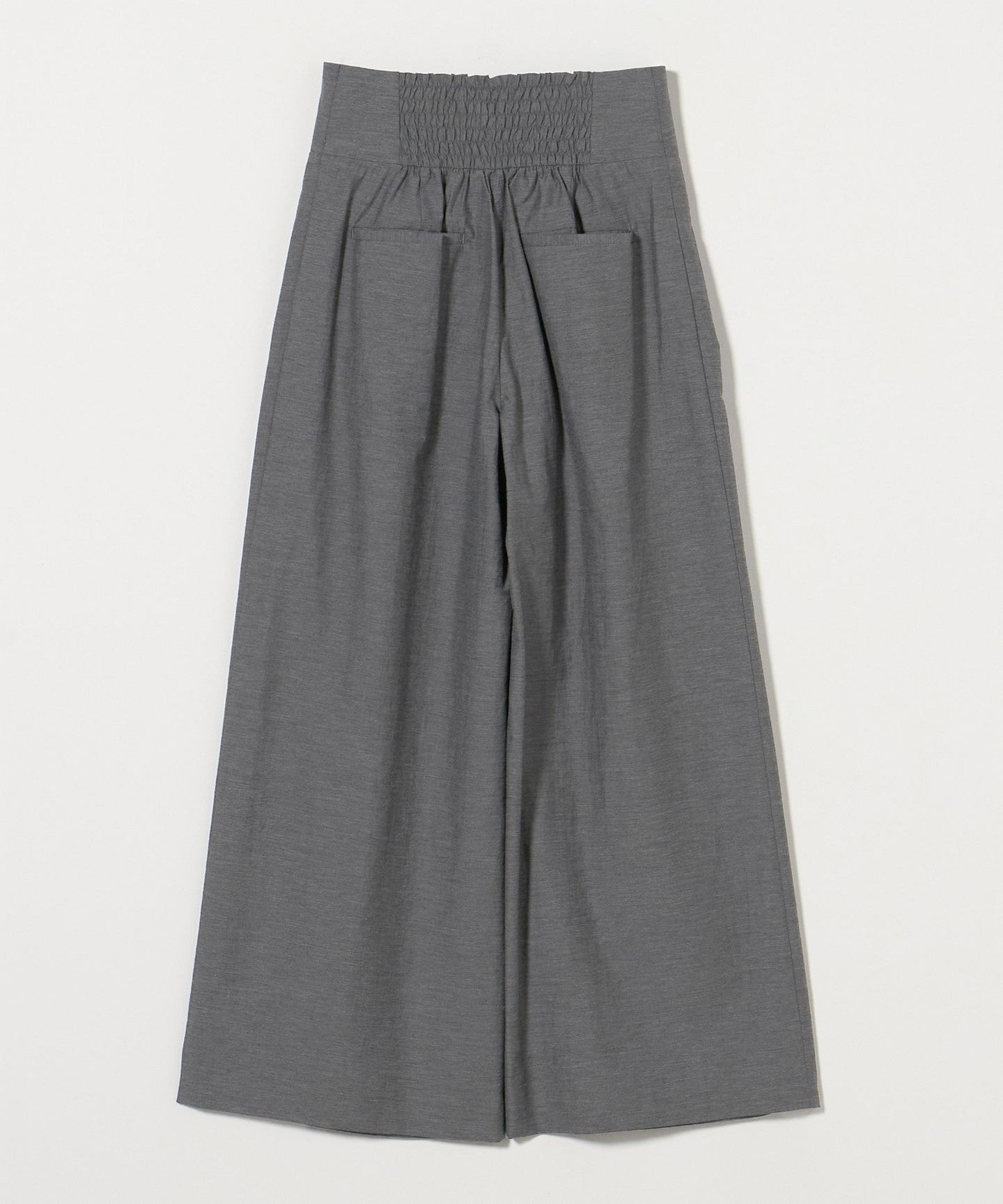 These two-pleat wide pants have a high waist and shirring at the back, making them comfortable to wear.