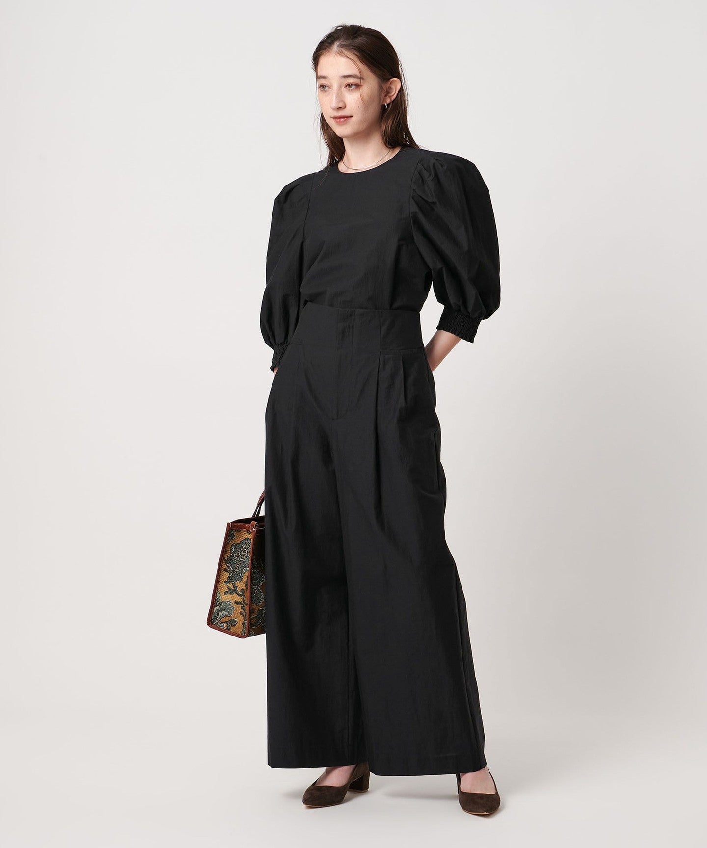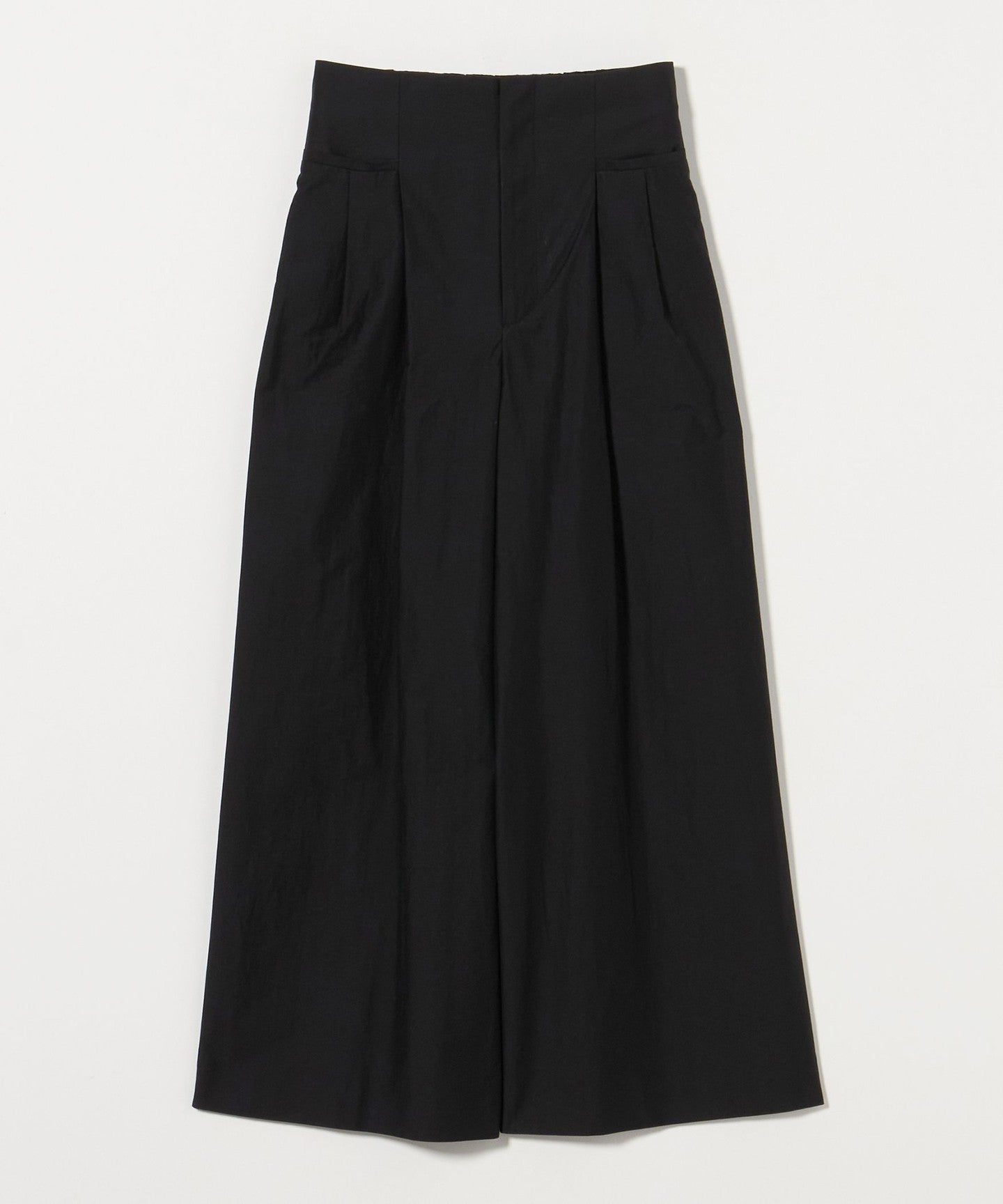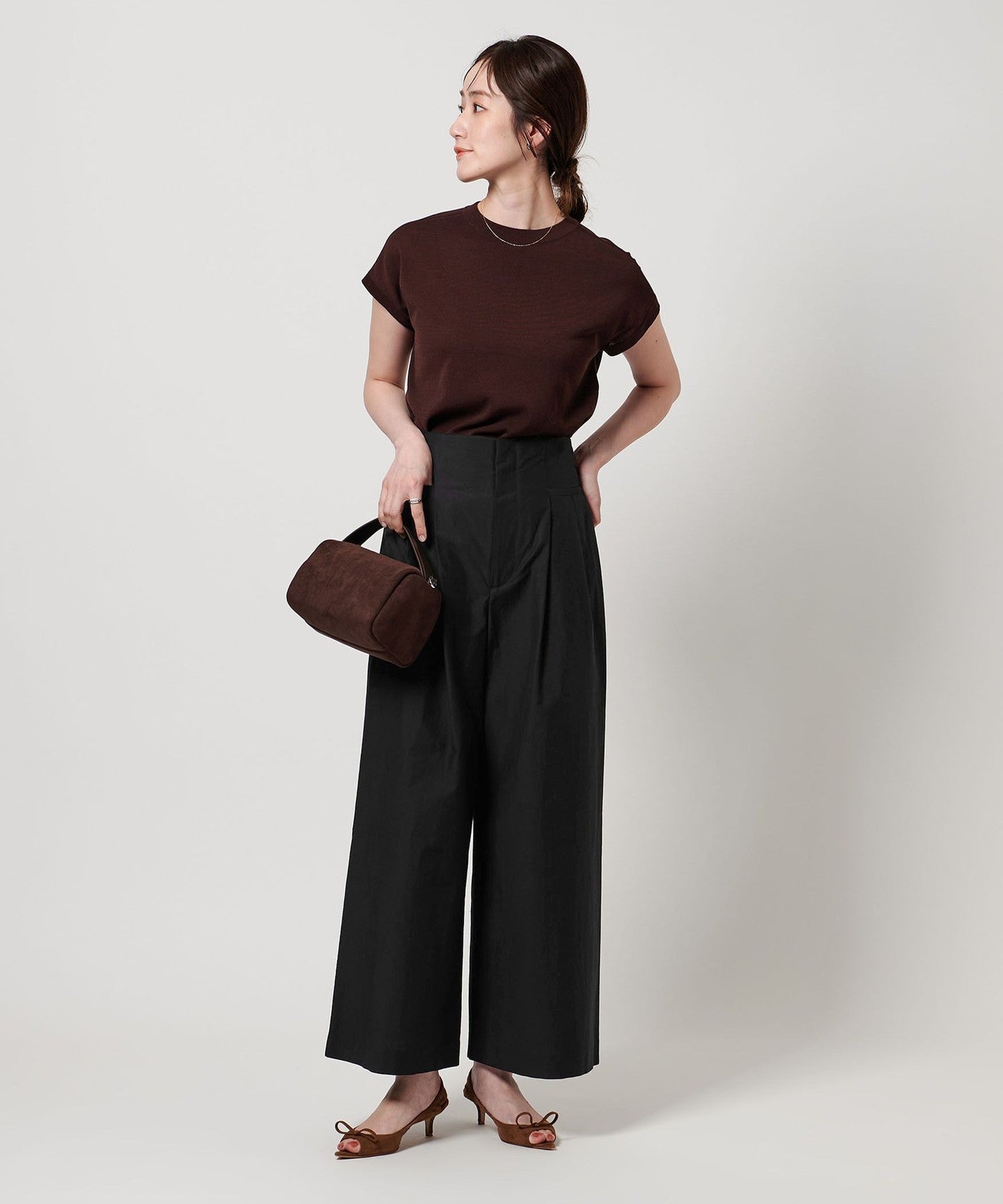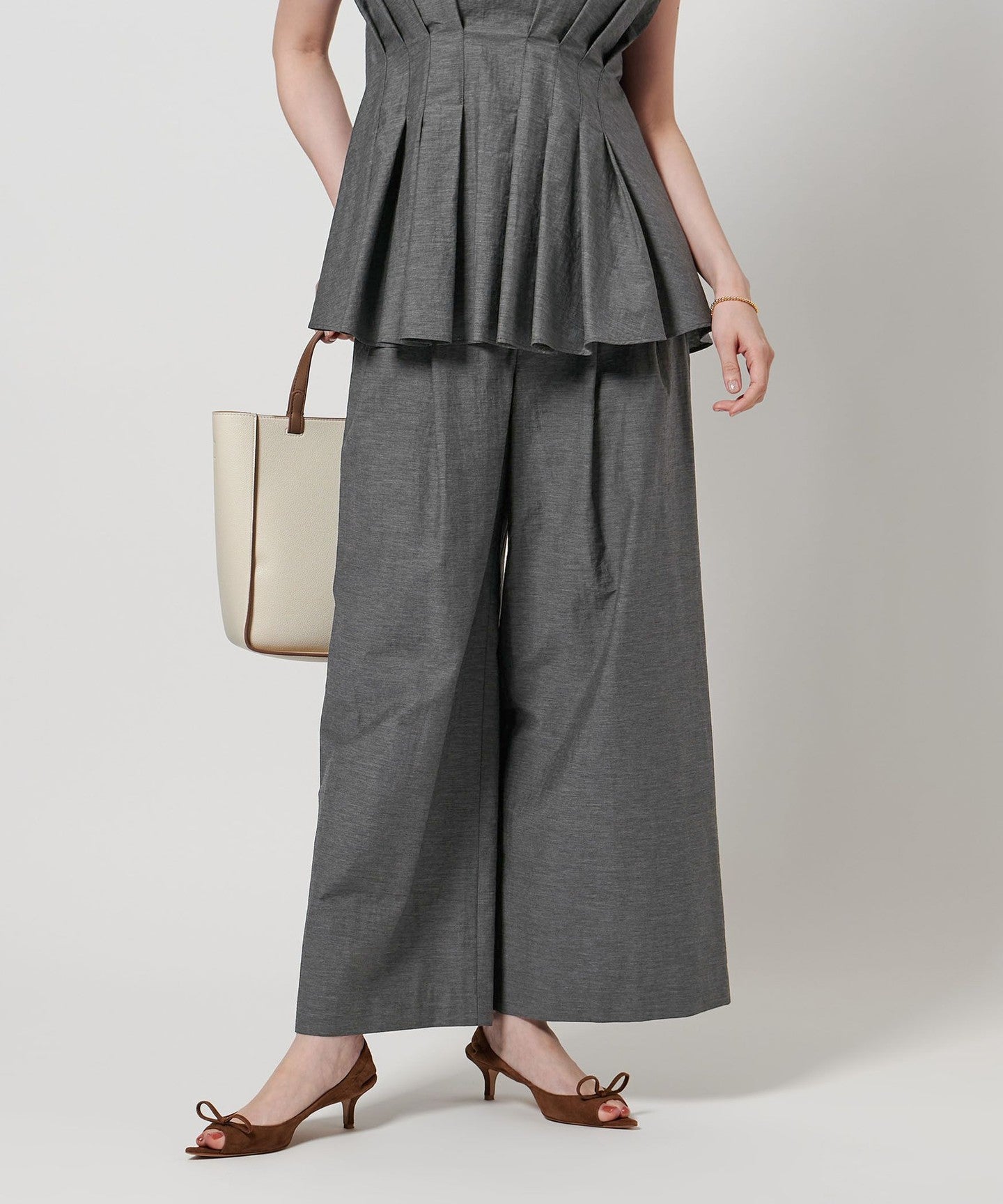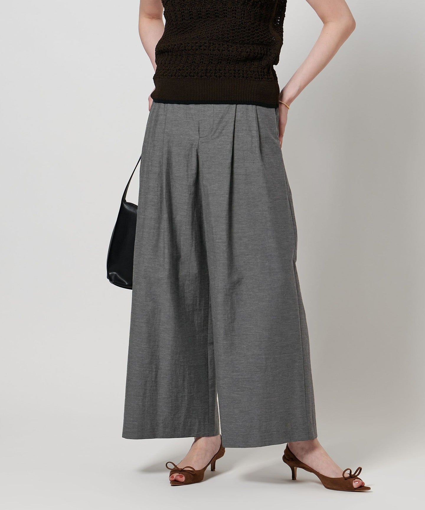 These two-pleat wide pants have a high waist and shirring at the back, making them comfortable to wear.
