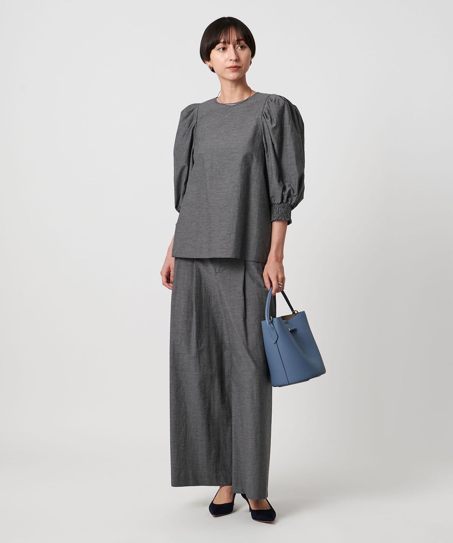 It can be paired with a blouse made of the same material, and we also recommend coordinating it with fitted cut-and-sew tops and knitwear.
