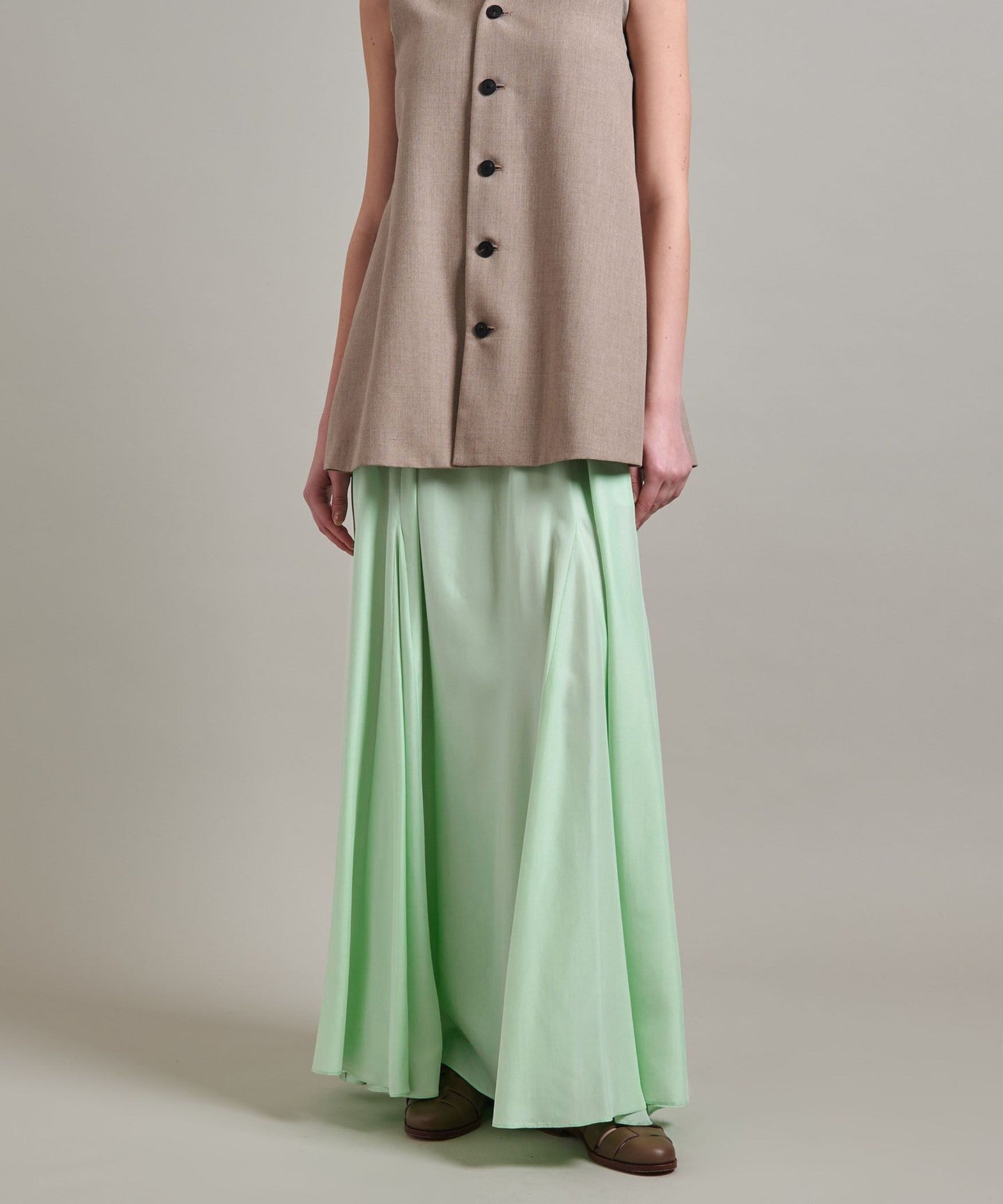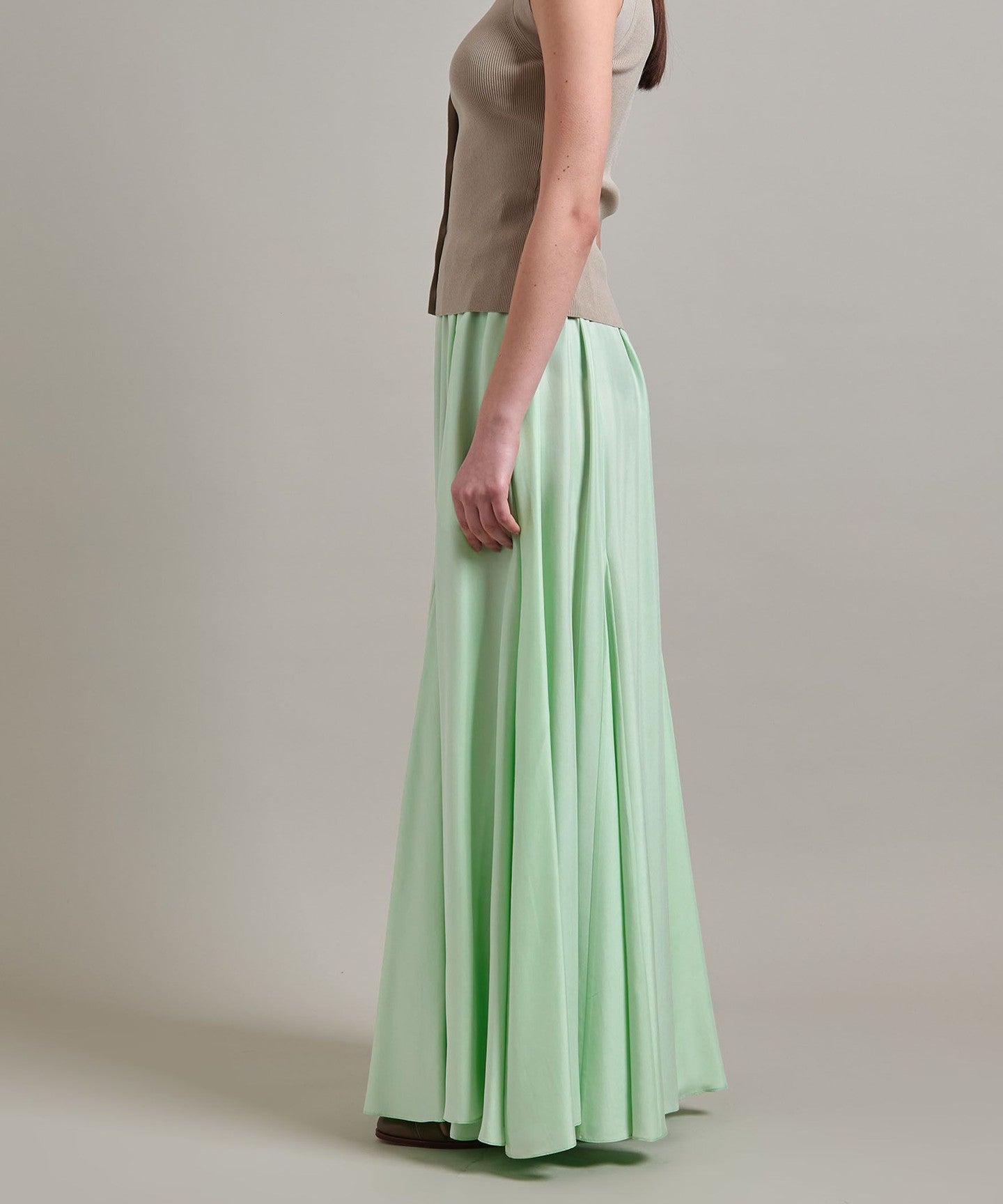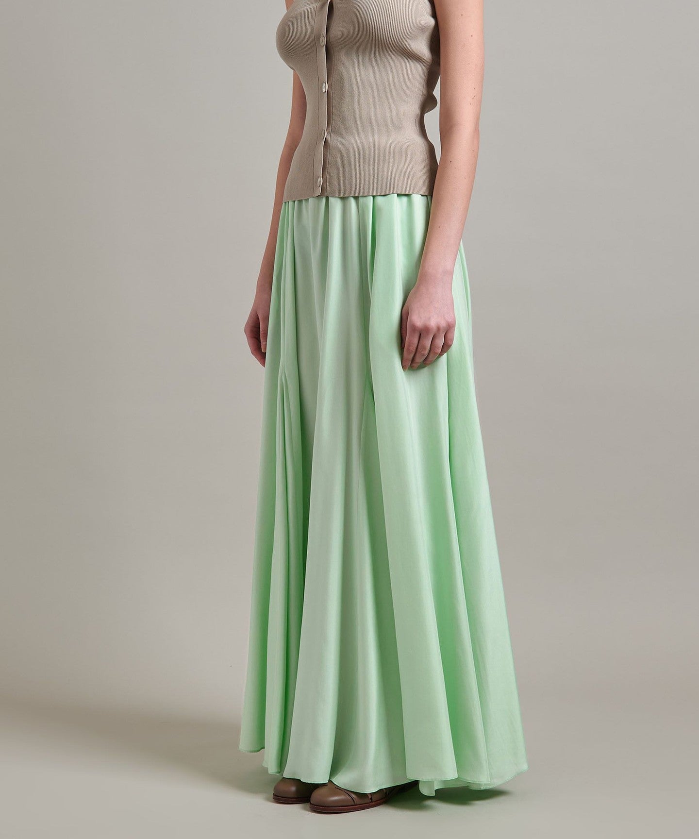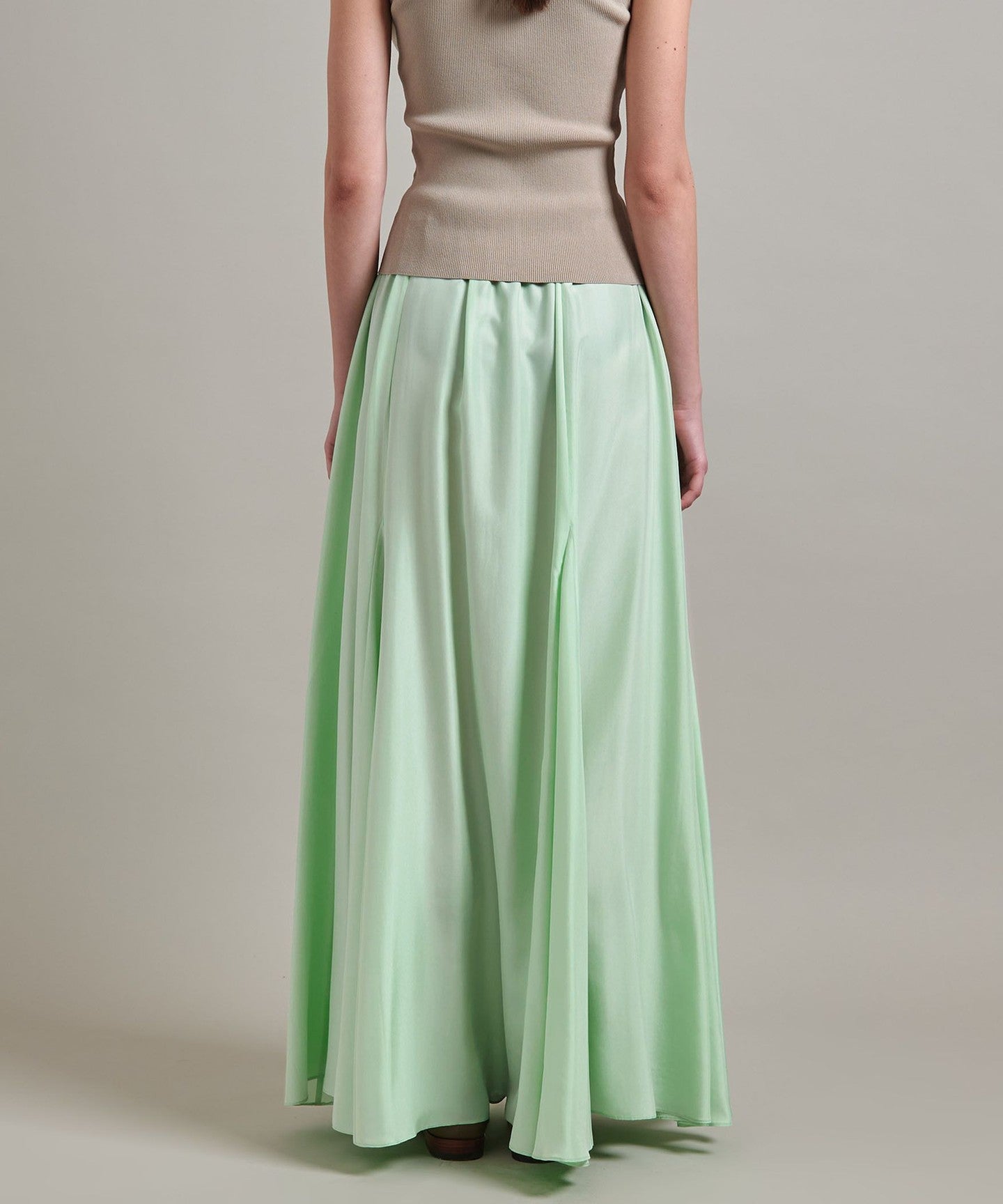 A flared skirt with a mermaid silhouette and ample volume created by panel switching.