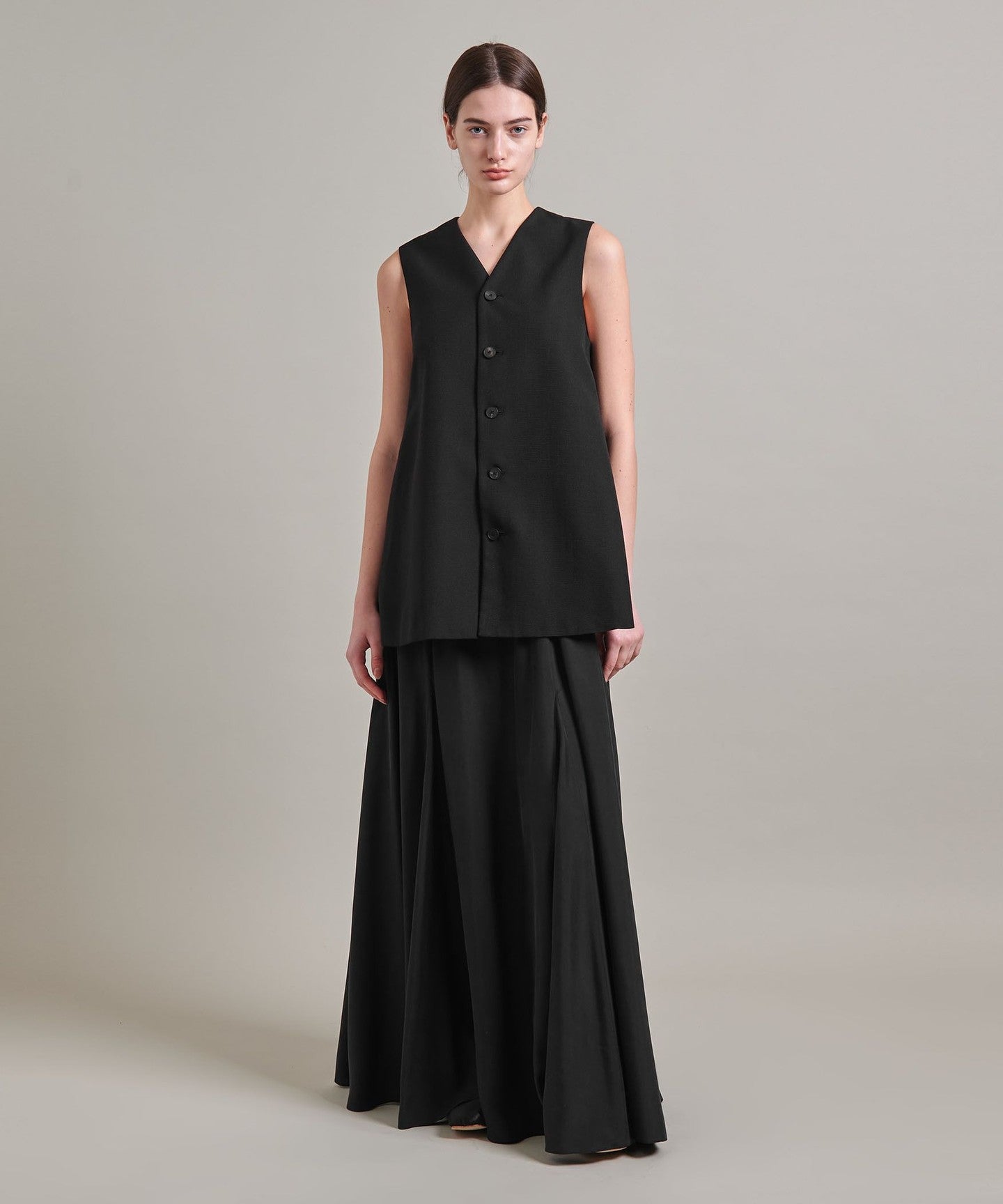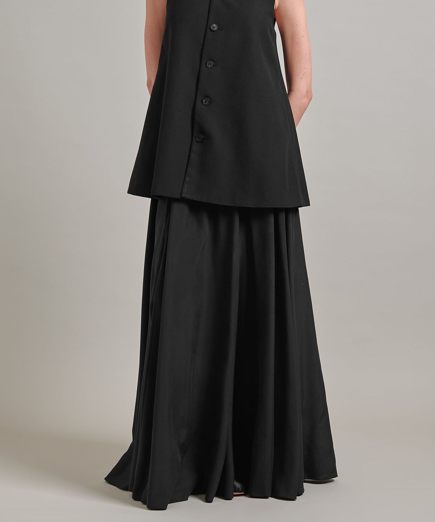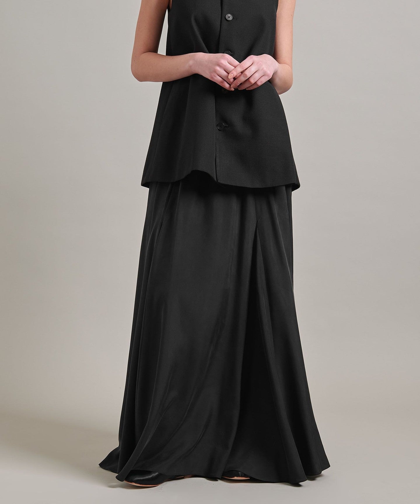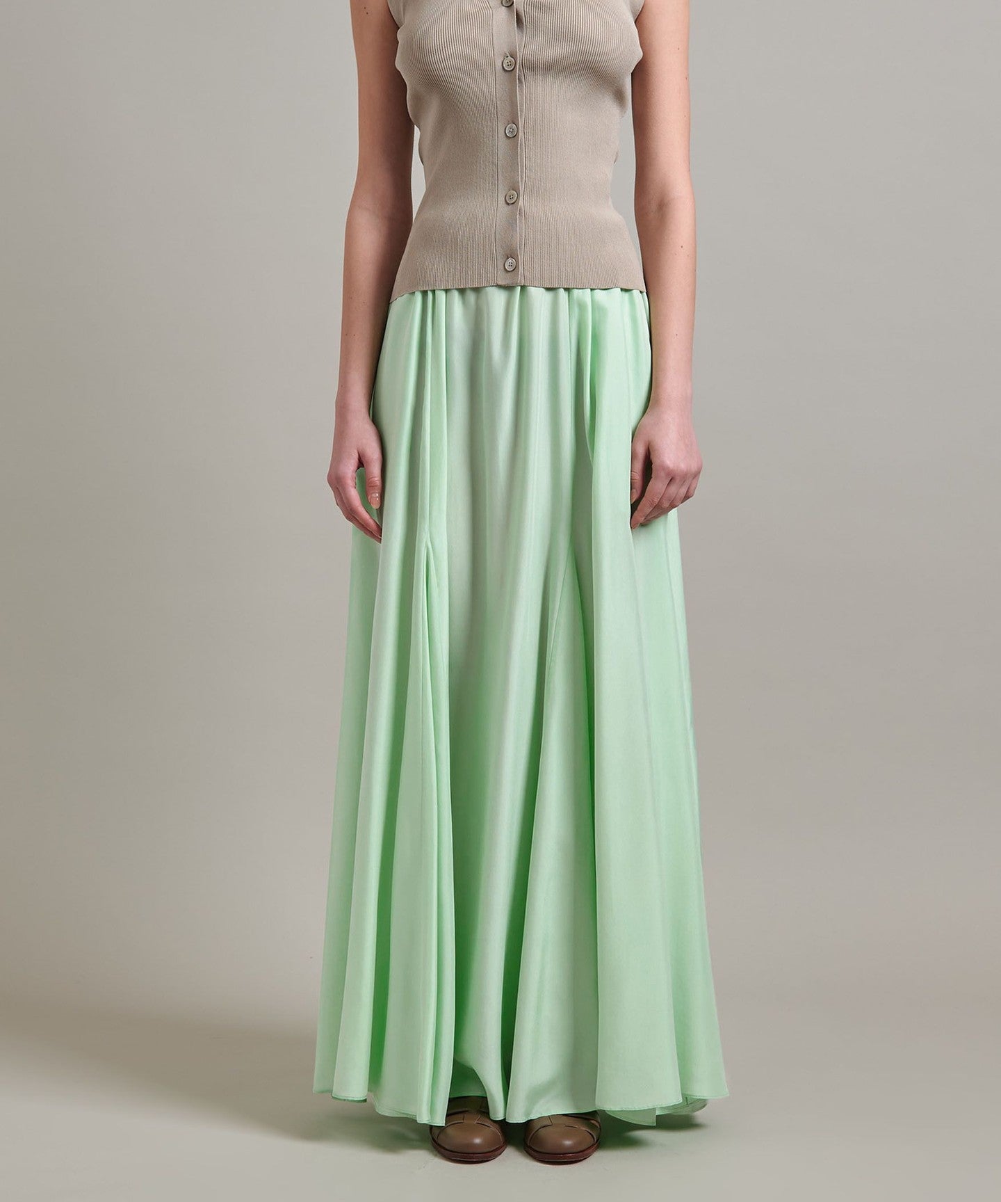 A flared skirt with a mermaid silhouette and ample volume created by panel switching.