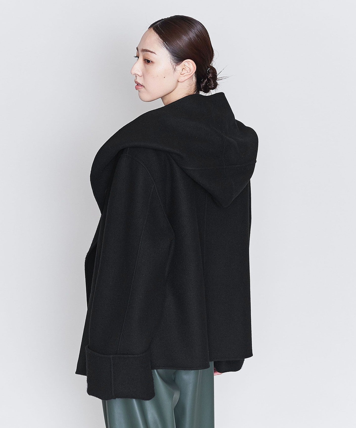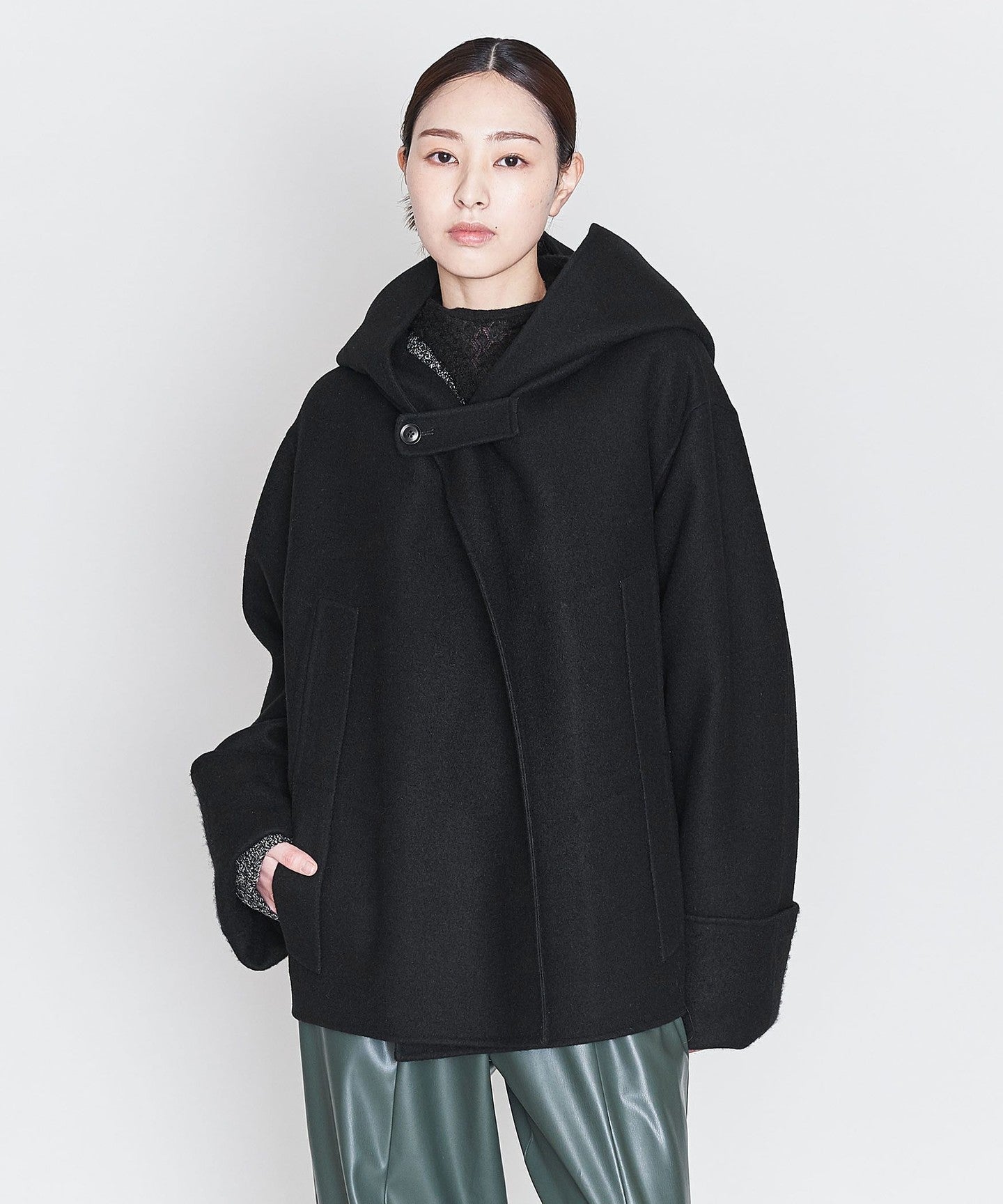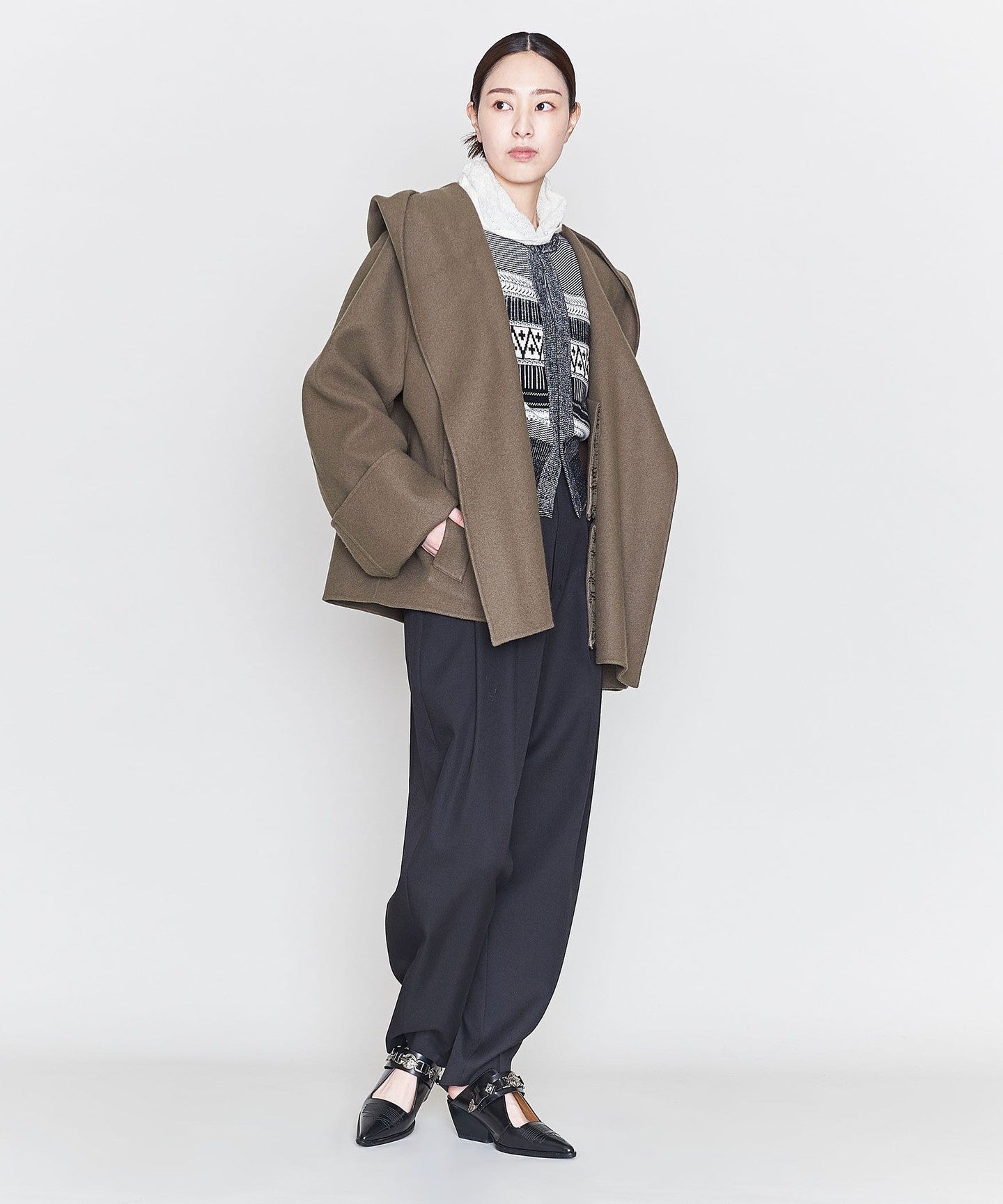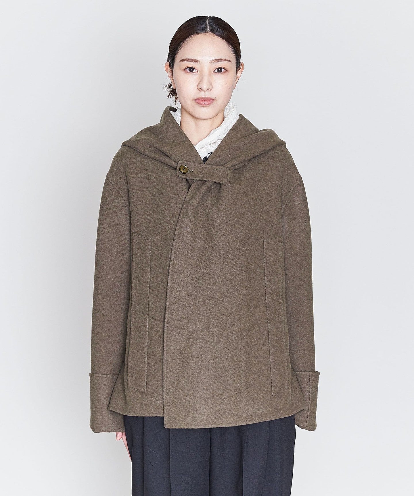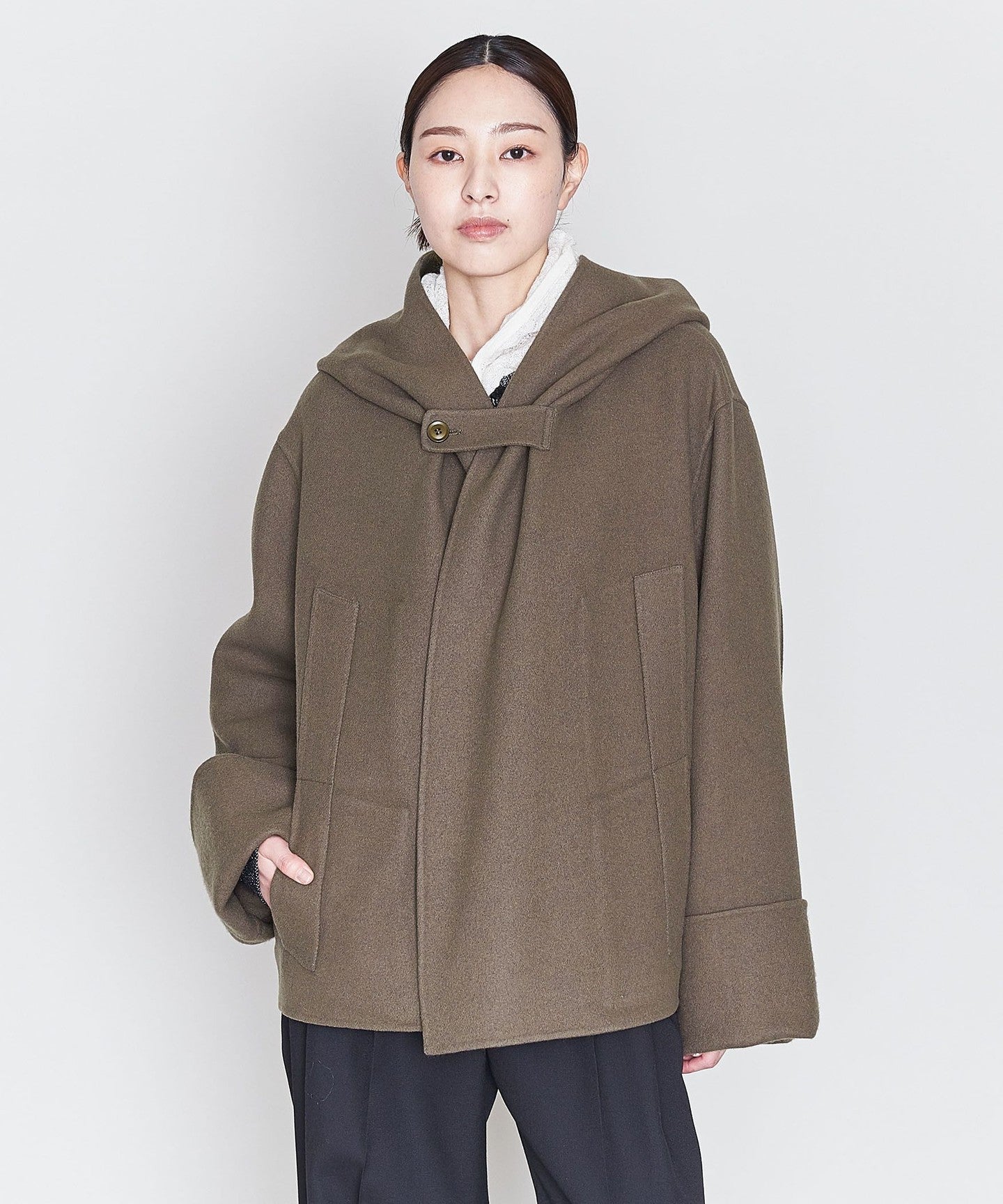 A short hooded coat with a hood that looks like a stole and a relaxed silhouette.