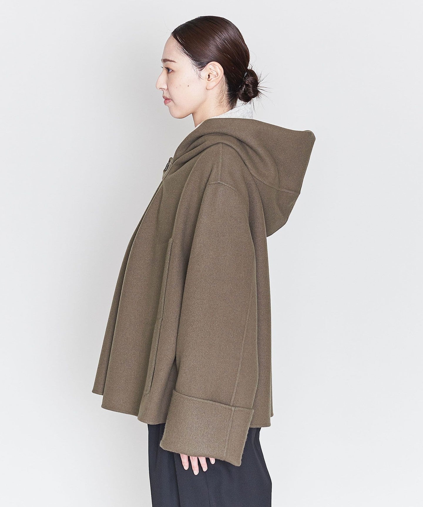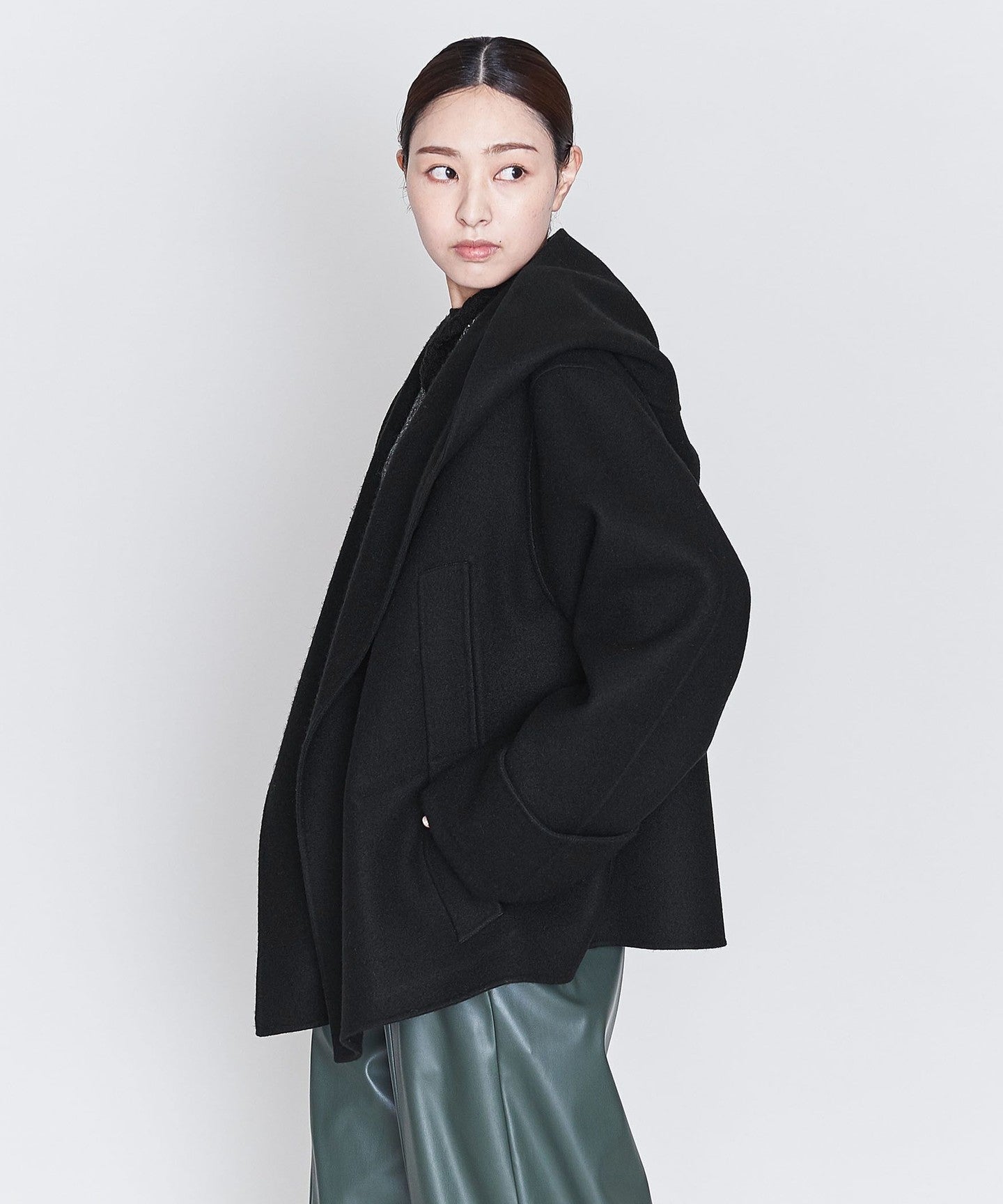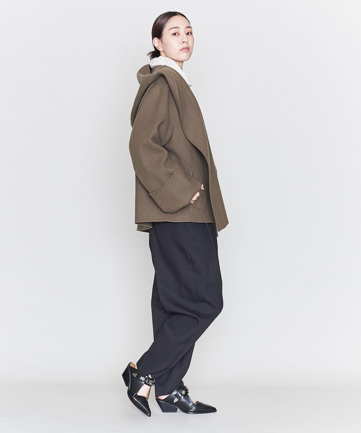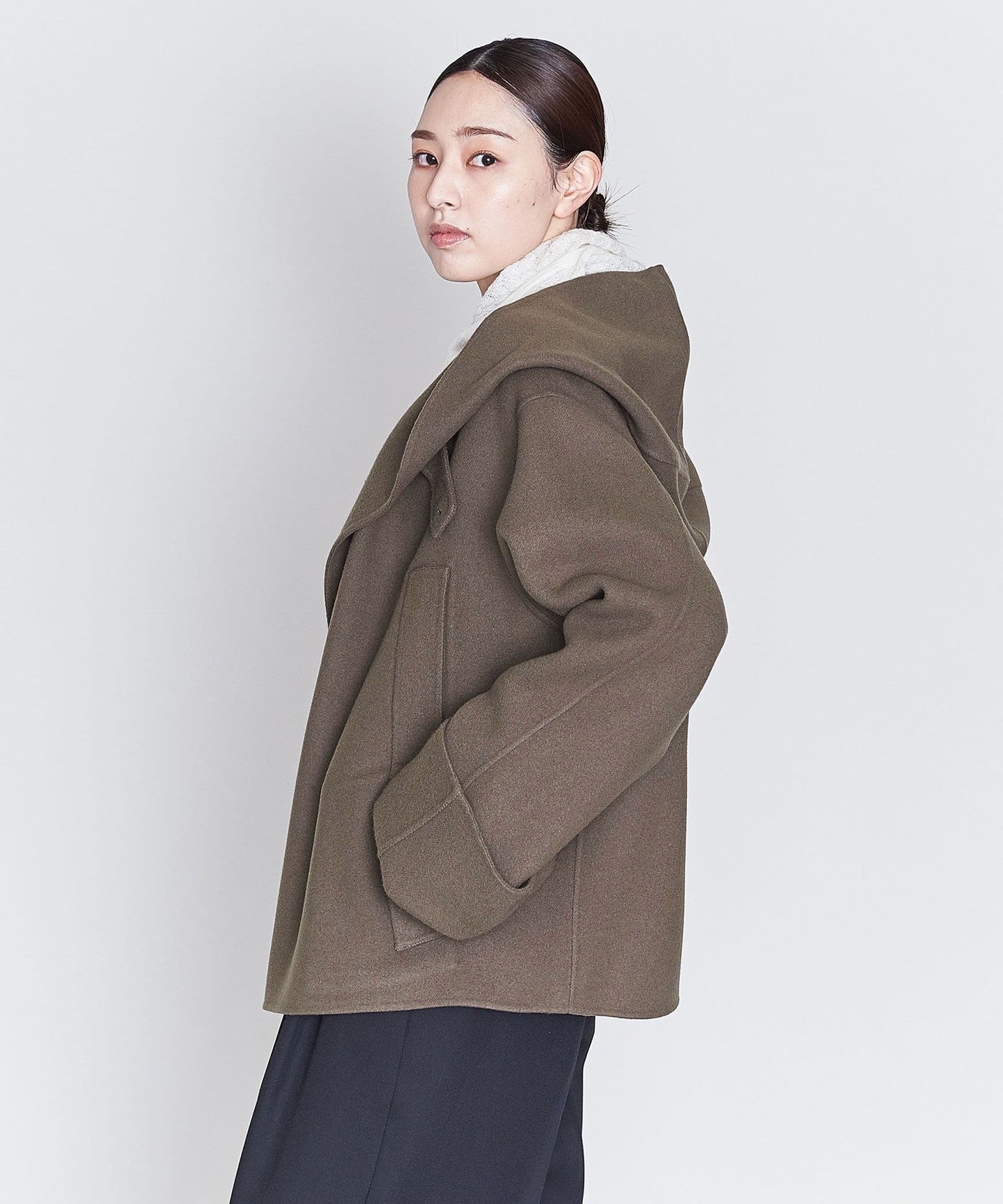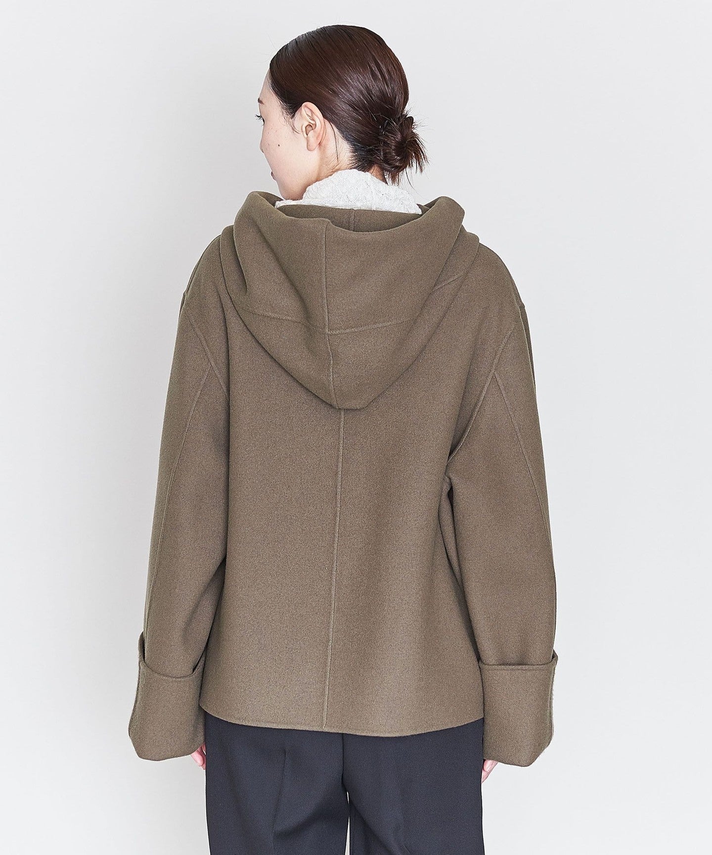 A short hooded coat with a hood that looks like a stole and a relaxed silhouette.