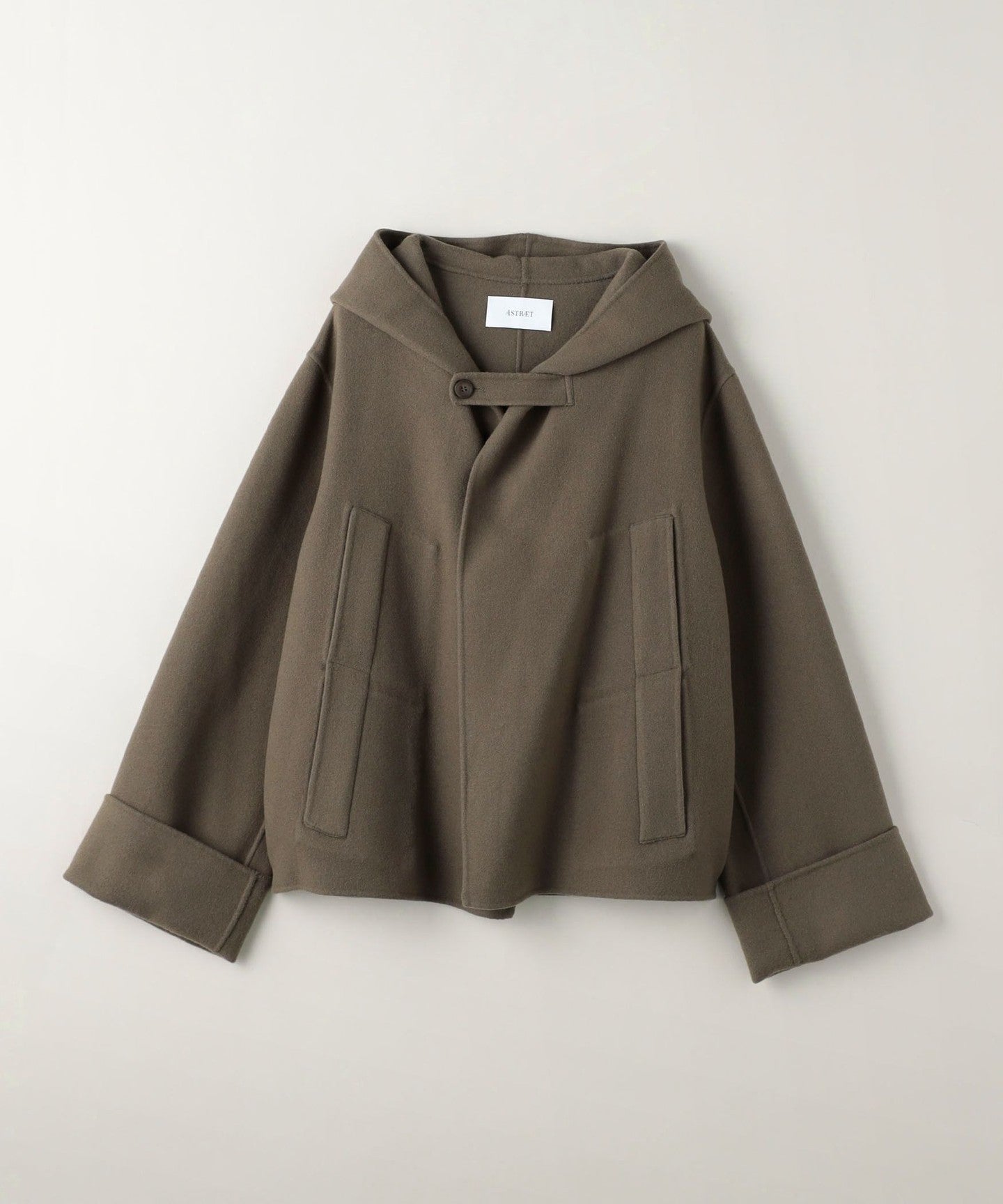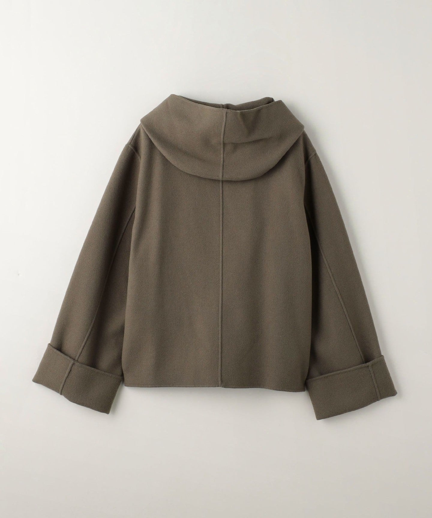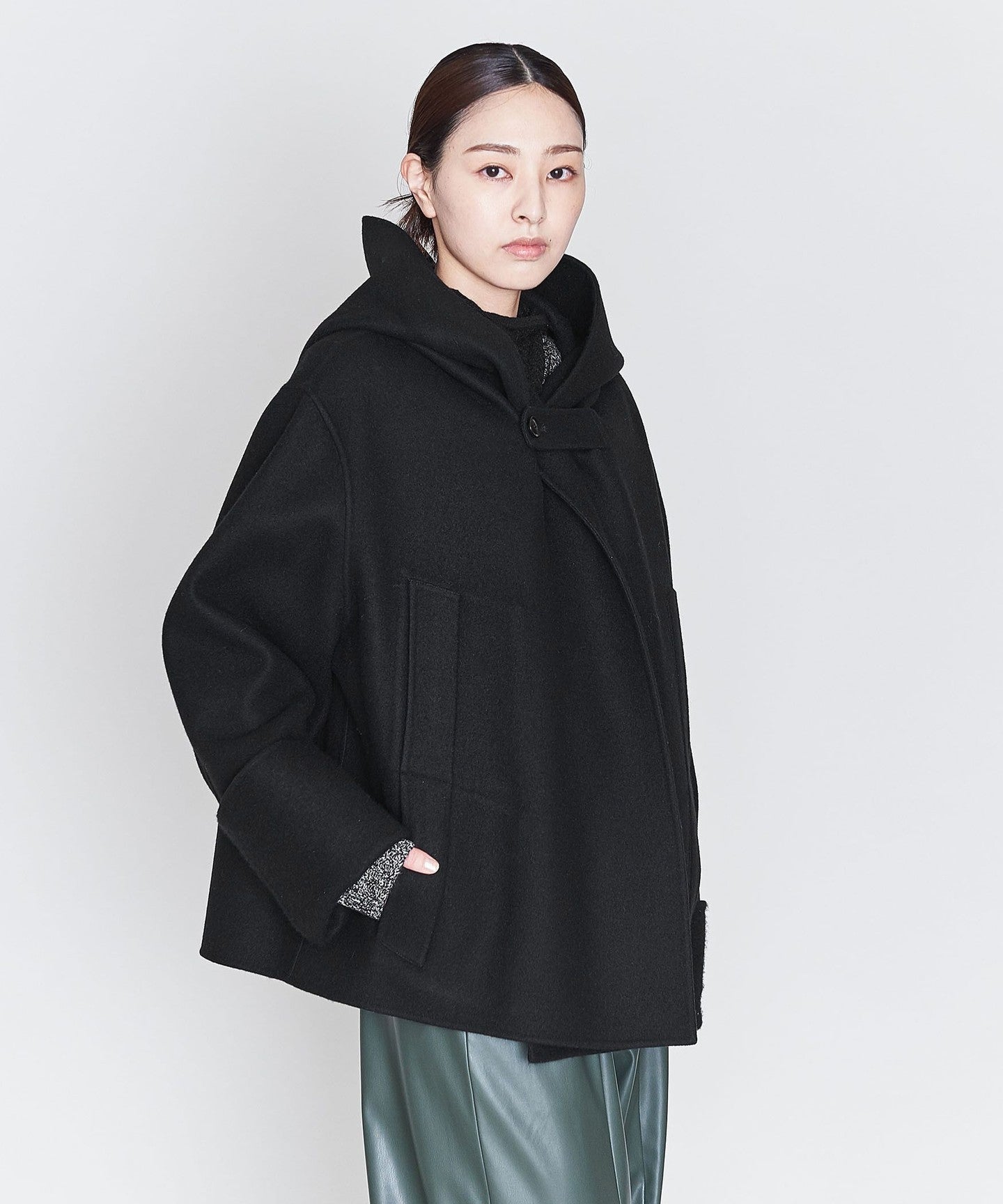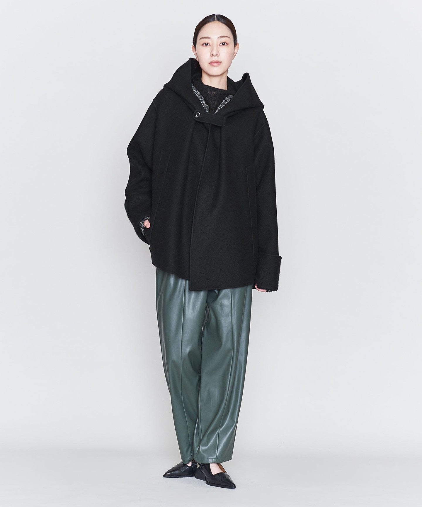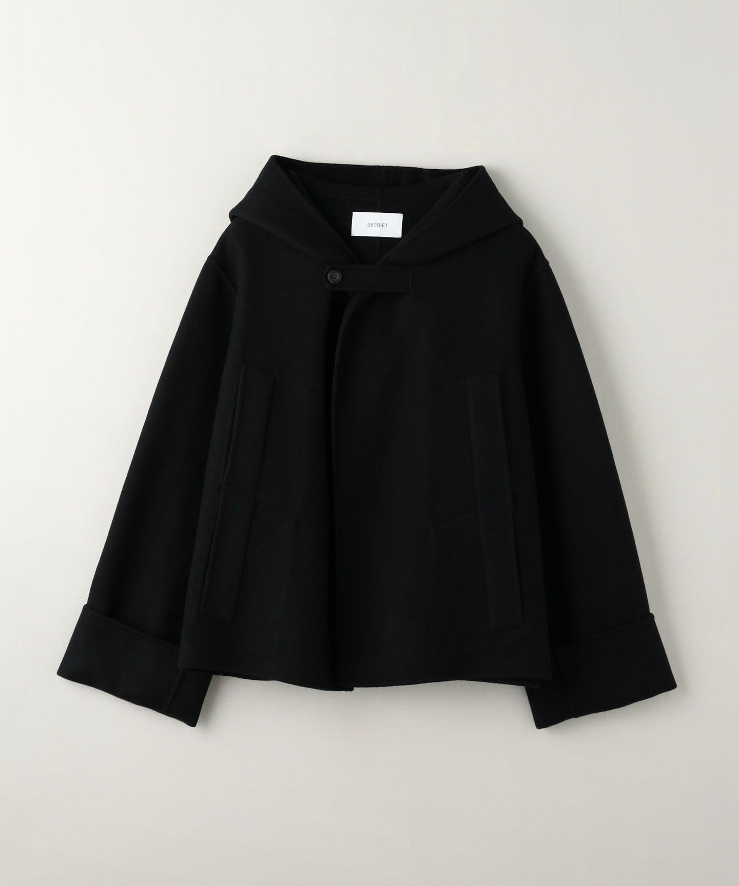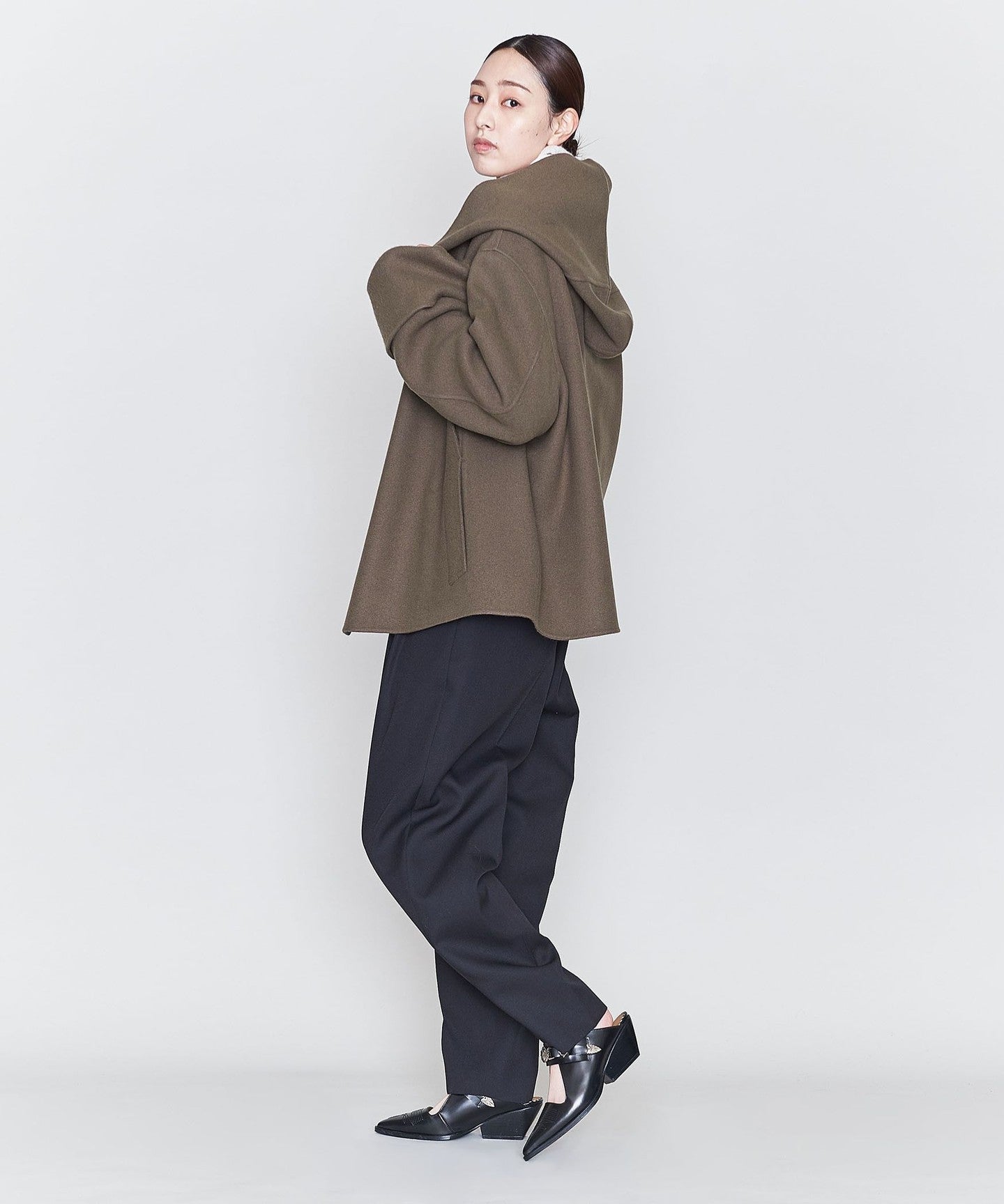 A short hooded coat with a hood that looks like a stole and a relaxed silhouette.