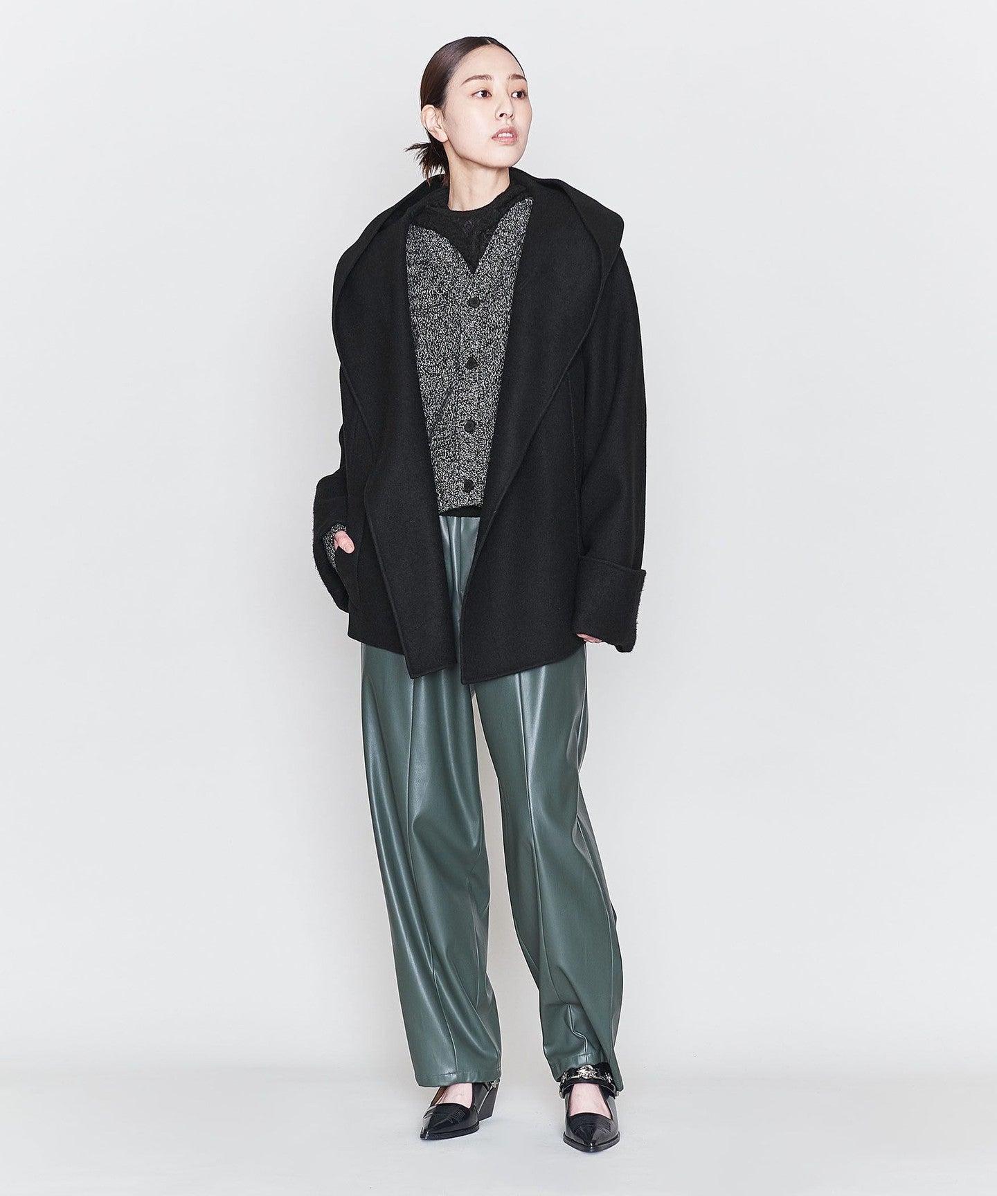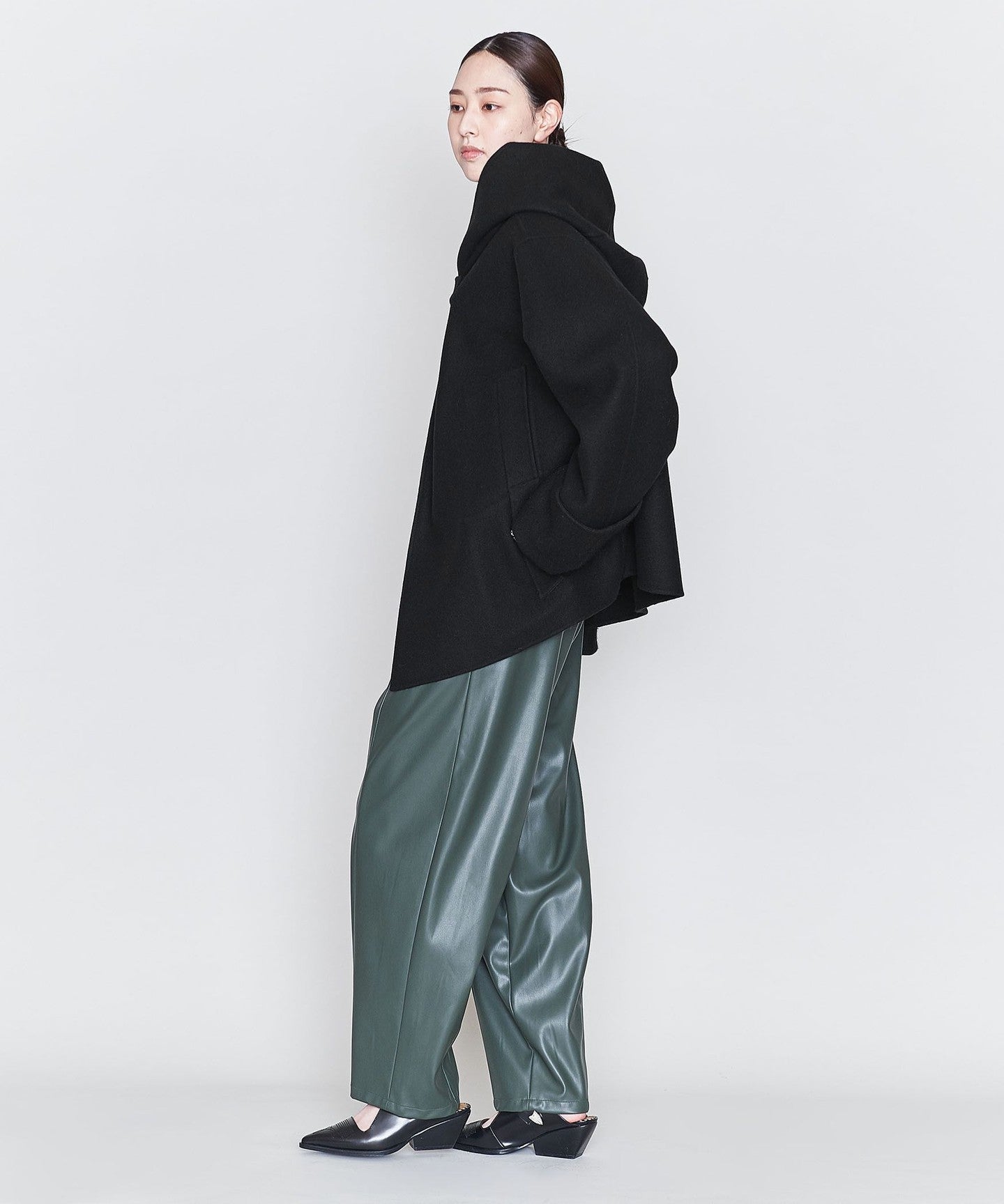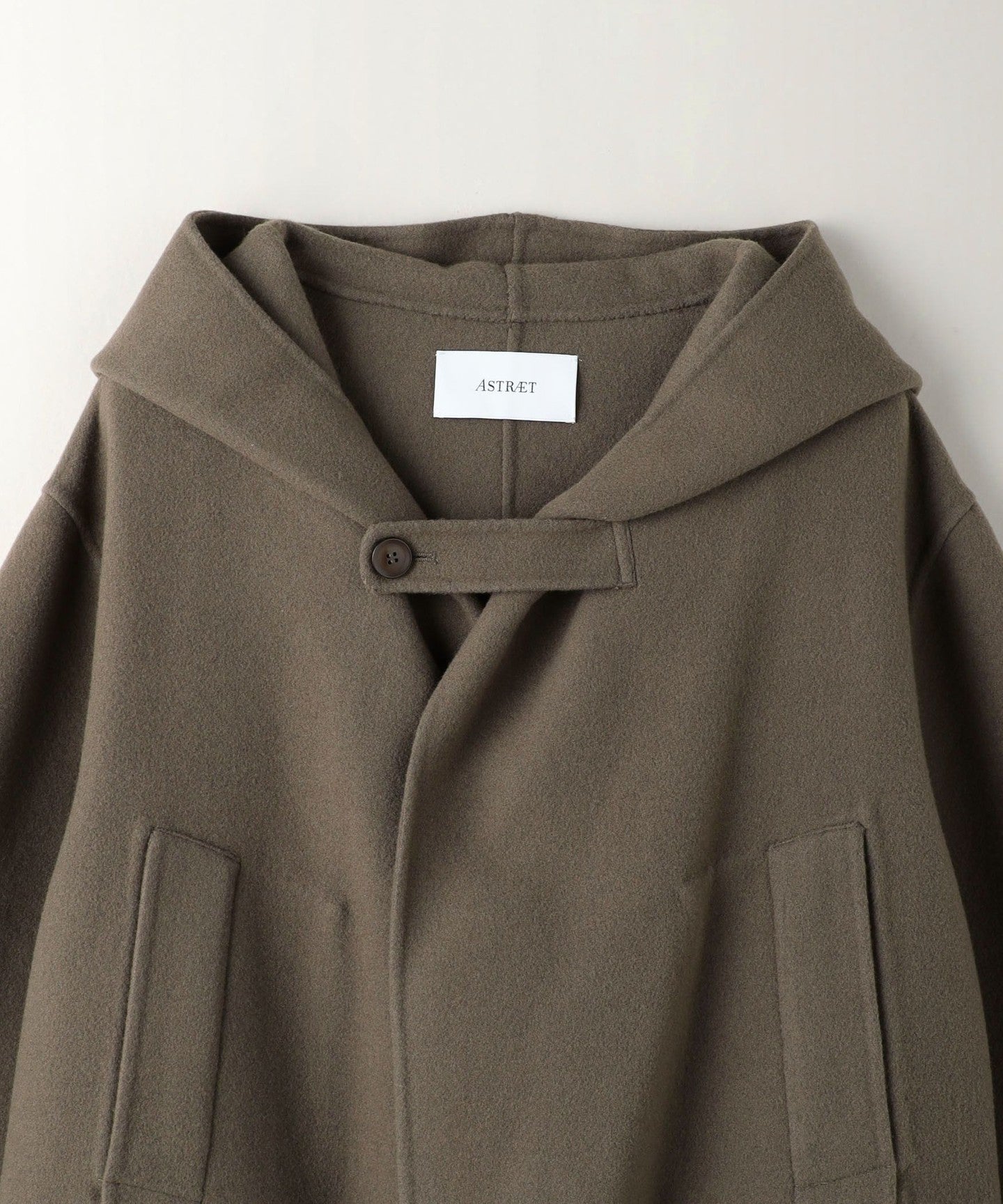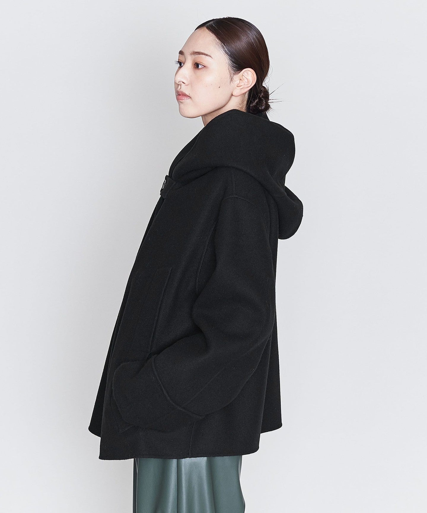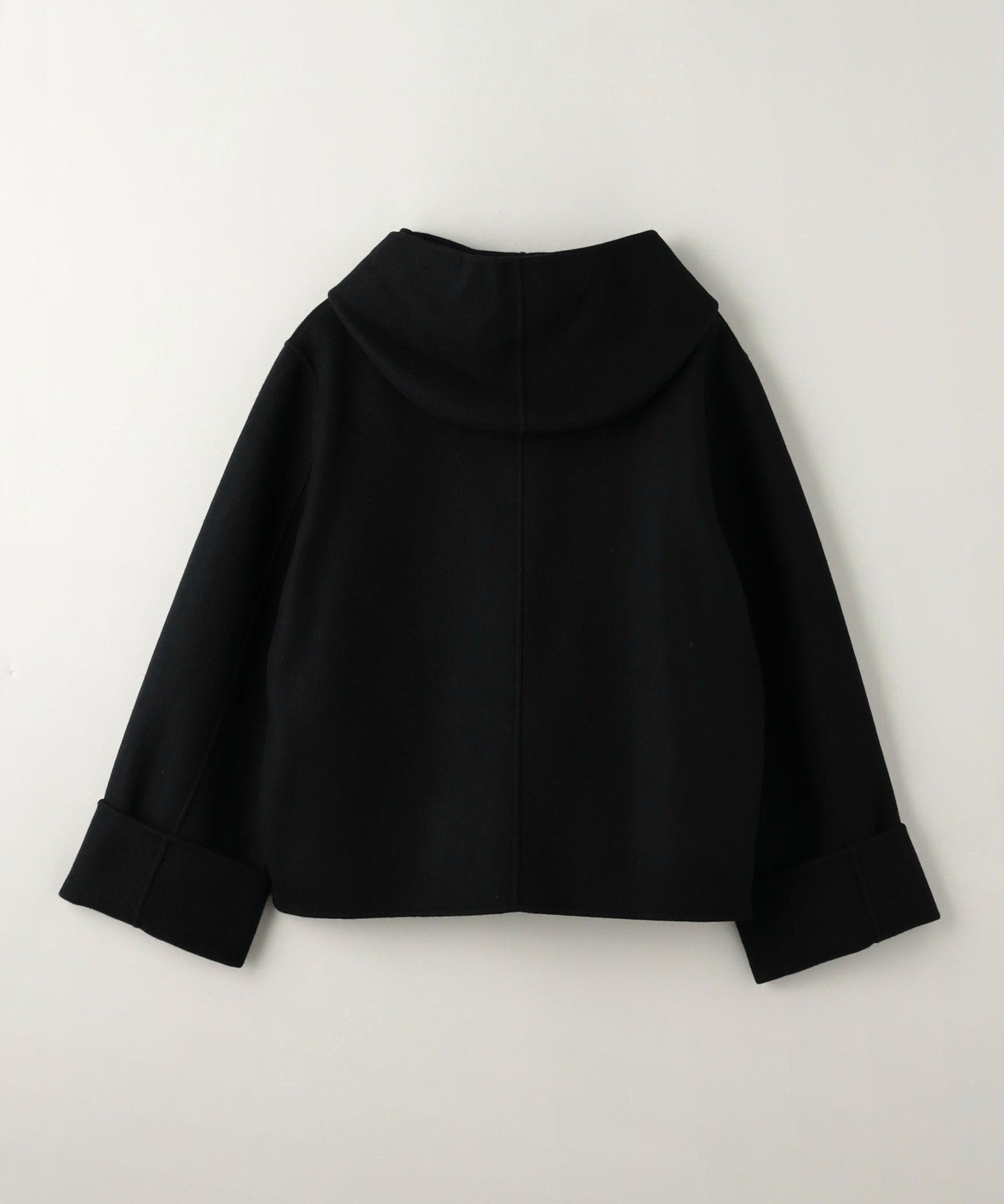A short hooded coat with a hood that looks like a stole and a relaxed silhouette.