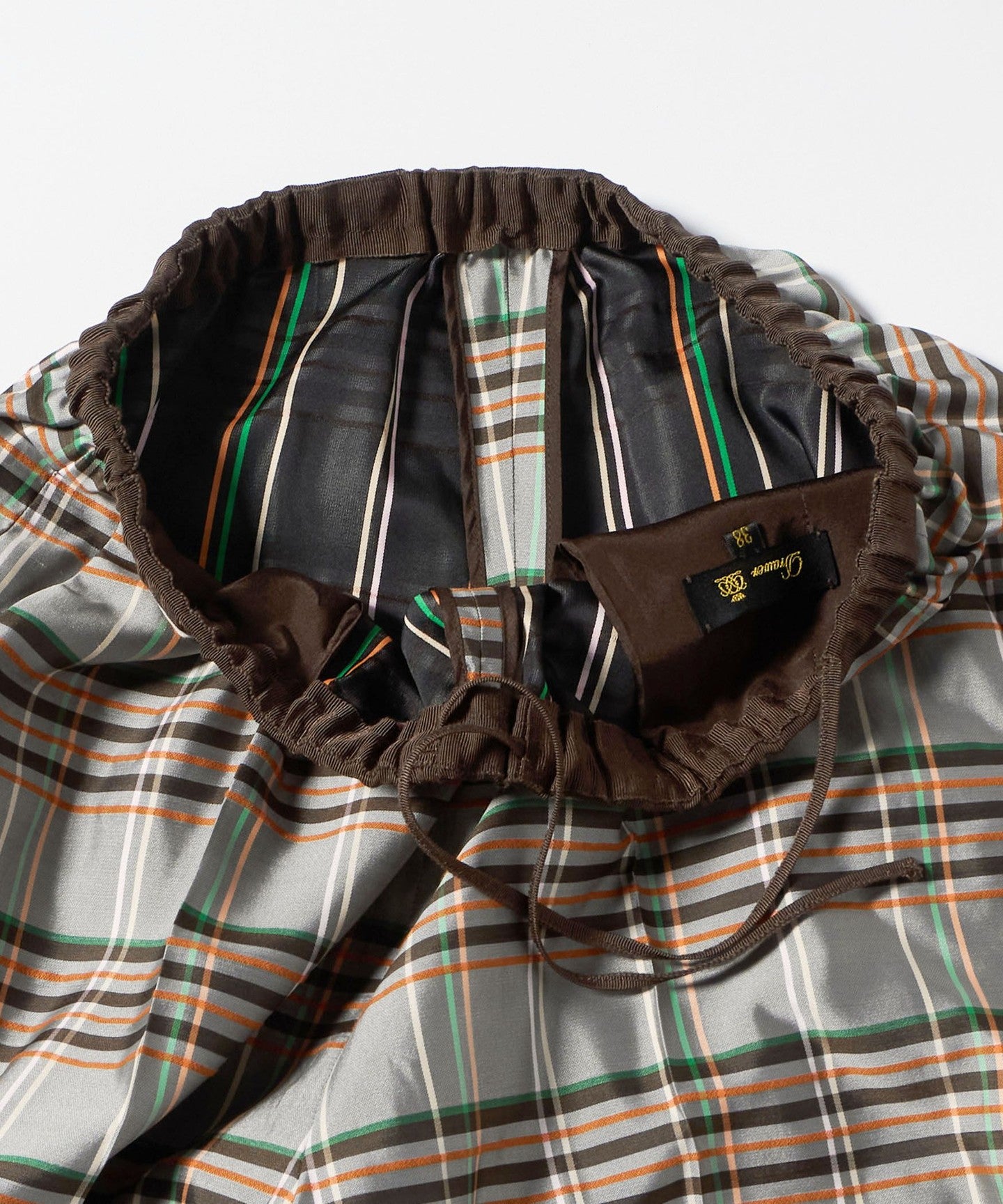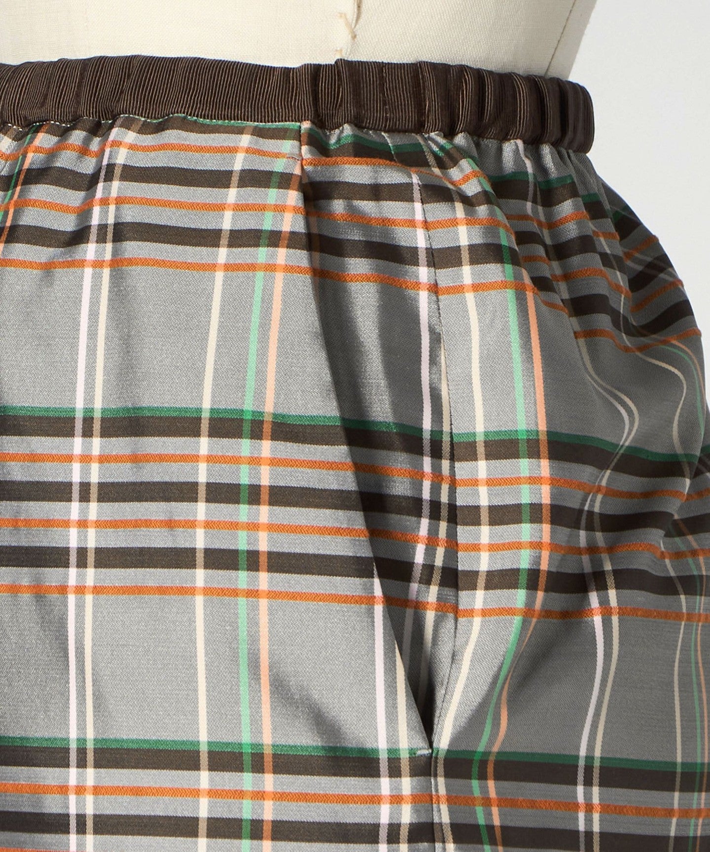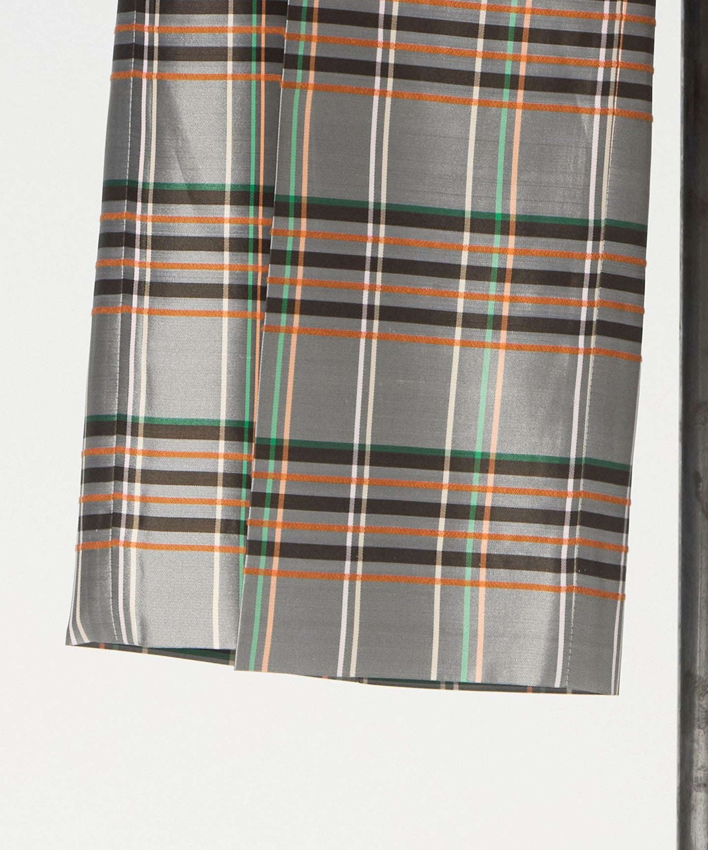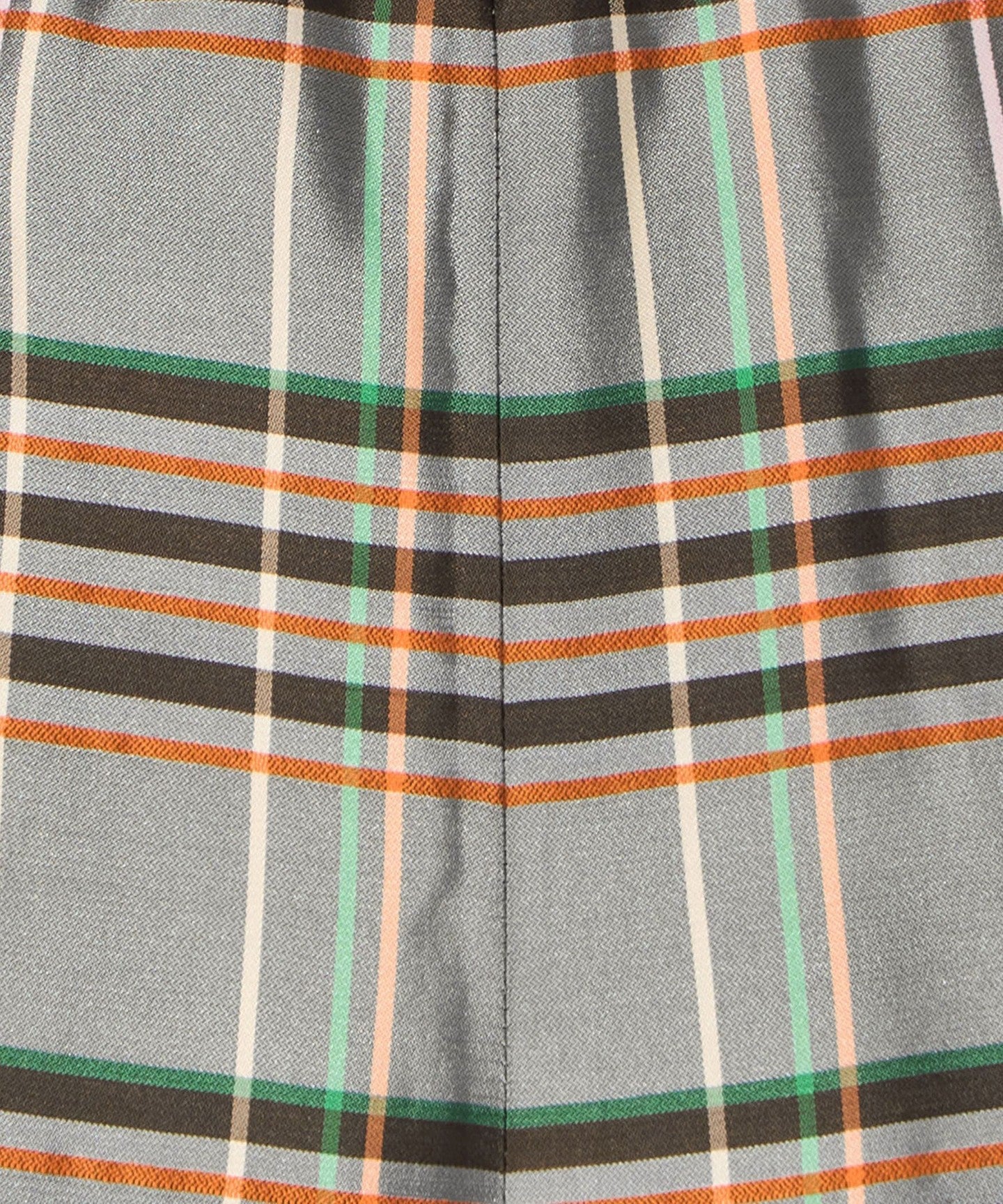 The tartan check pattern, with a light gray base and accent colors such as orange and pink, creates a traditional style.