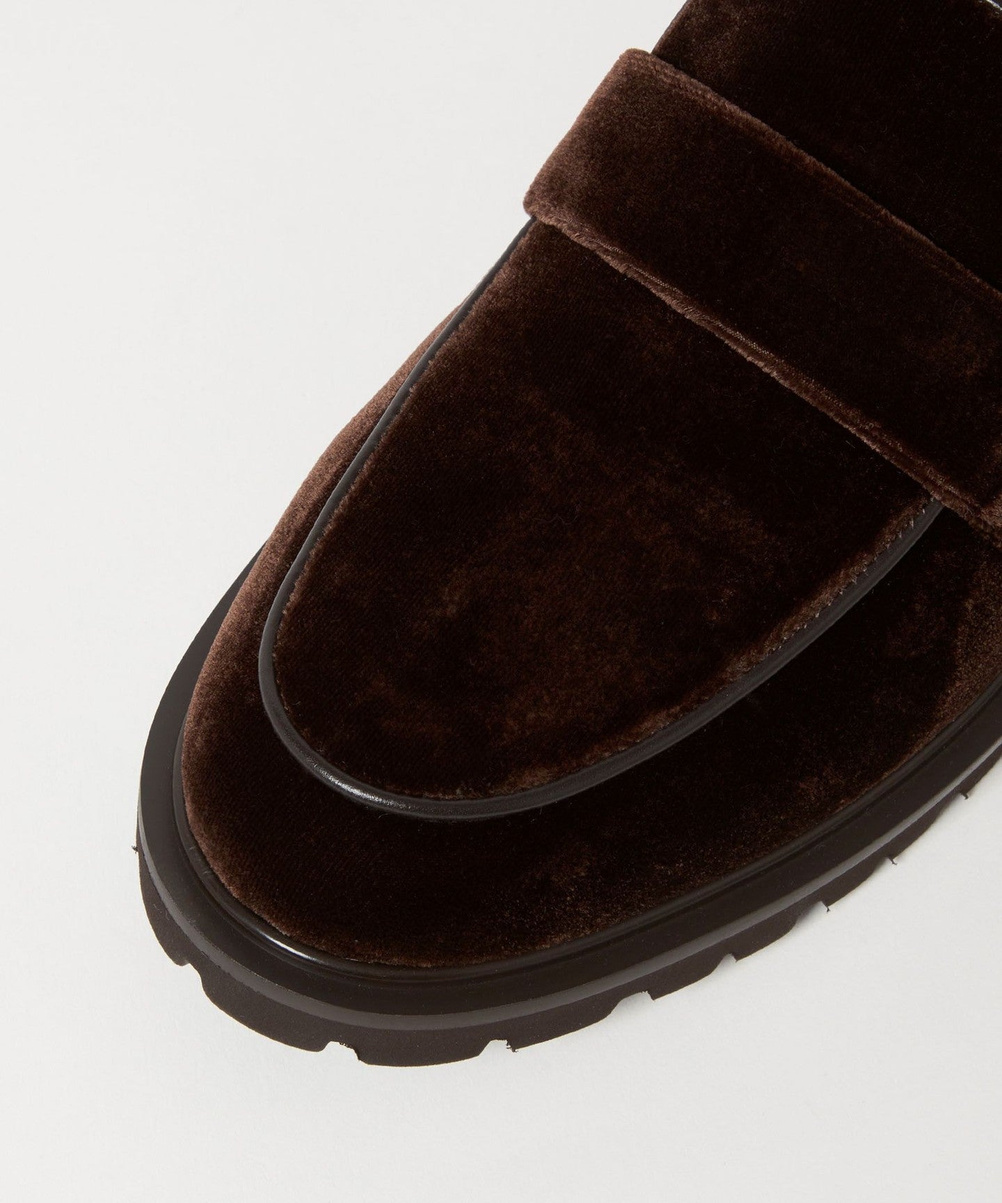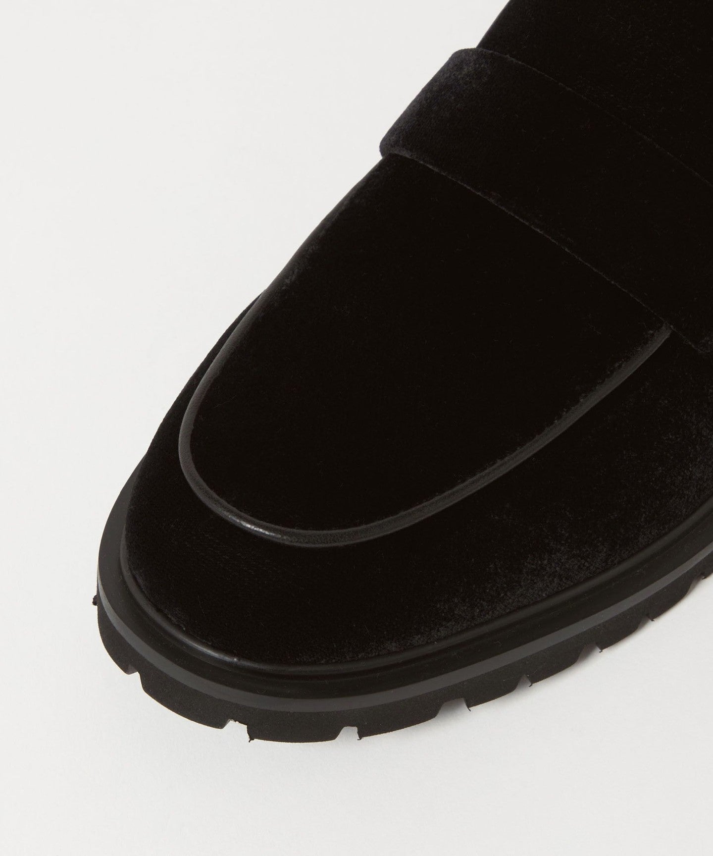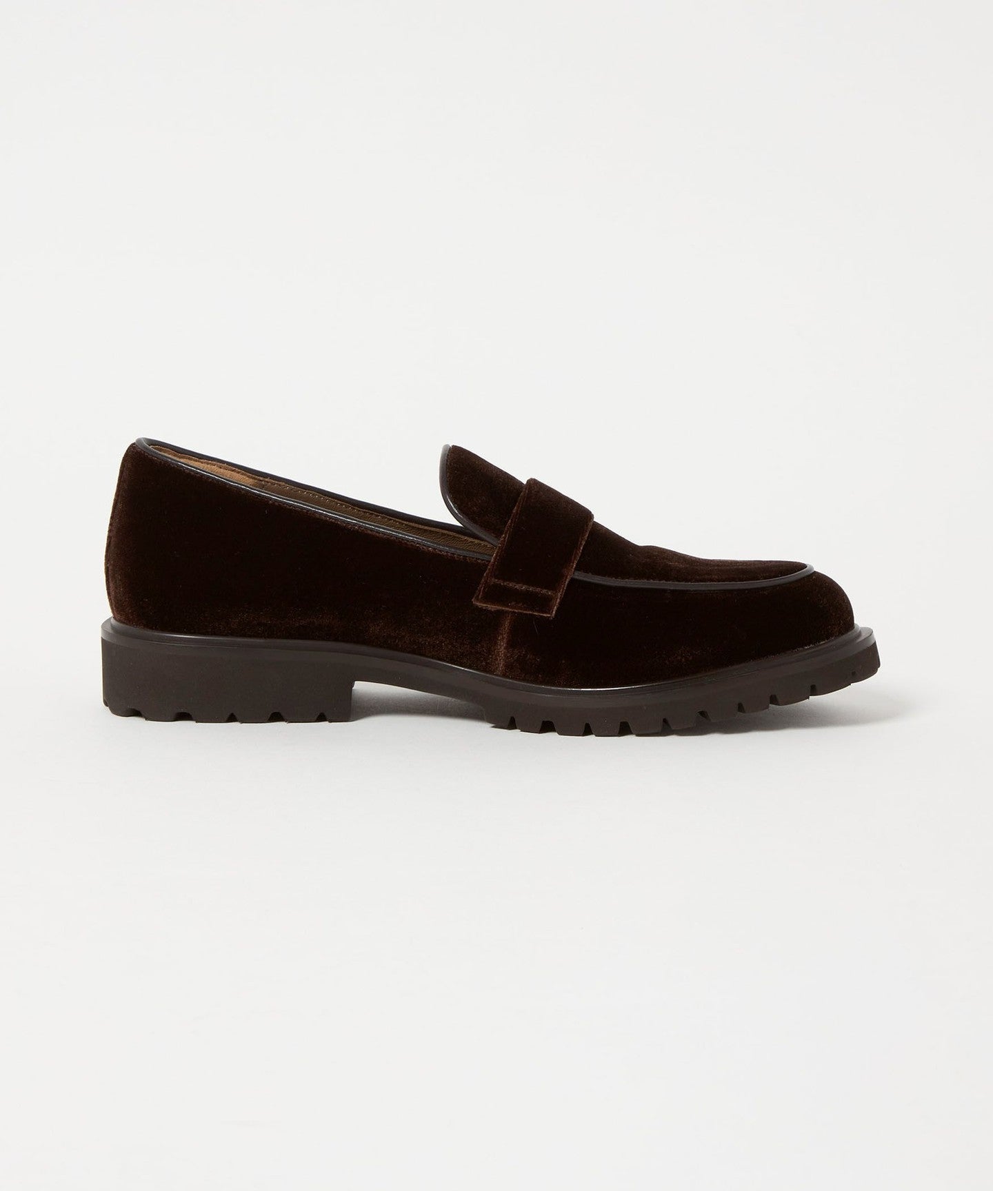 These casual flats combine an authentic loafer design with velvet fabric and a subtle tank sole, adding a touch of elegance and playfulness.