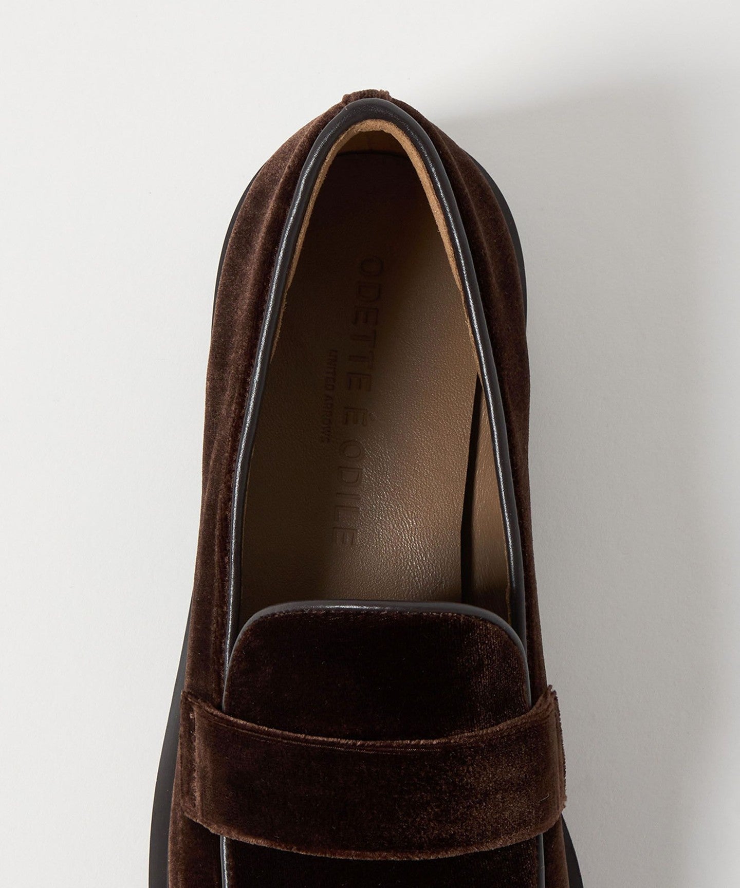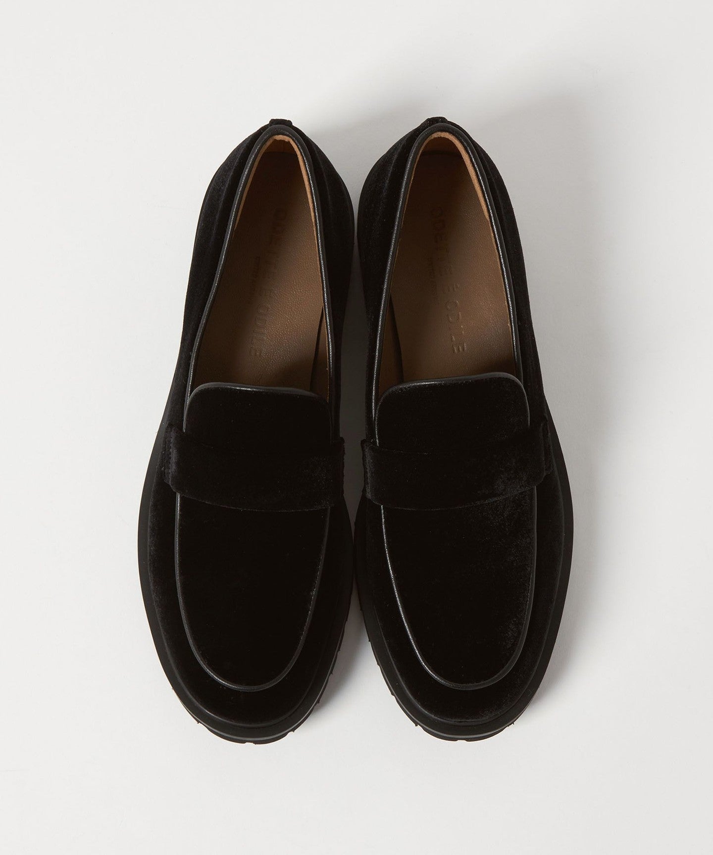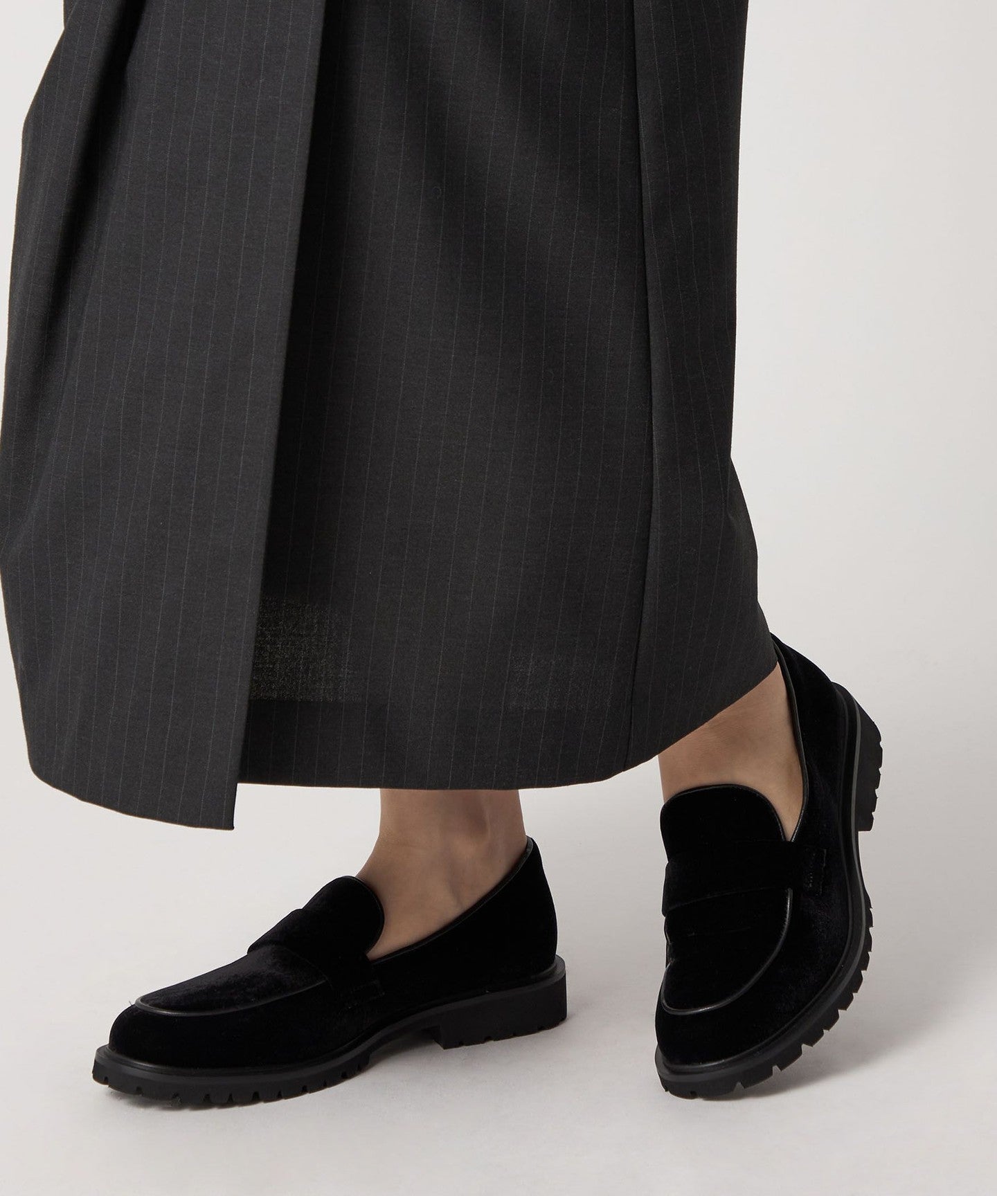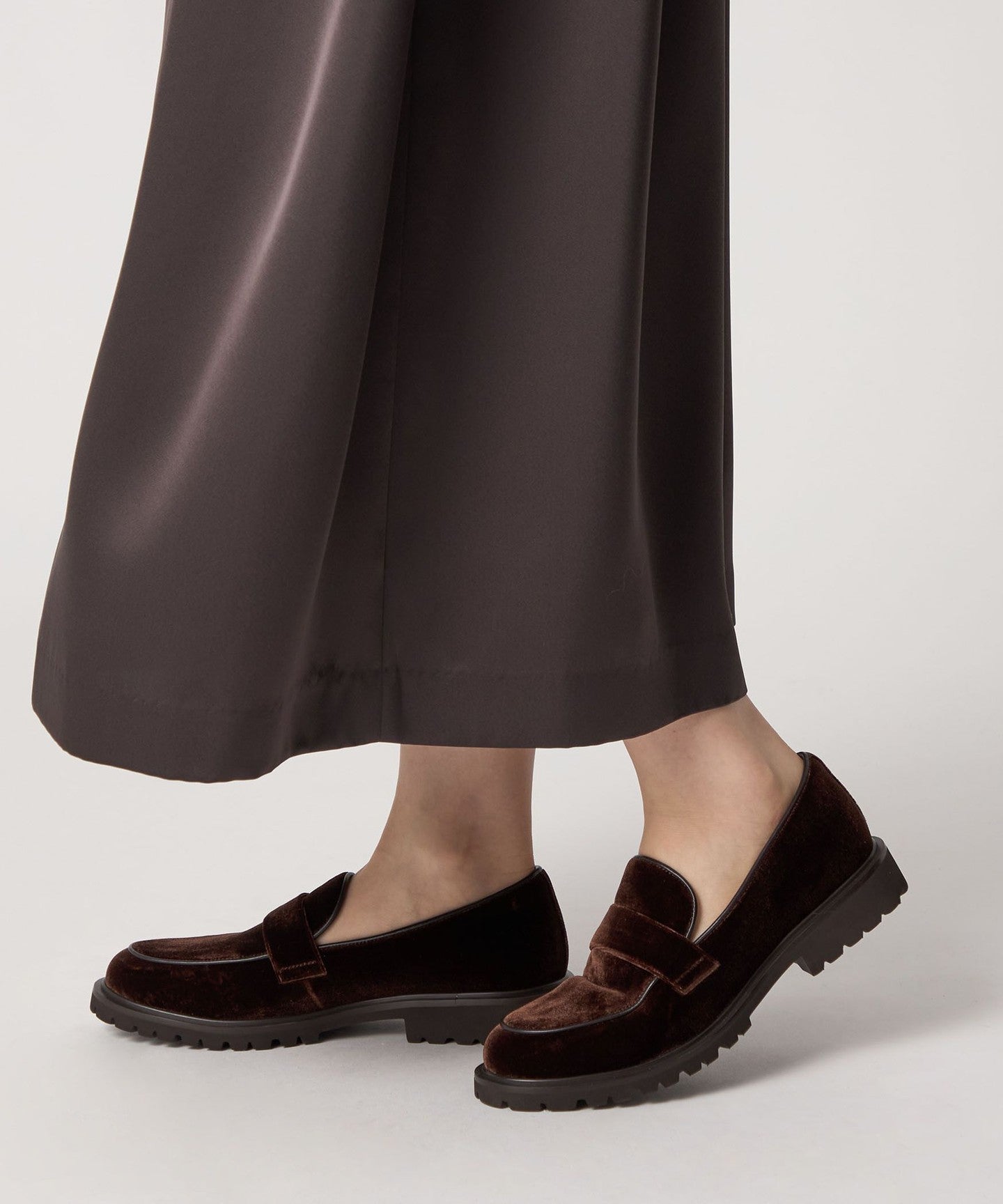 These casual flats combine an authentic loafer design with velvet fabric and a subtle tank sole, adding a touch of elegance and playfulness.