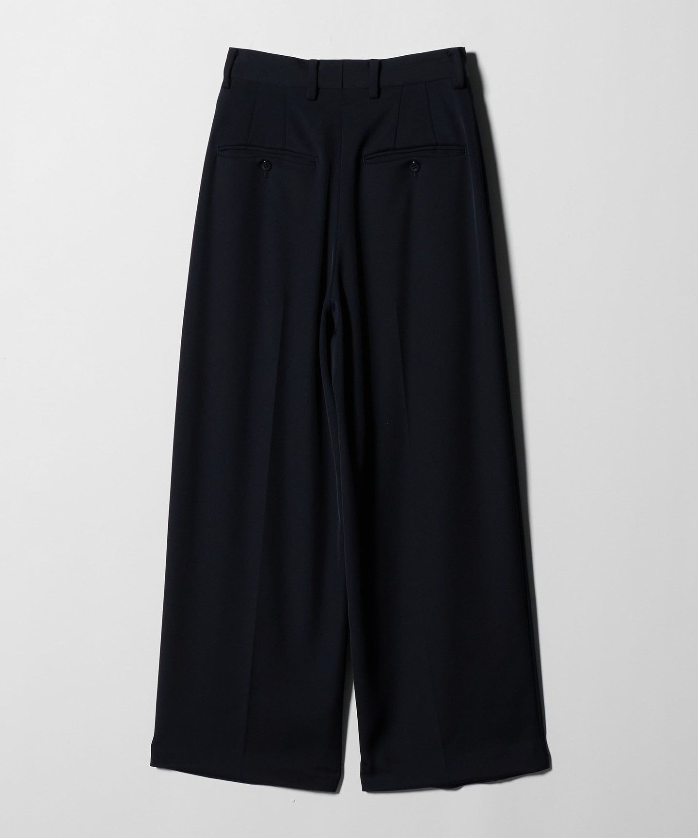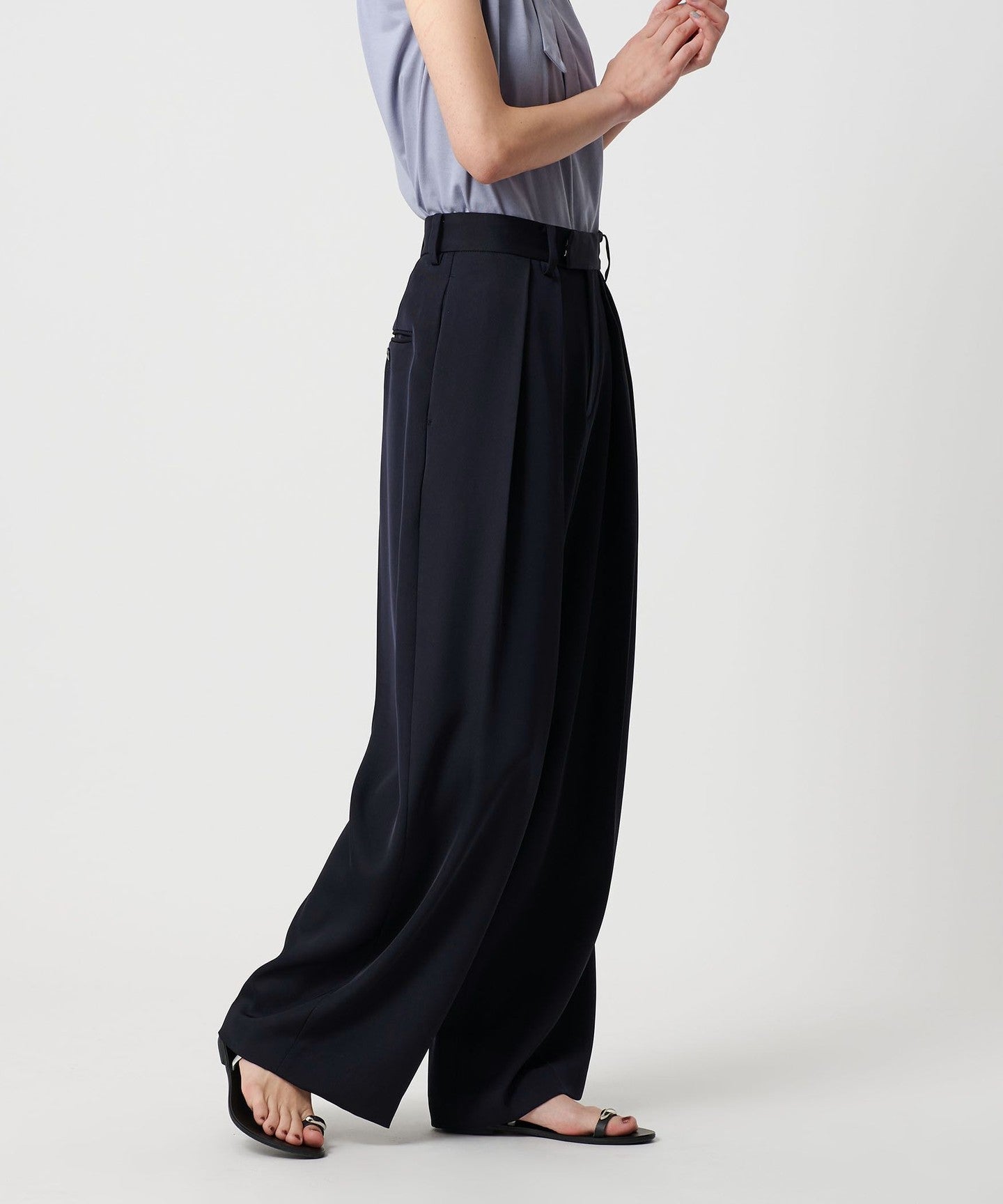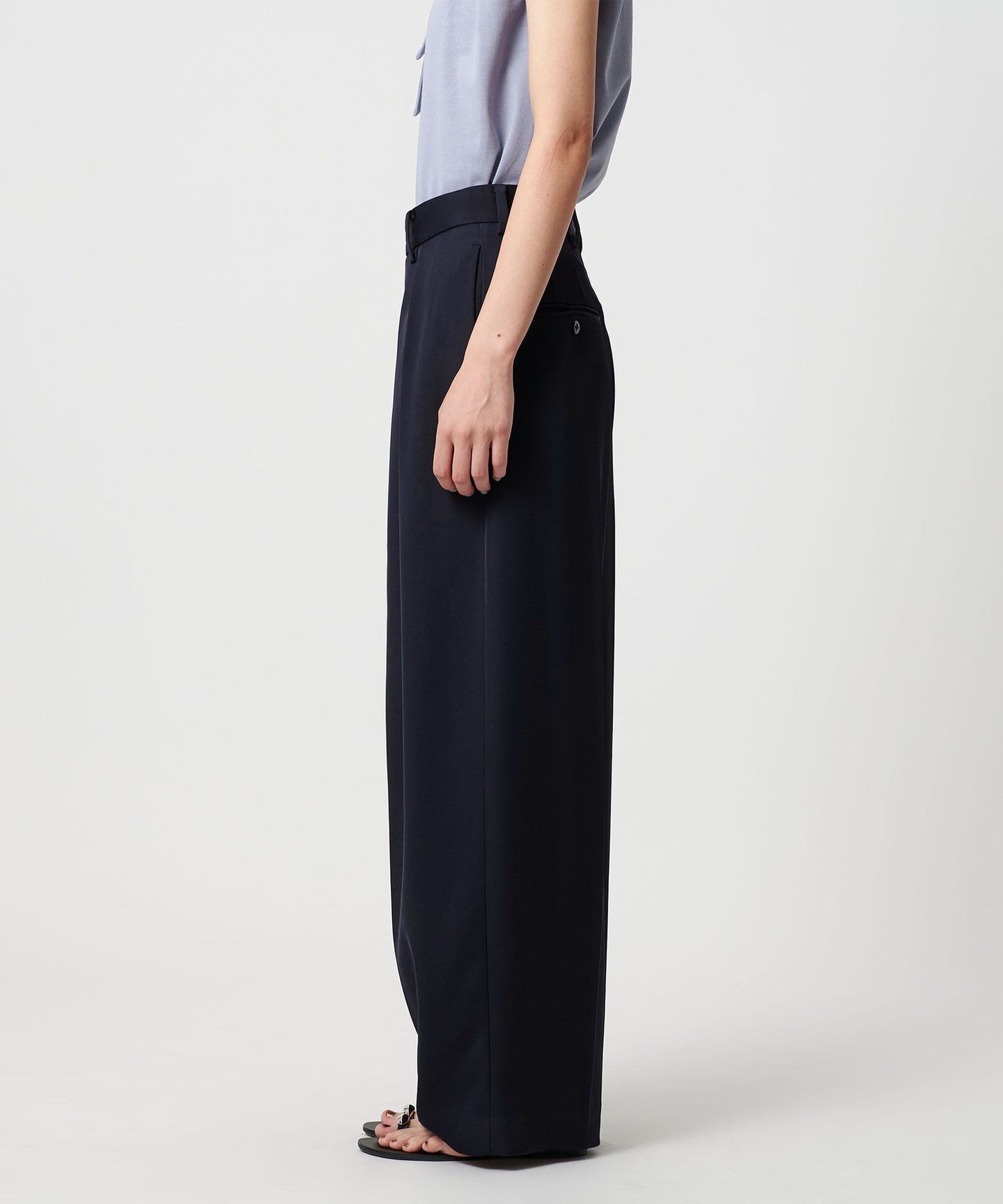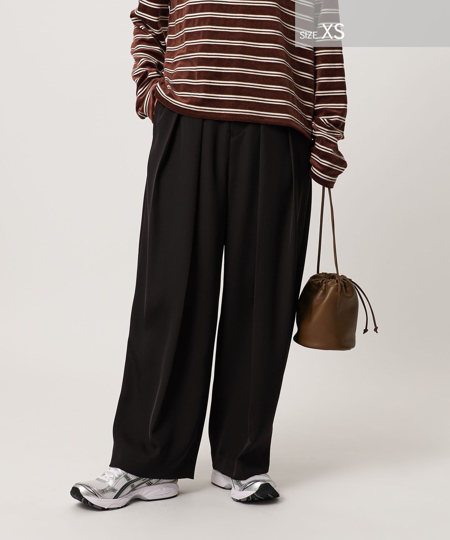 Wide silhouette pants with two deep pleats made from fabric with a moderate drape.