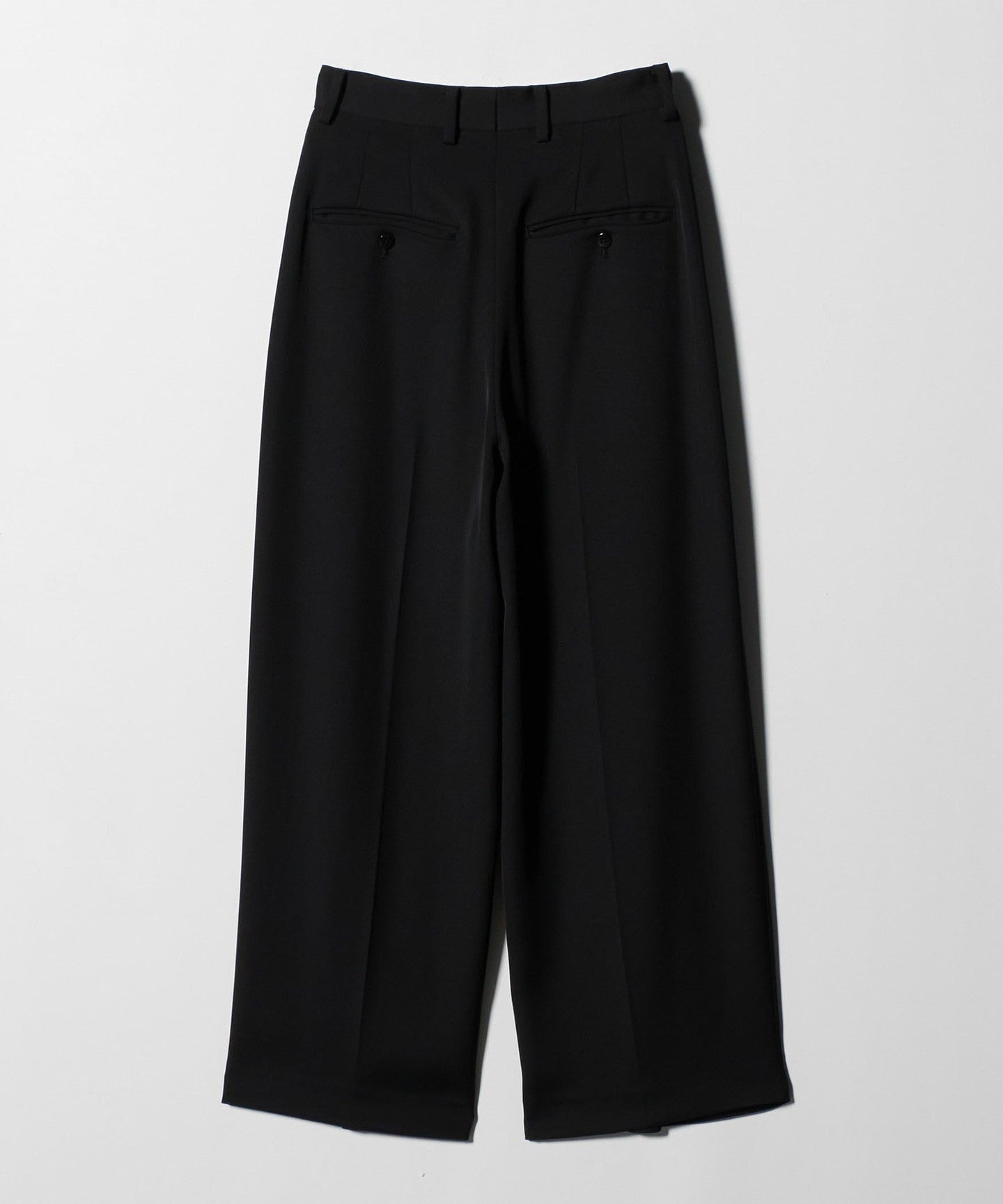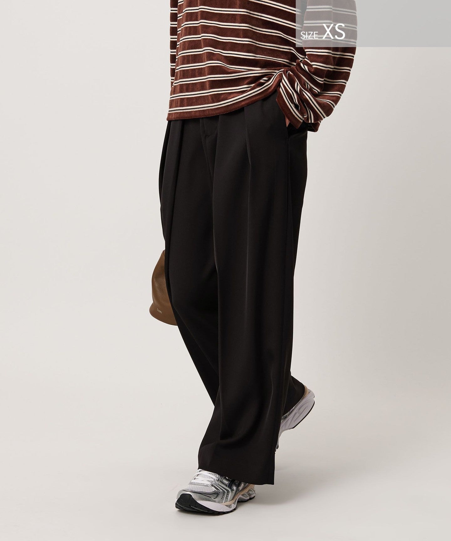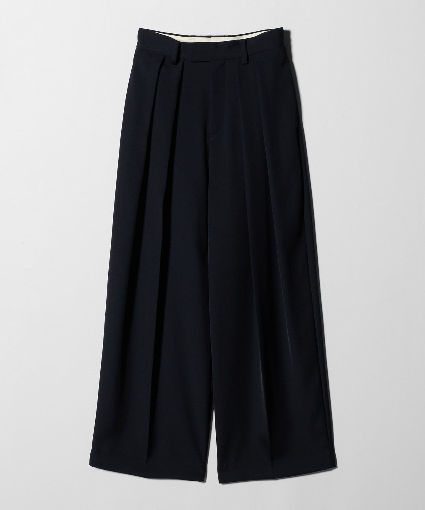 Wide silhouette pants with two deep pleats made from fabric with a moderate drape.