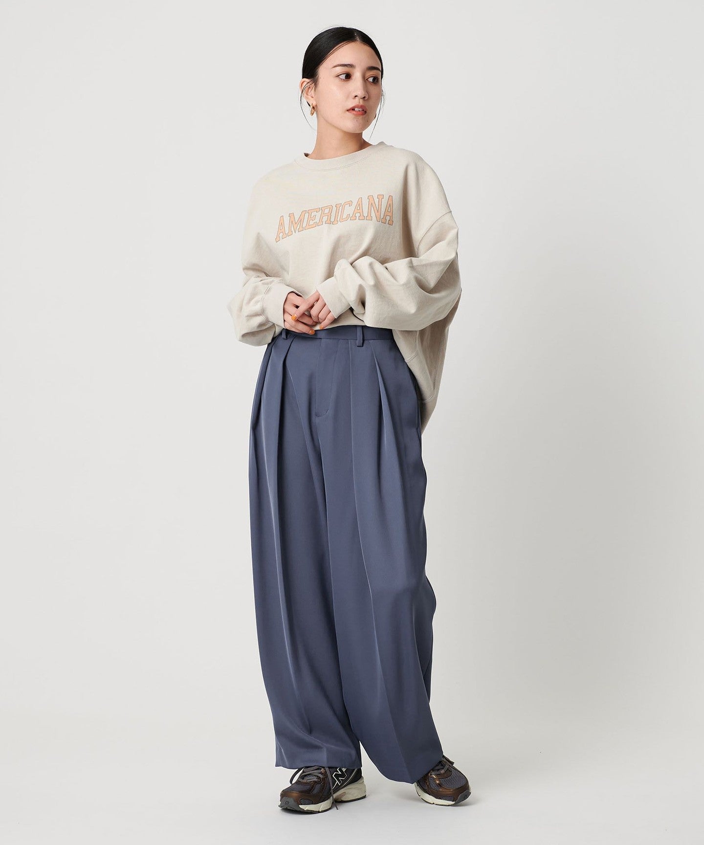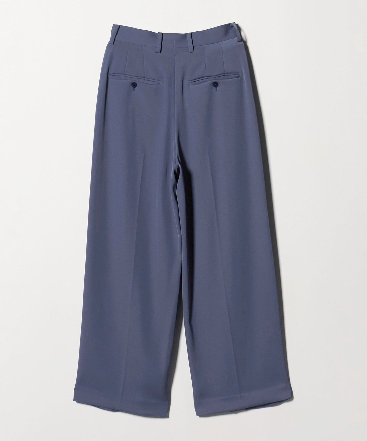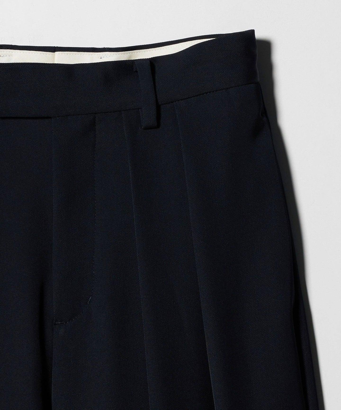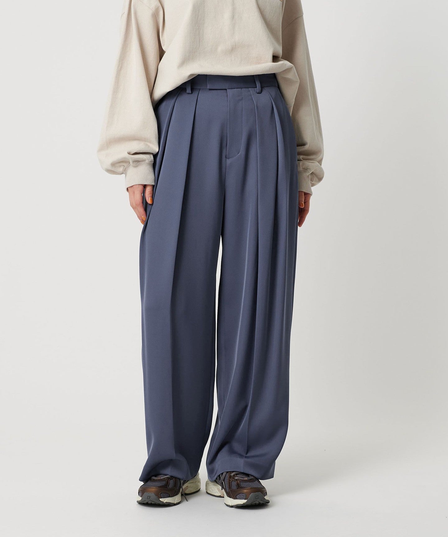 Wide silhouette pants with two deep pleats made from fabric with a moderate drape.