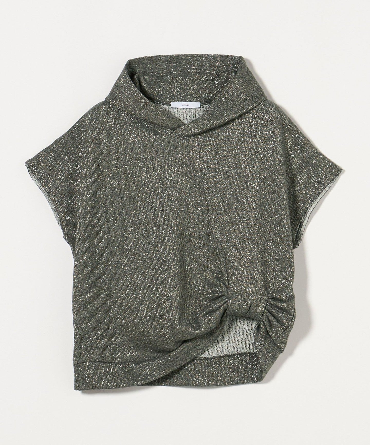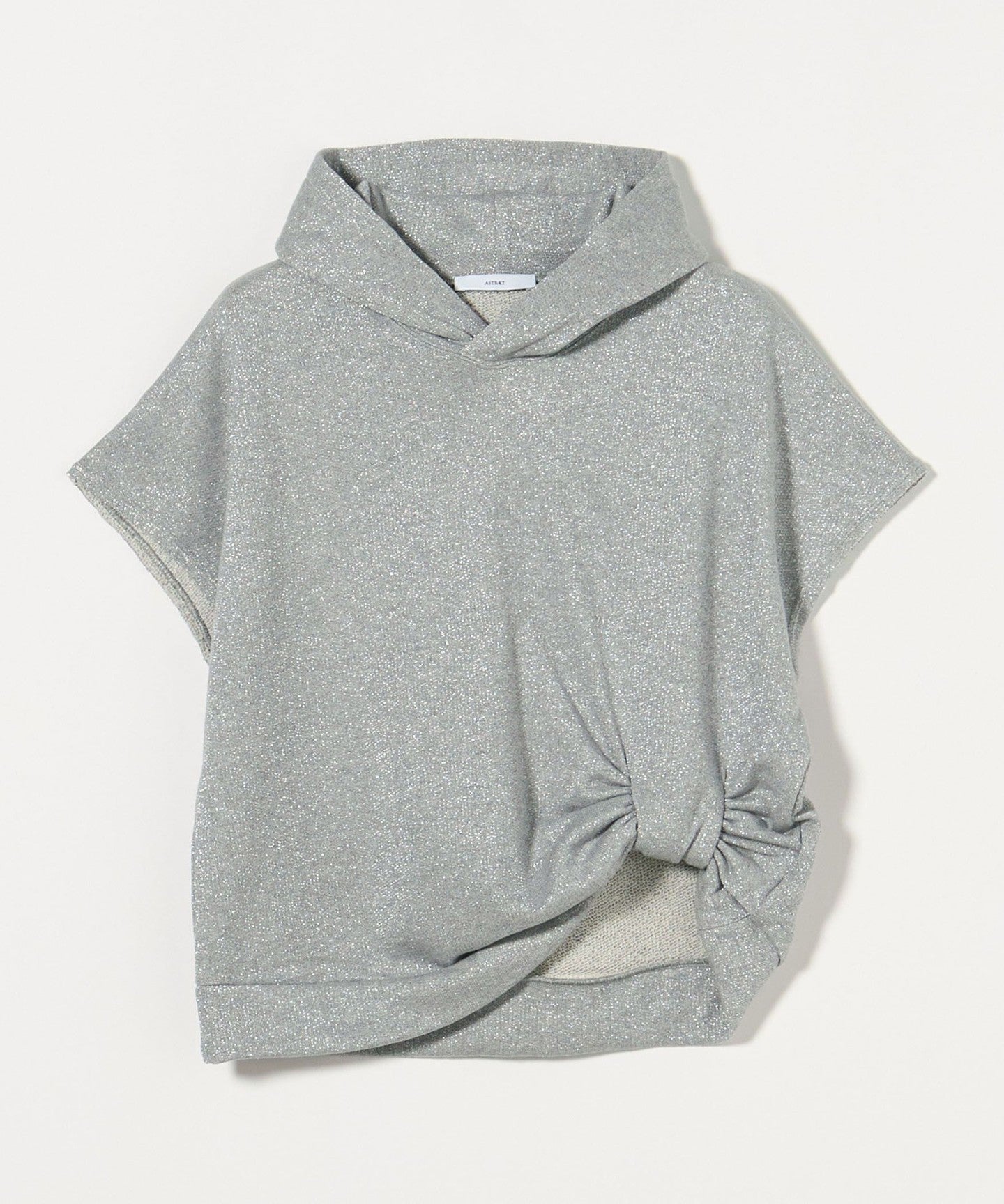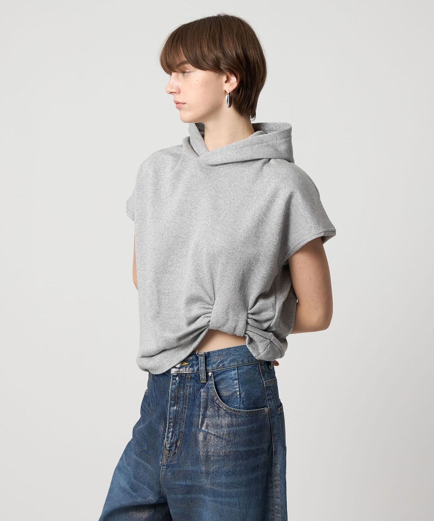 A hooded pullover with raw sleeves and an asymmetrical hem.