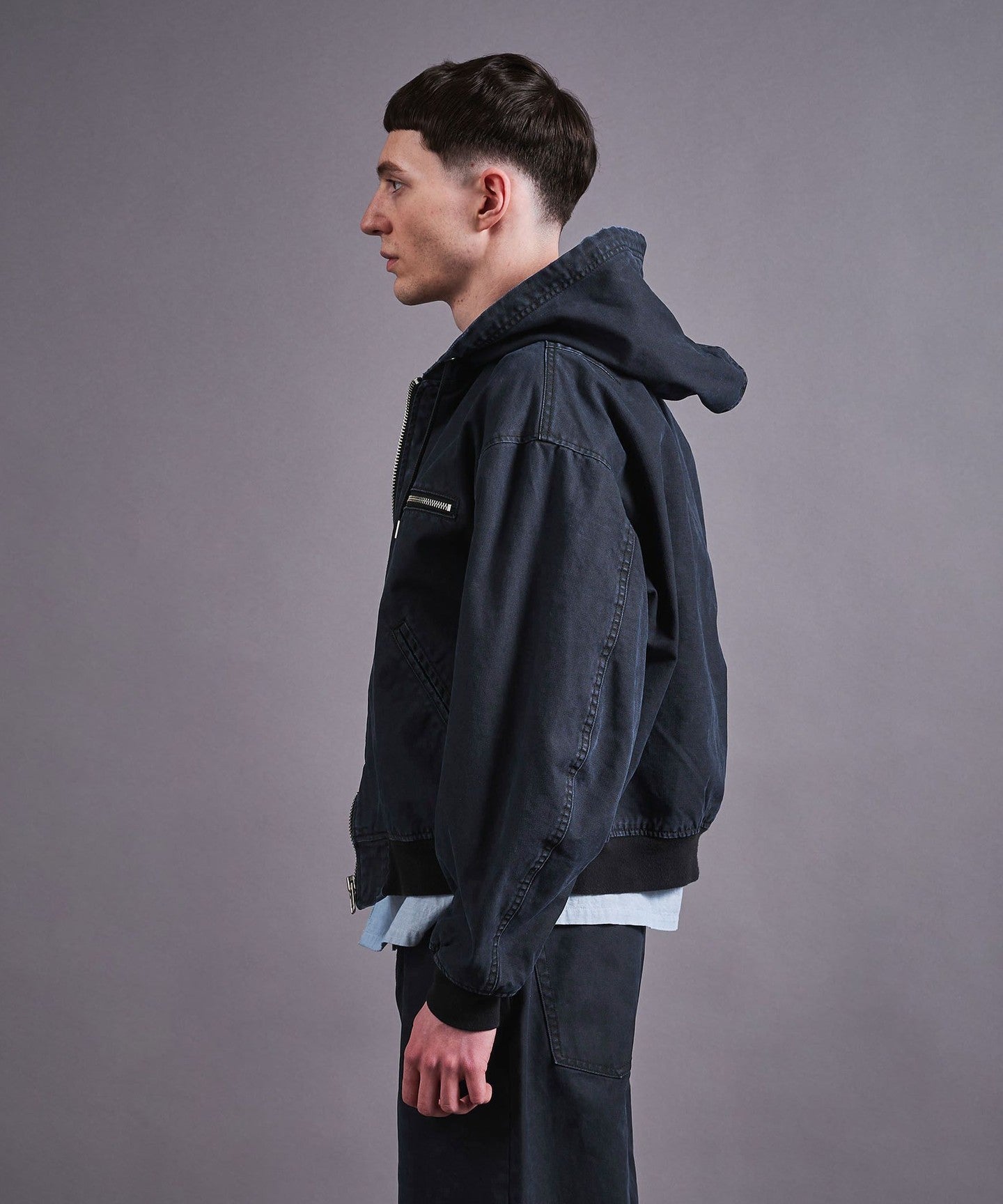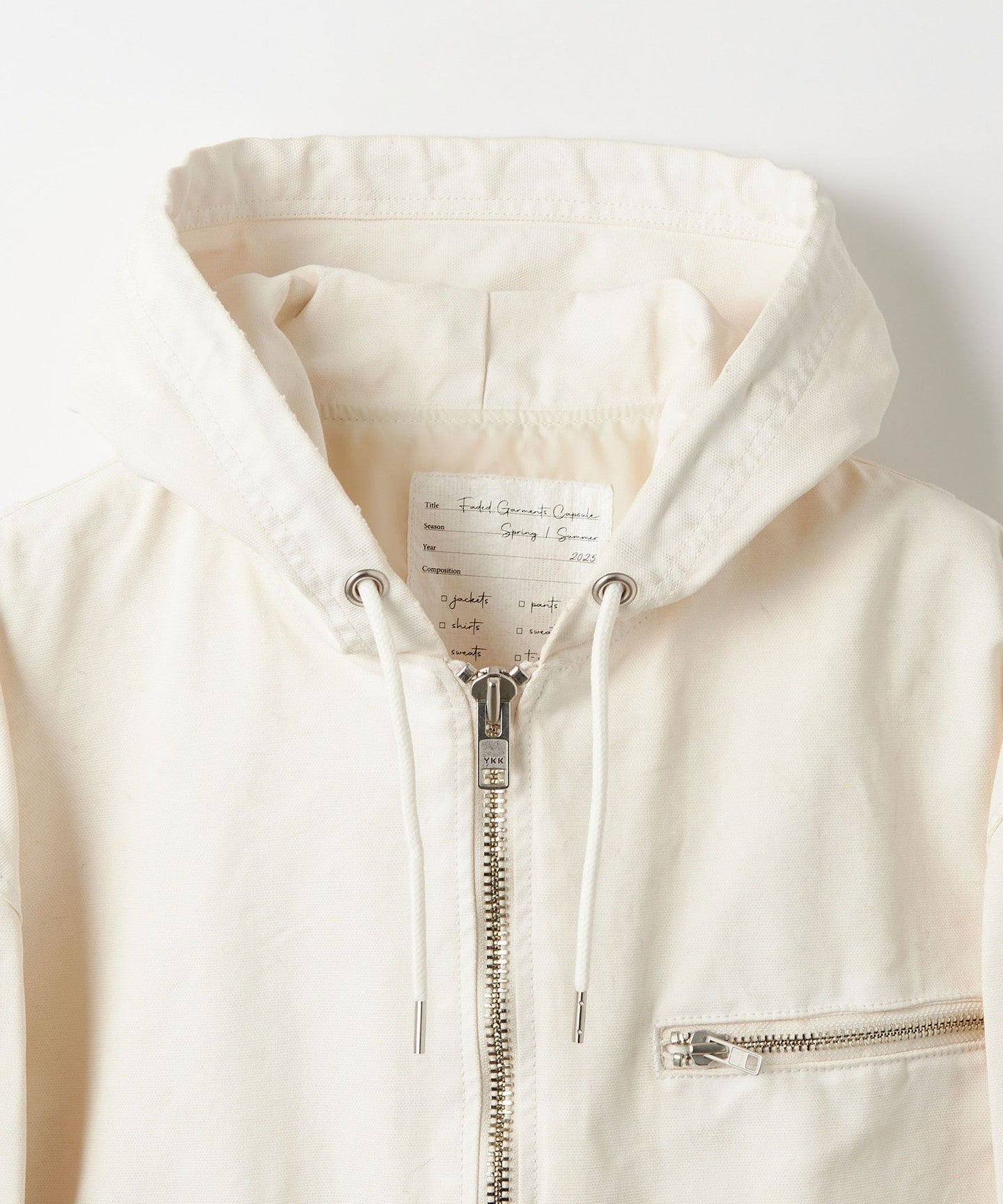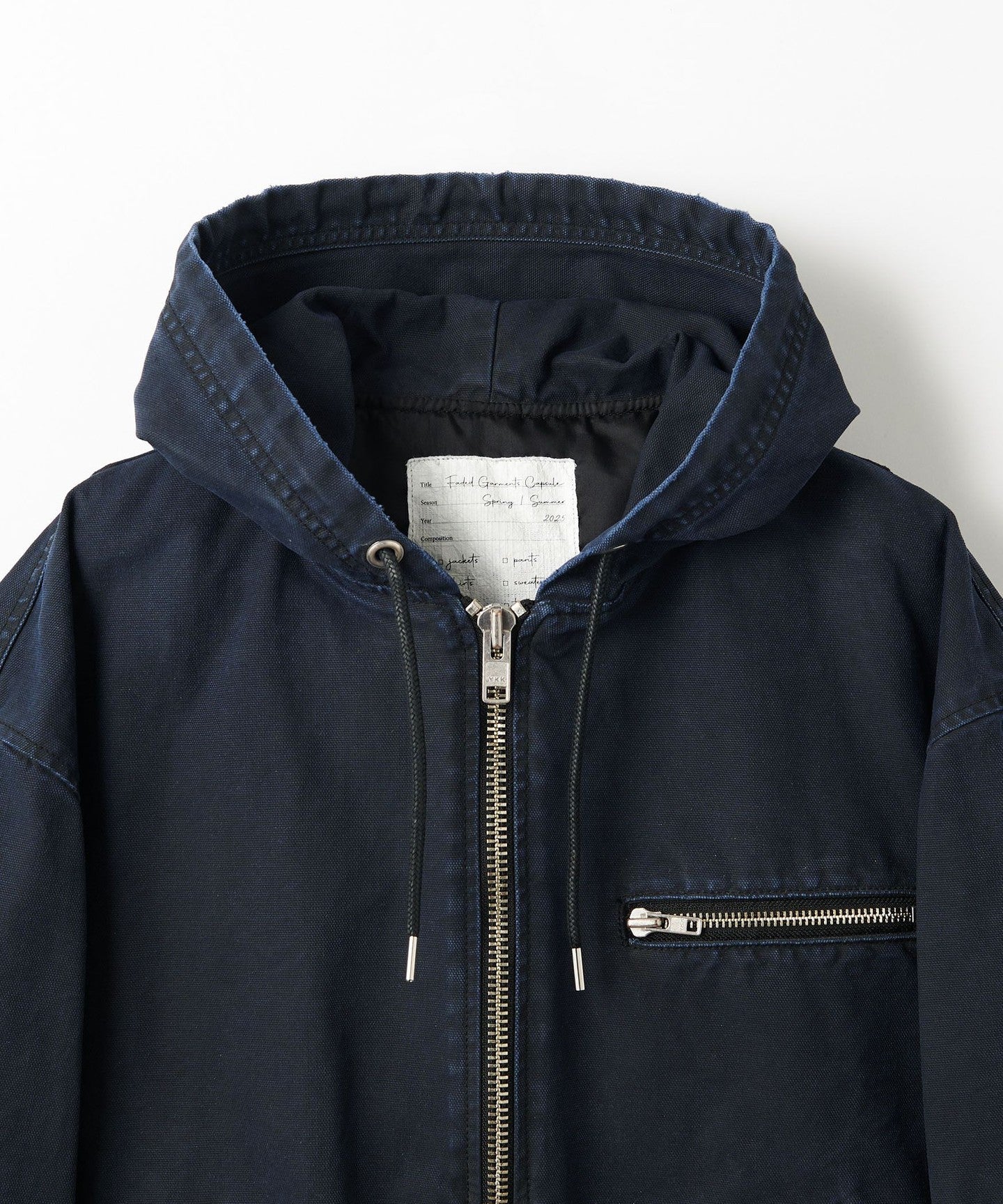 A zip-up hooded jacket made from thick duck material that has a duck-like texture but is suitable for spring wear.