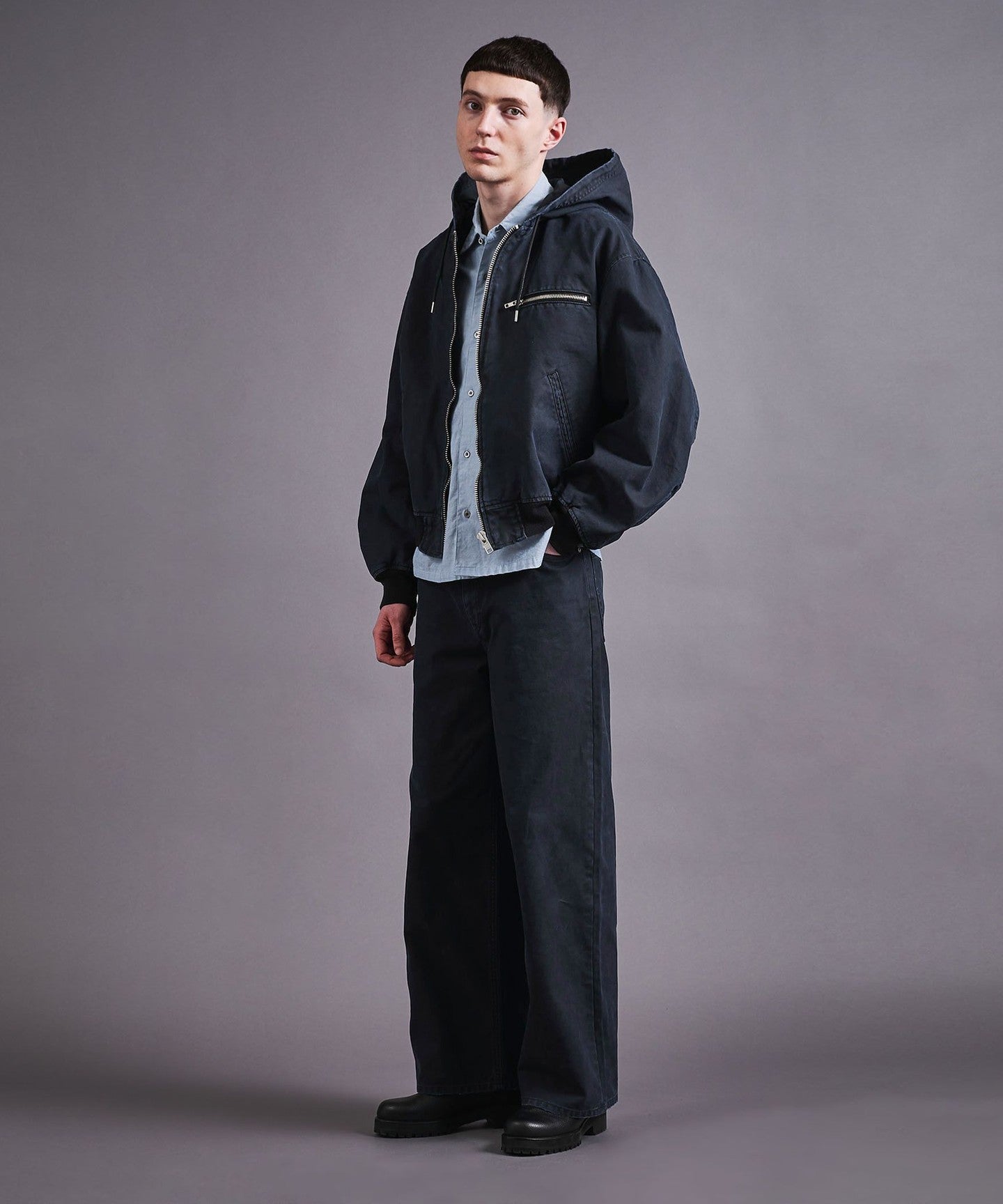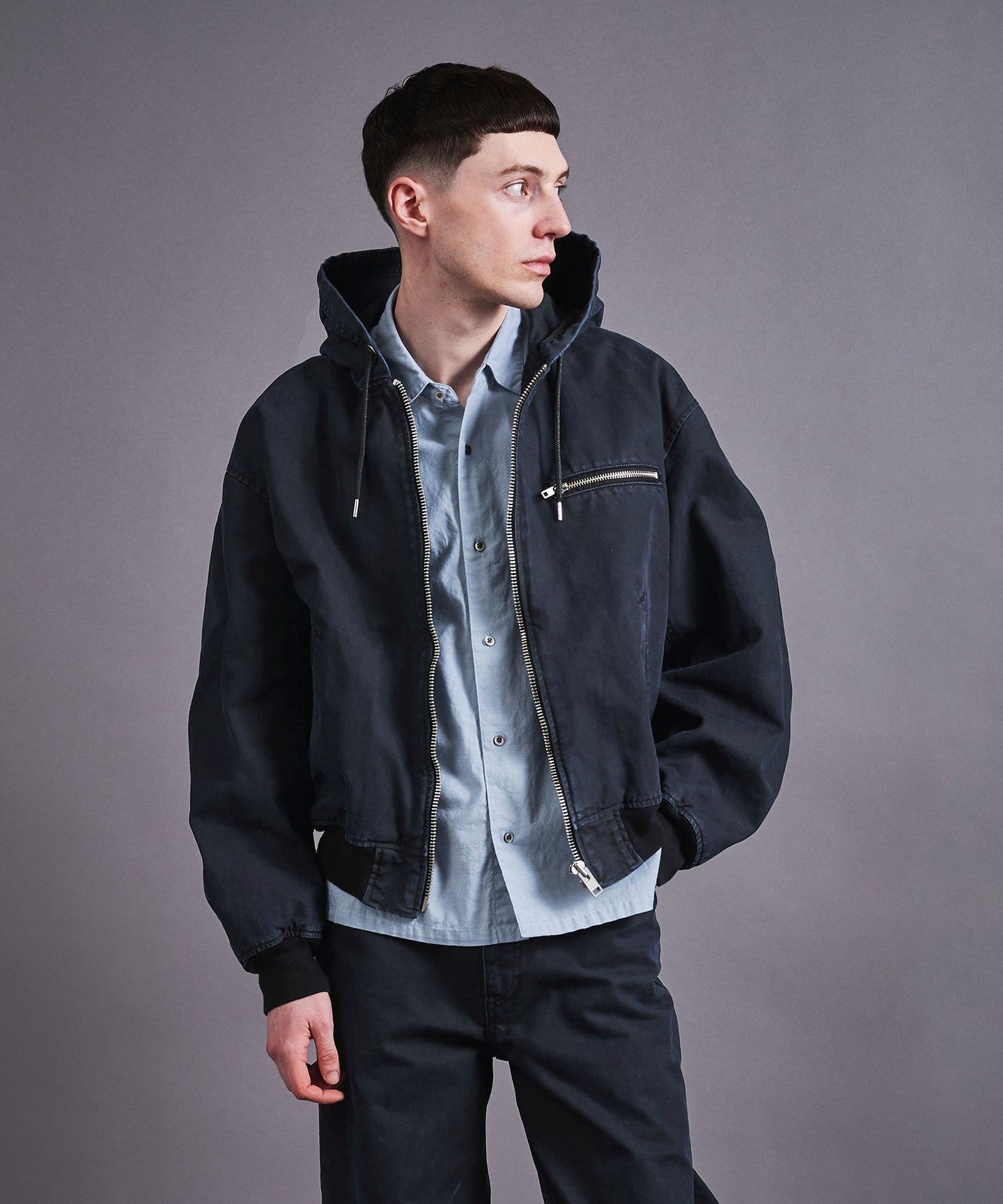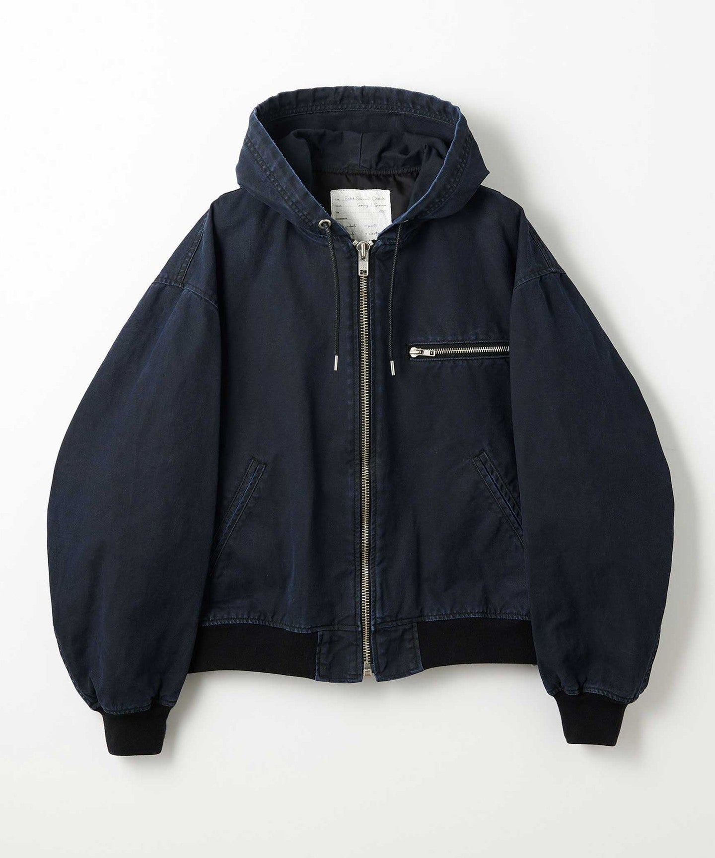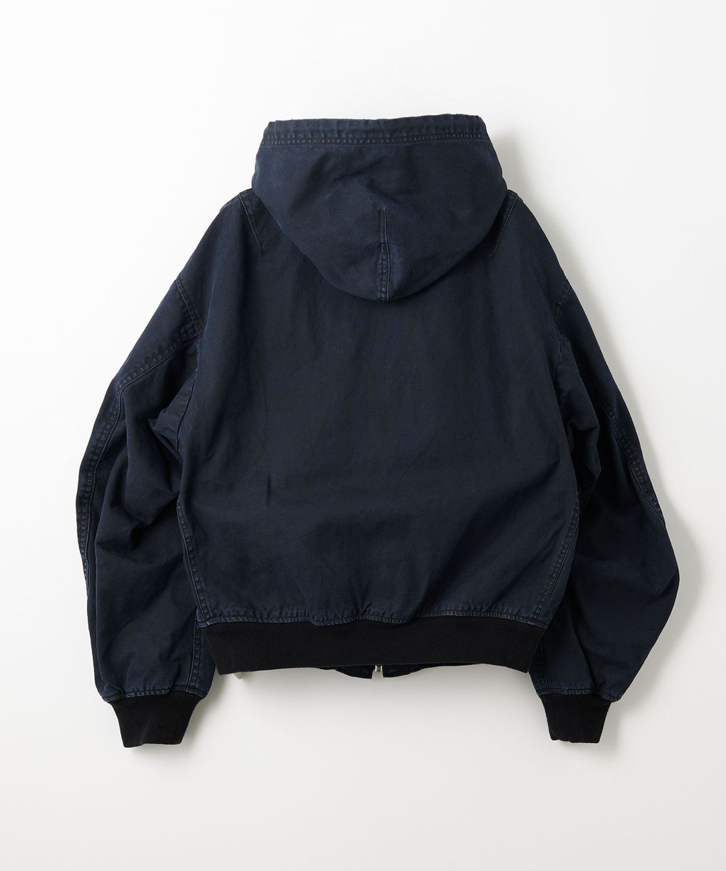 A zip-up hooded jacket made from thick duck material that has a duck-like texture but is suitable for spring wear.