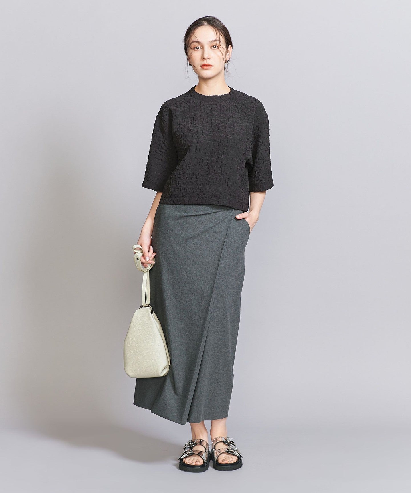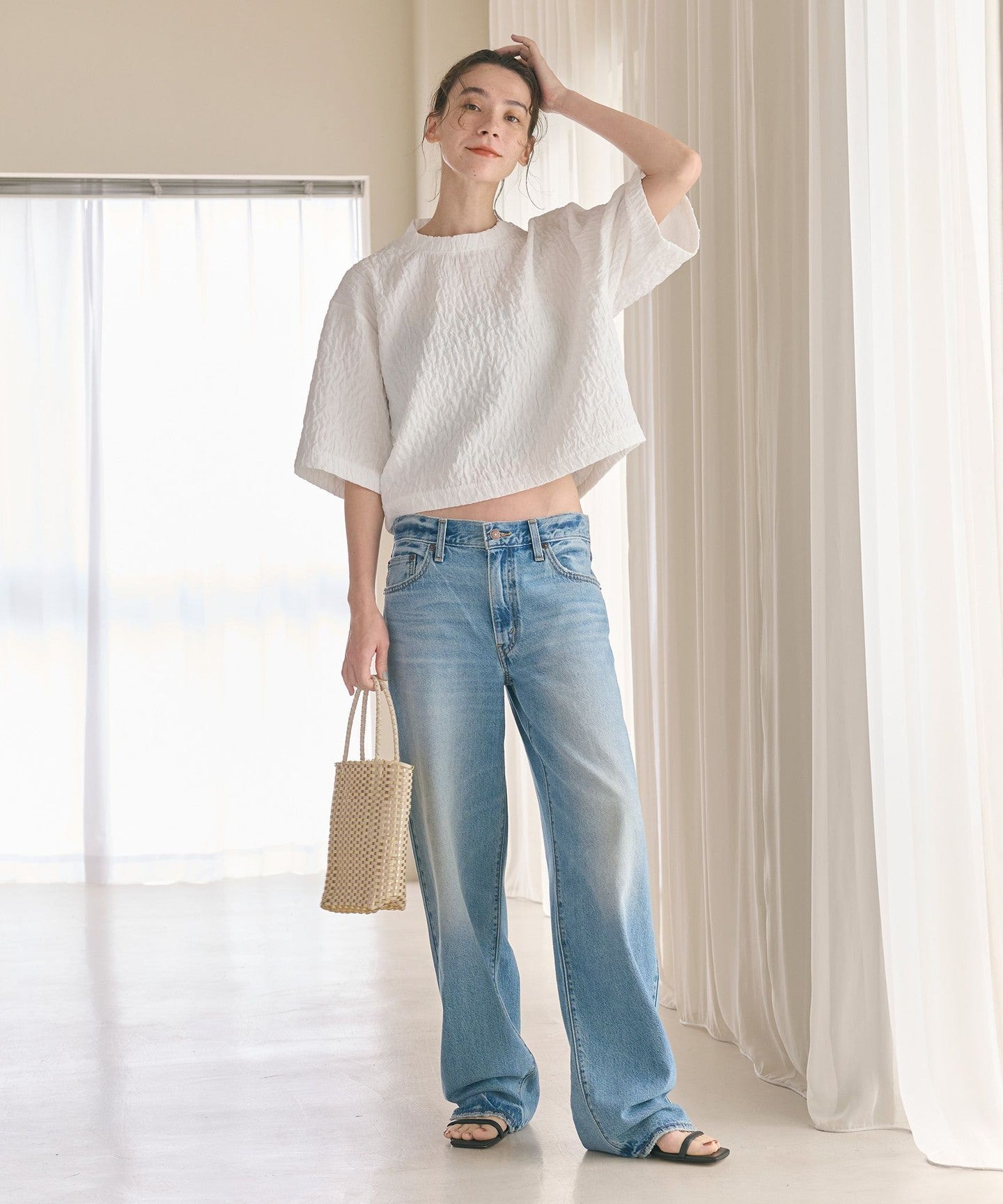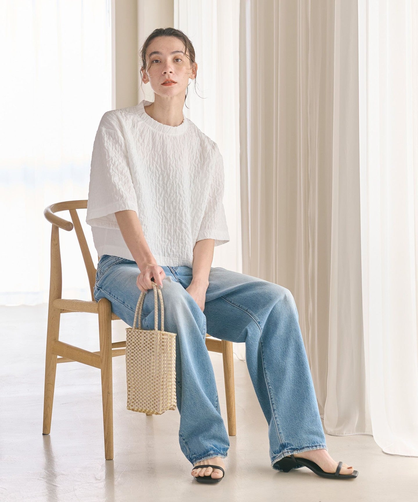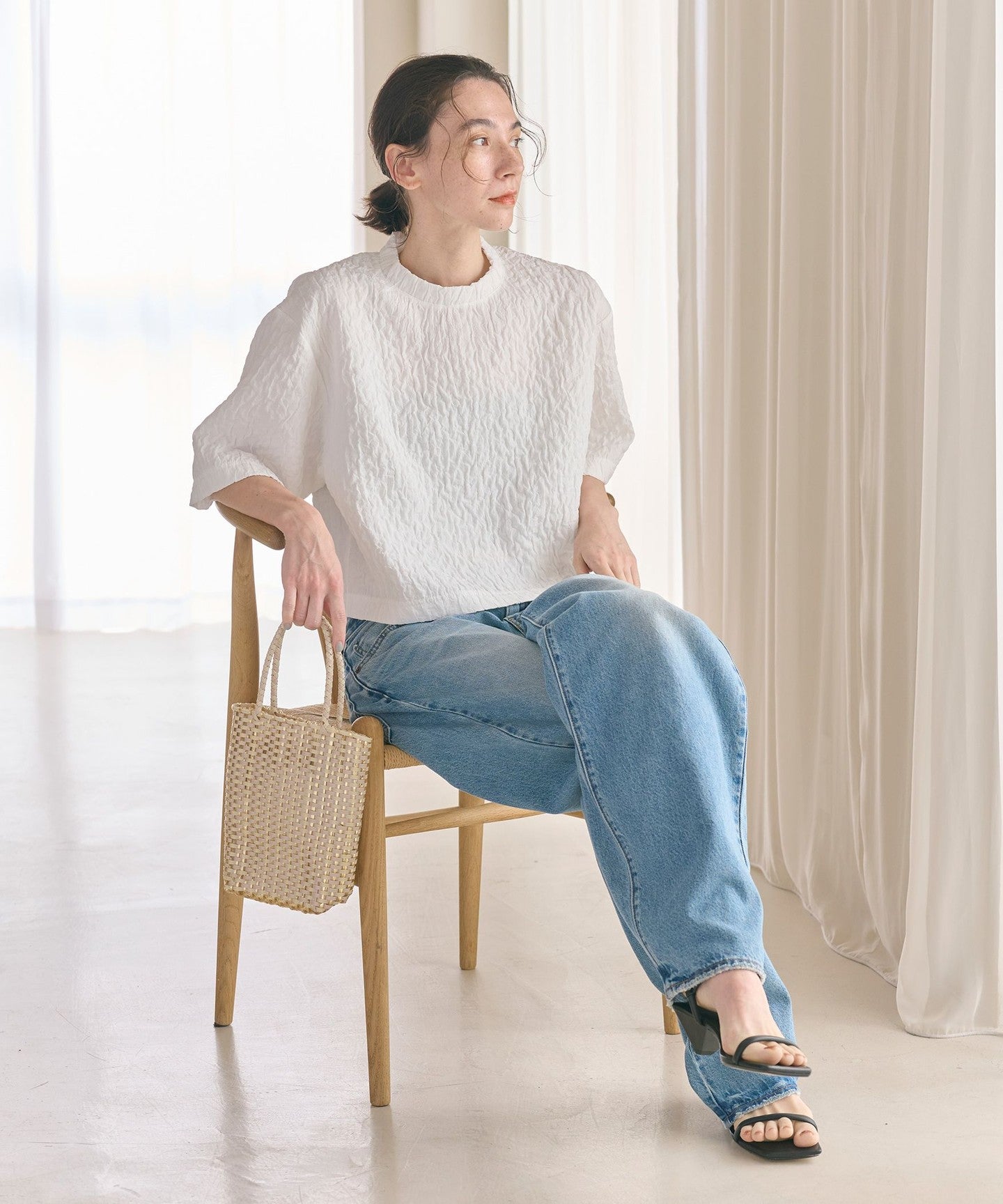 We recommend pairing it with an I-line denim skirt or wide pants.