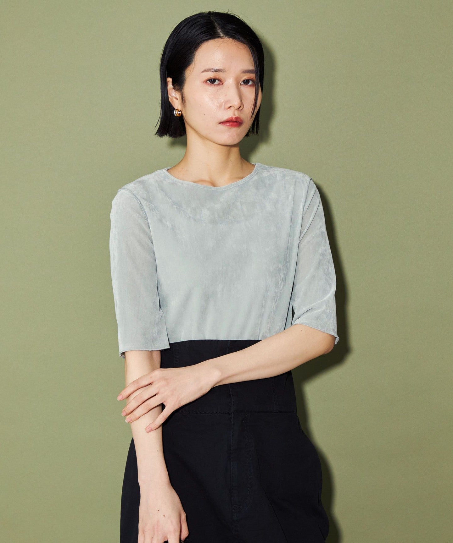 A crew neck top with a design that stands out with its trendy flocked tulle texture.