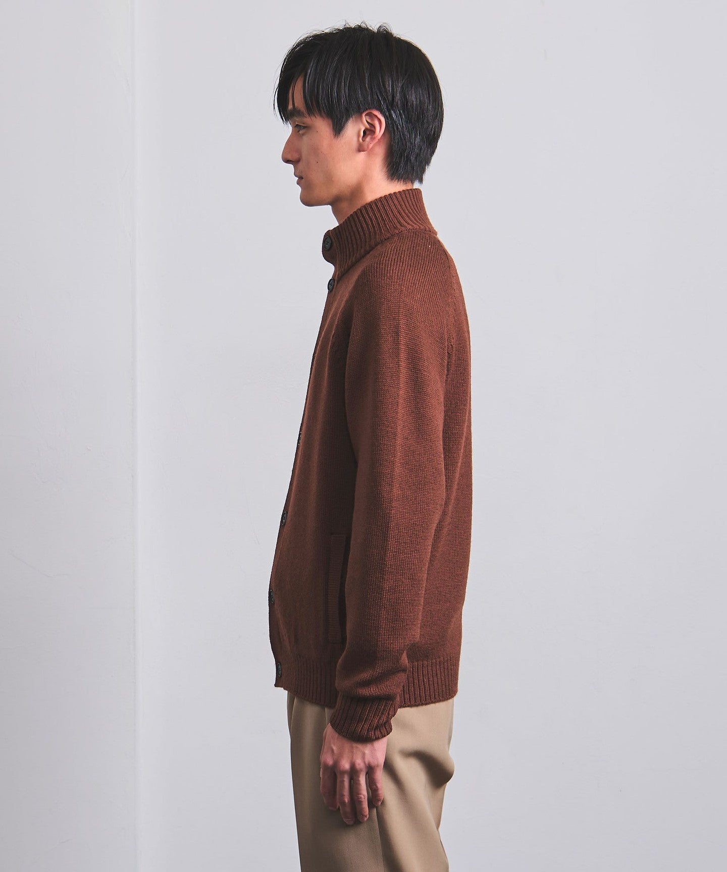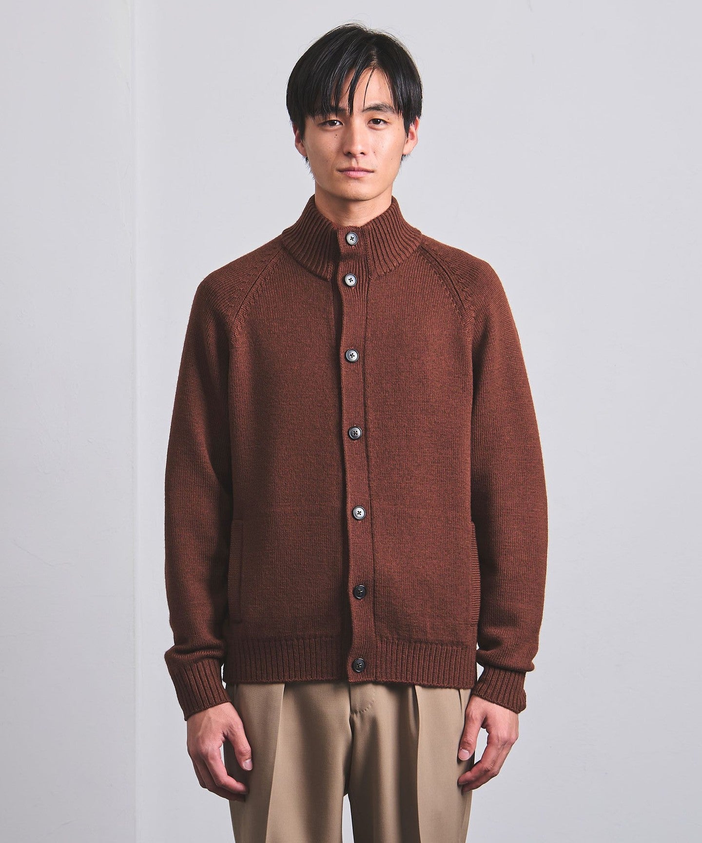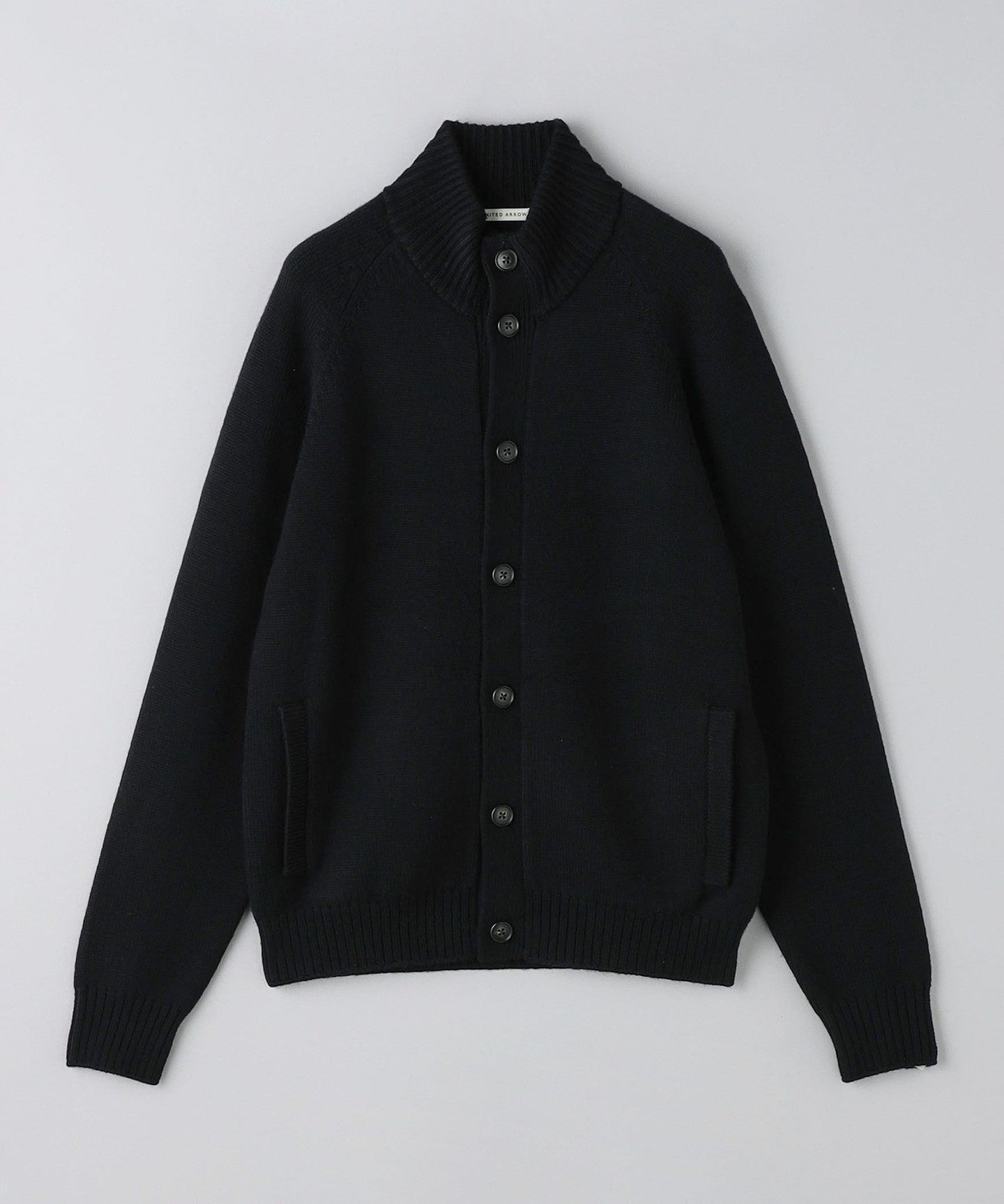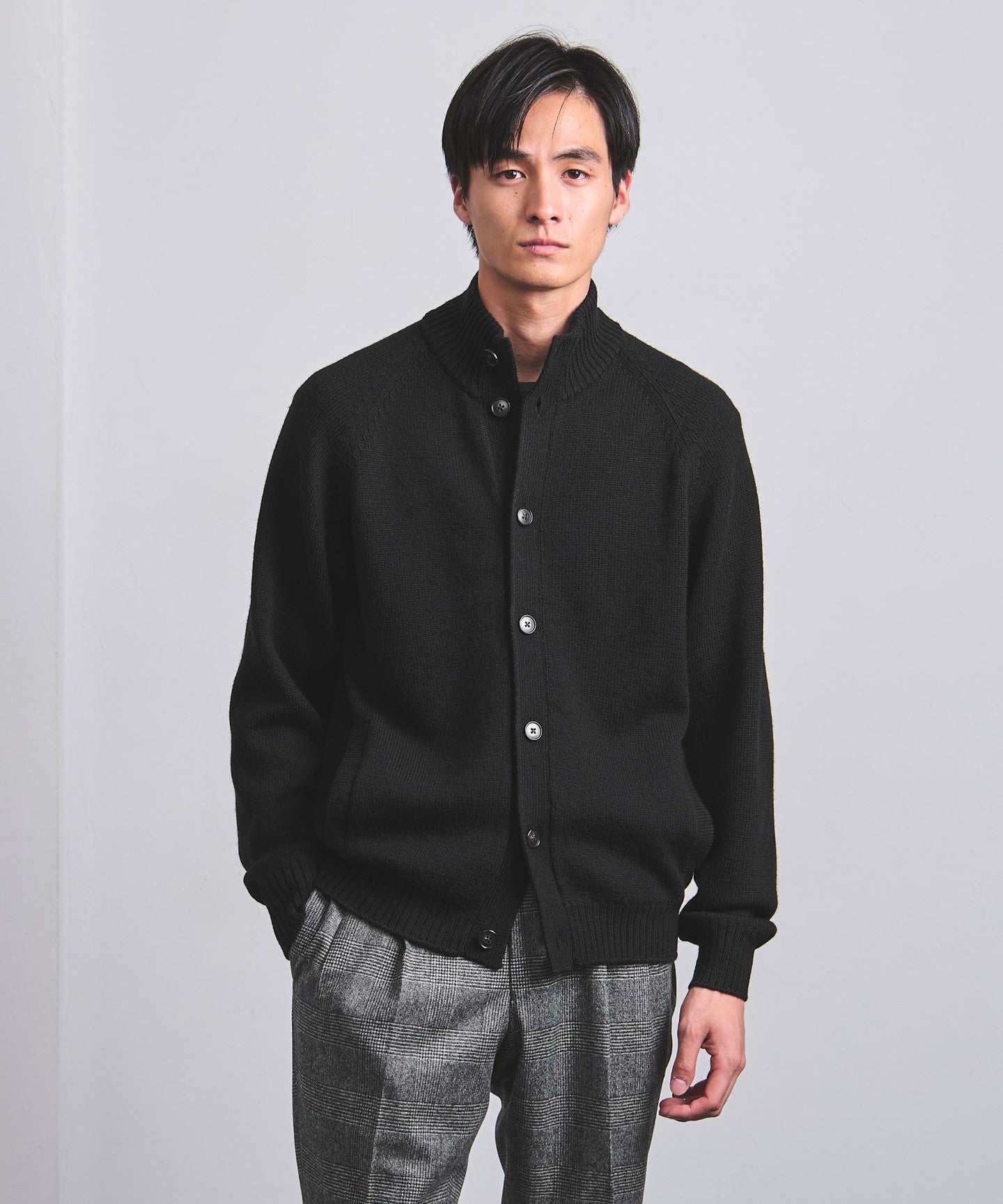 A stand-collar knit cardigan with a balanced design that keeps the collar standing up beautifully.