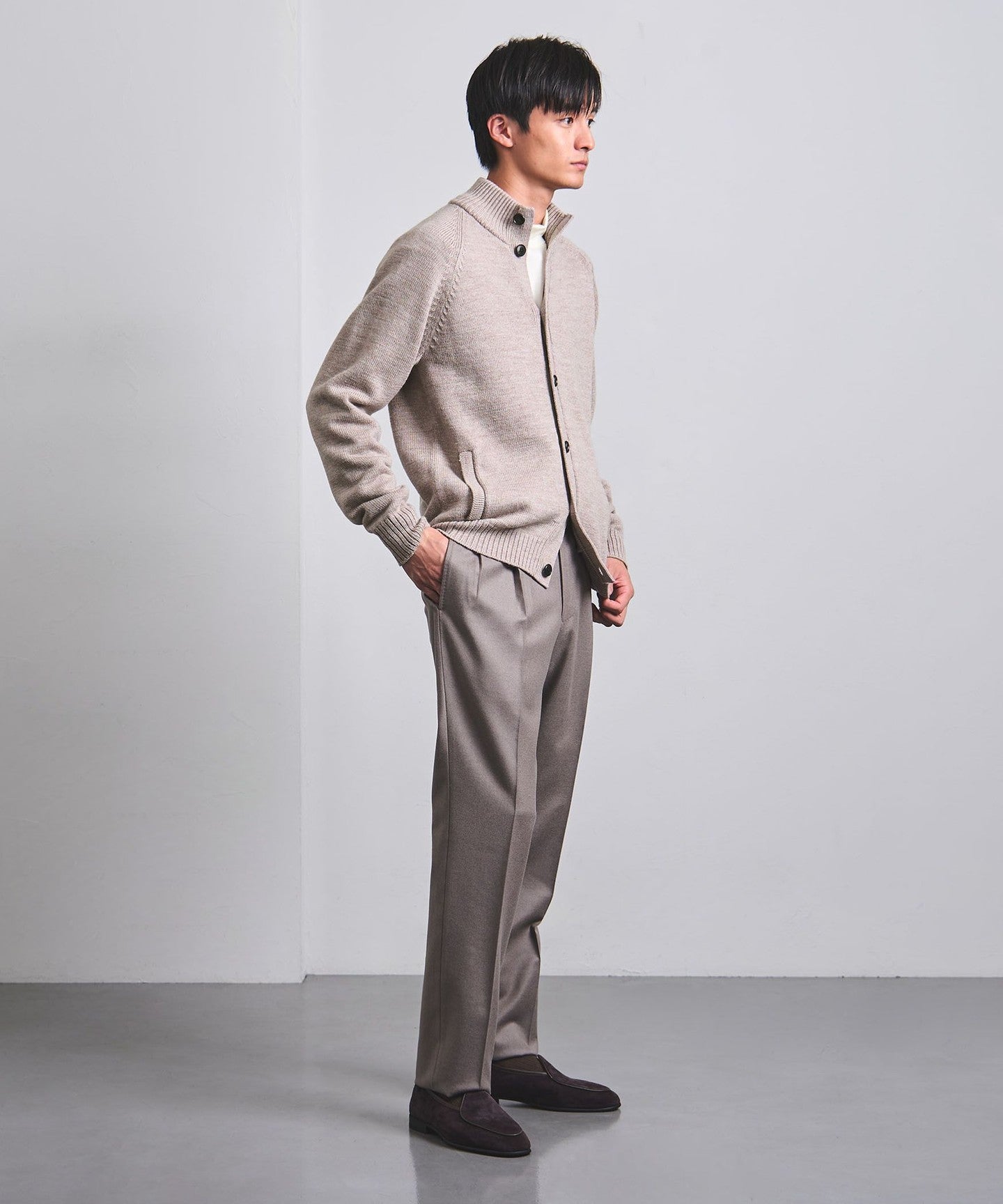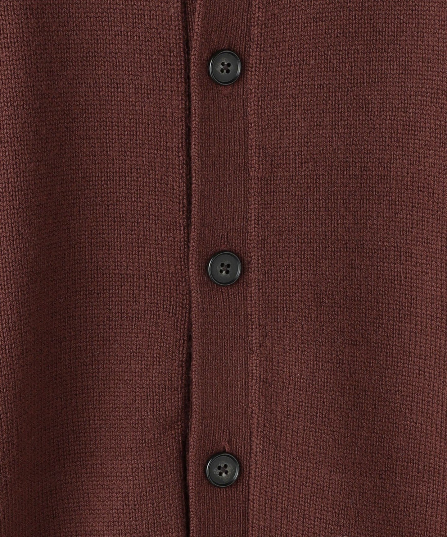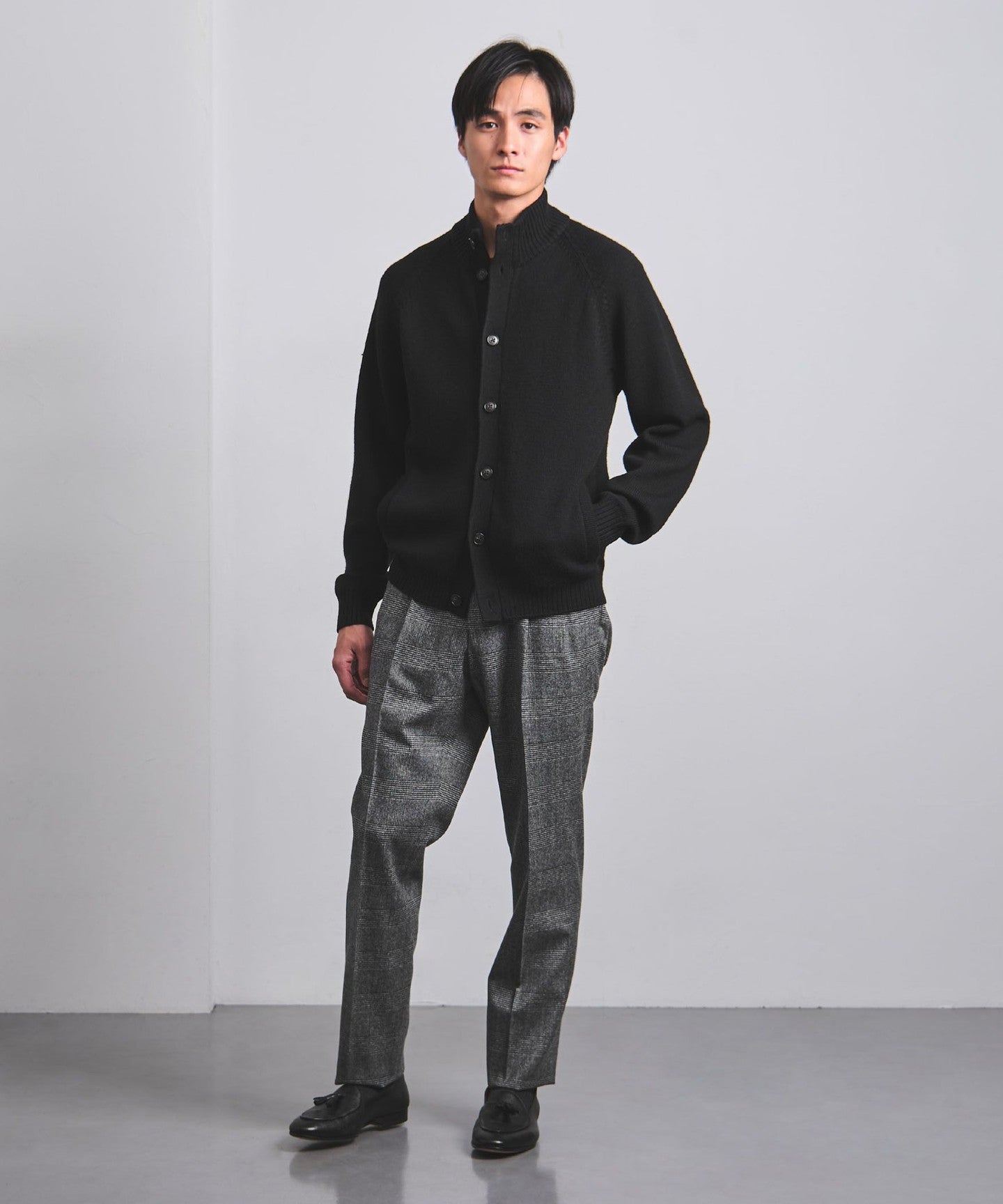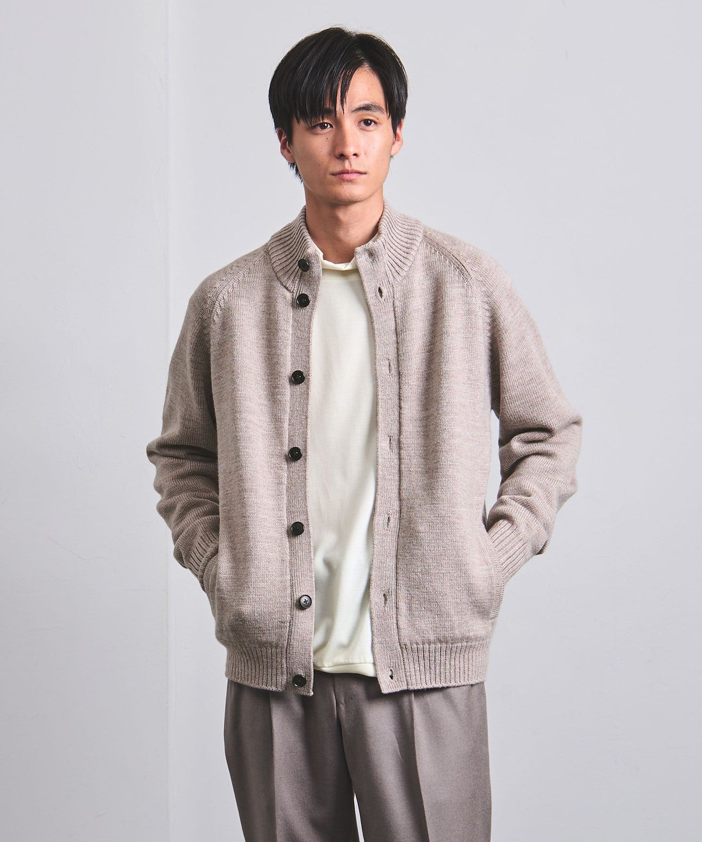 A stand-collar knit cardigan with a balanced design that keeps the collar standing up beautifully.