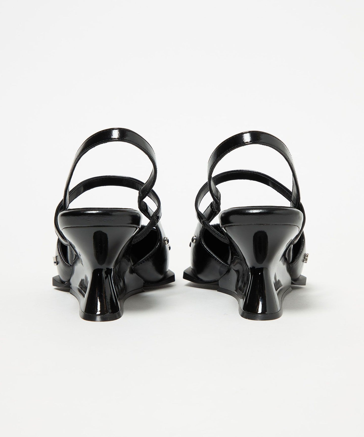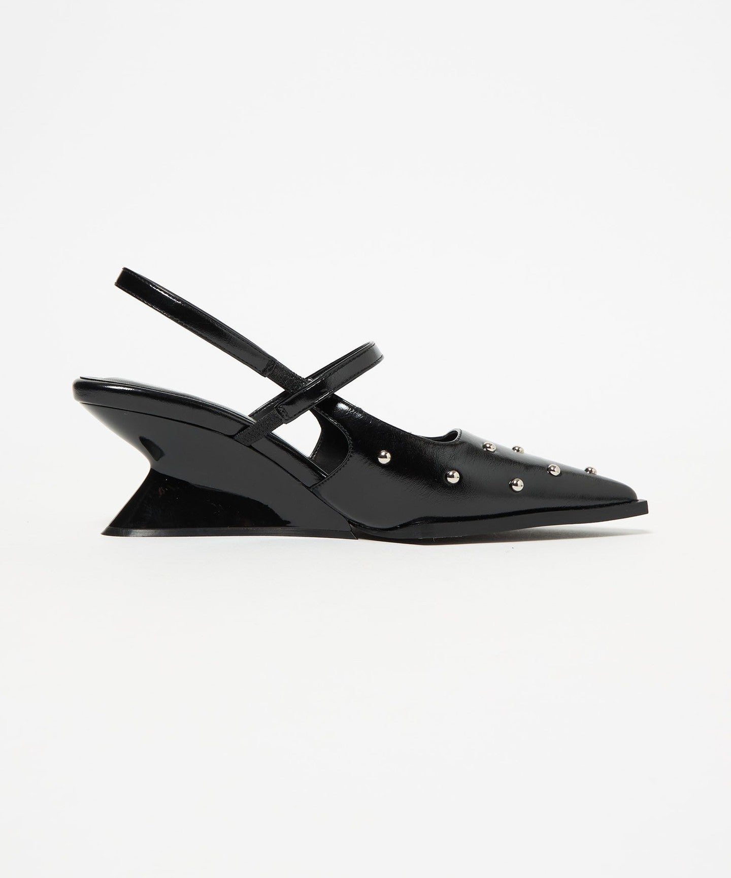 The sharp, tapered wedge heel and the eye-catching, angular base create a modern look.
