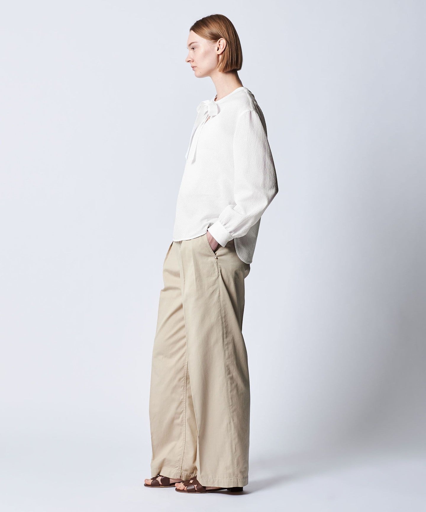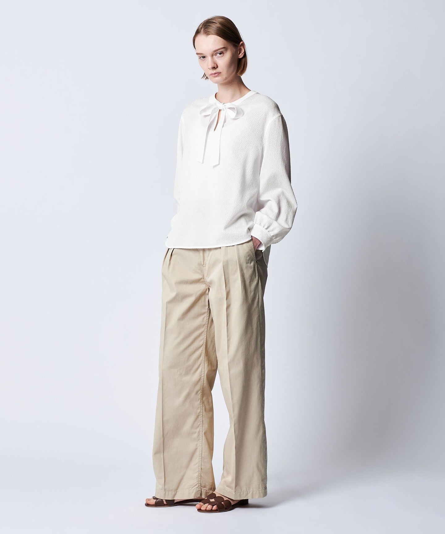 A ribbon blouse made of expressive material that looks light and stylish