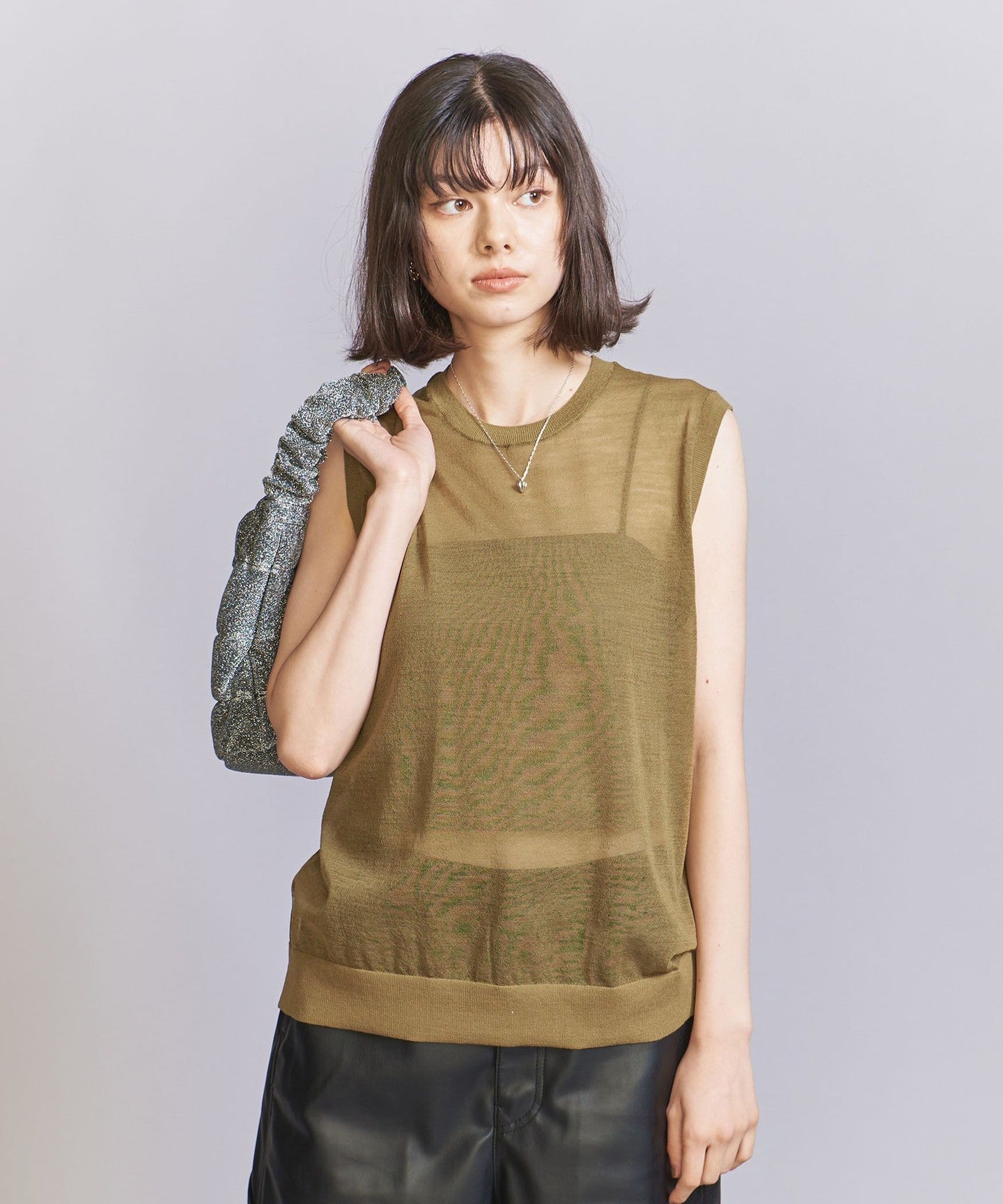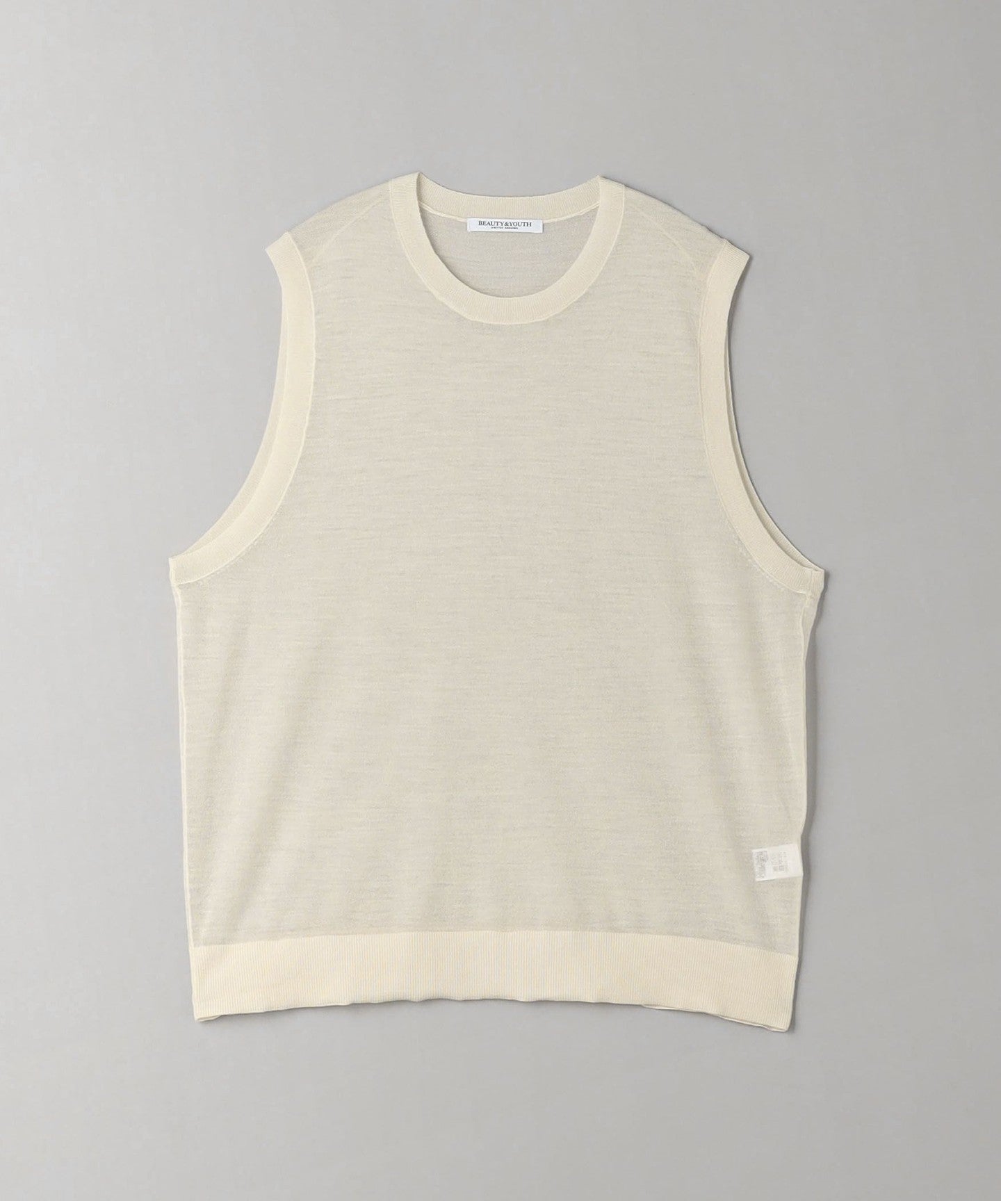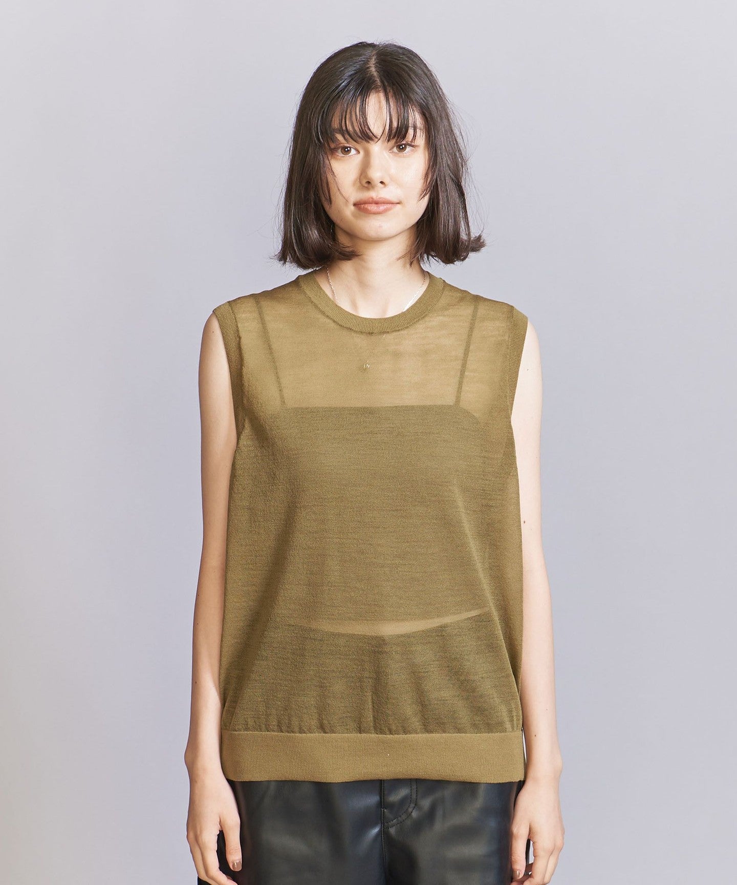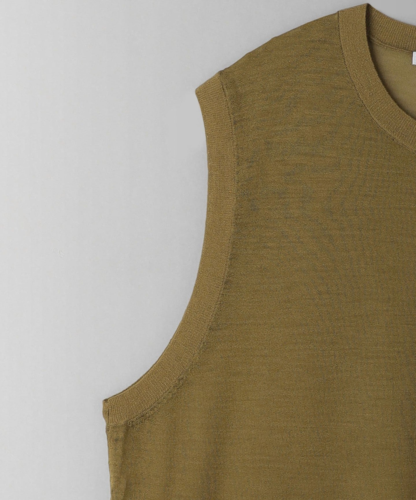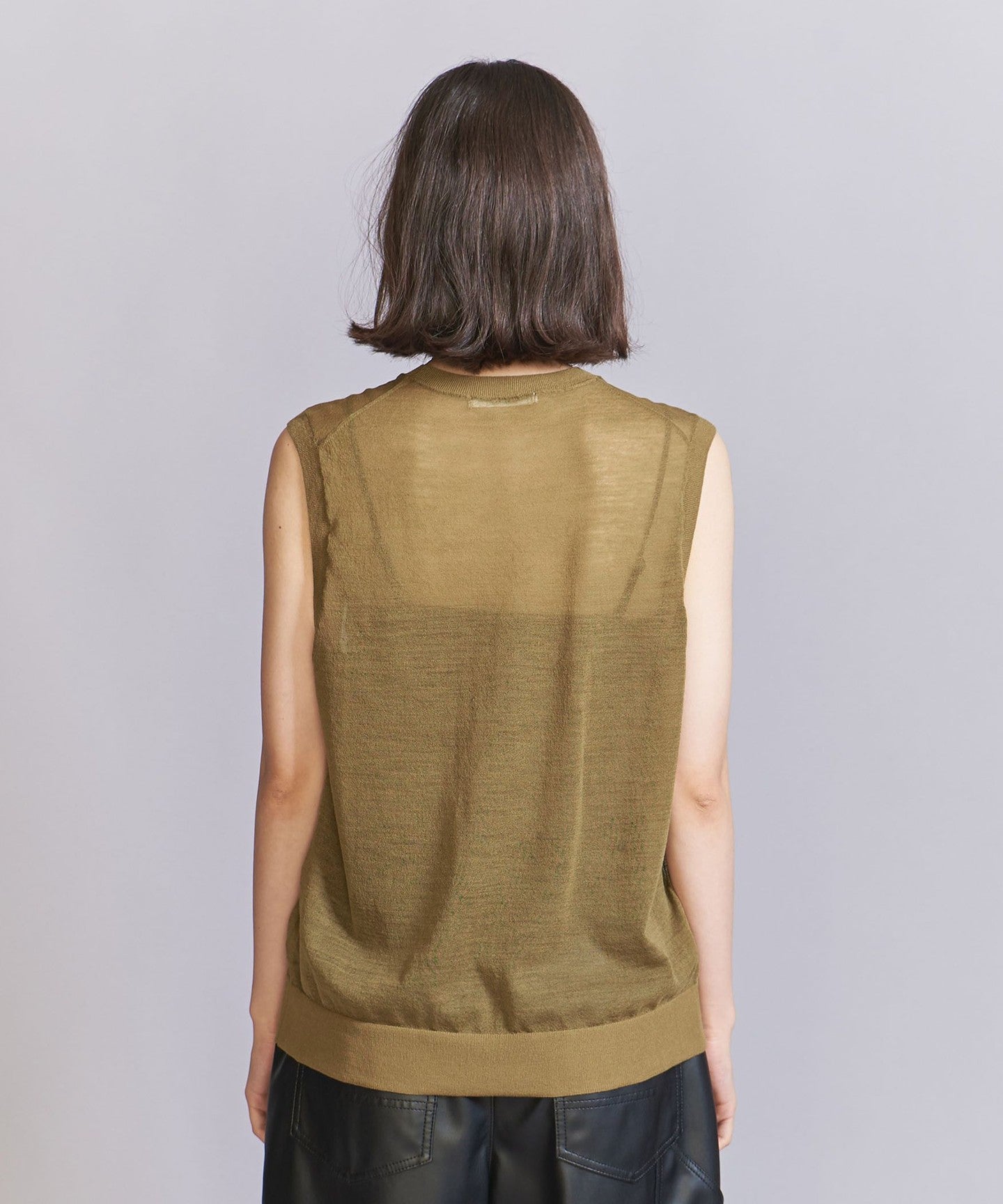 A sheer knit sleeveless top made from a high-gauge wool blend material.