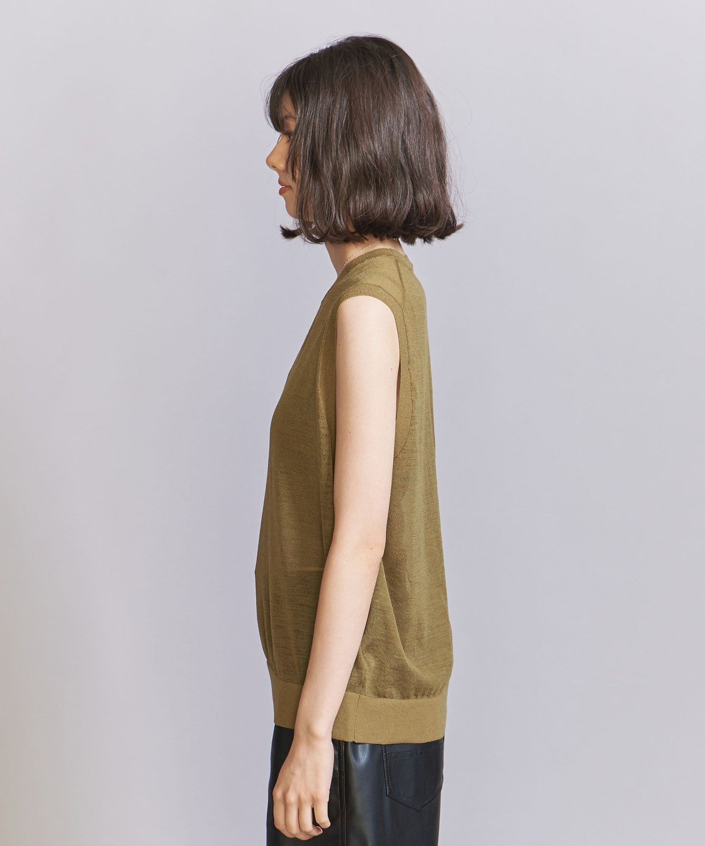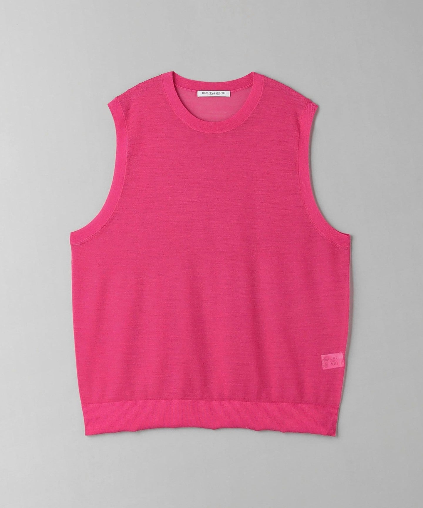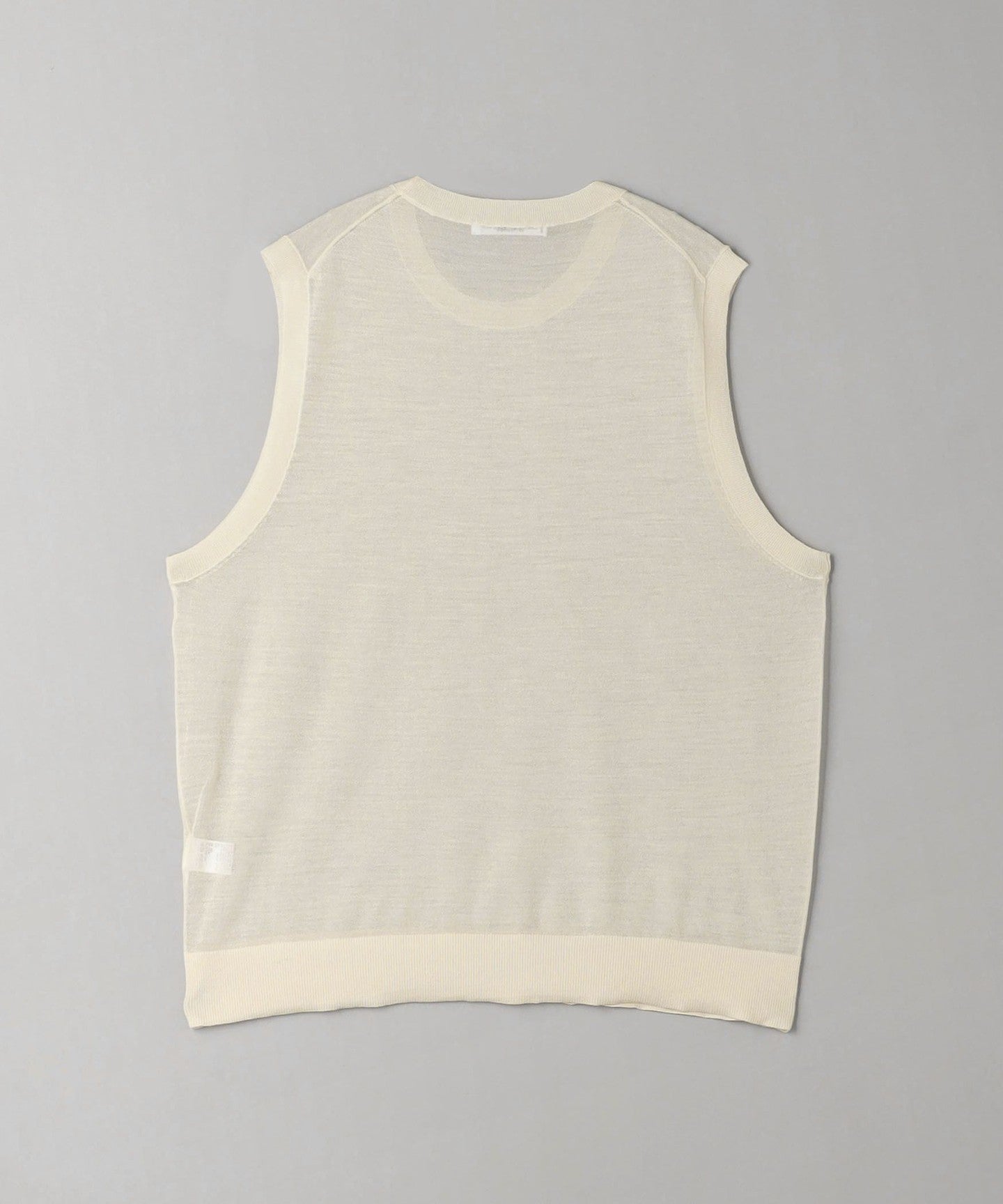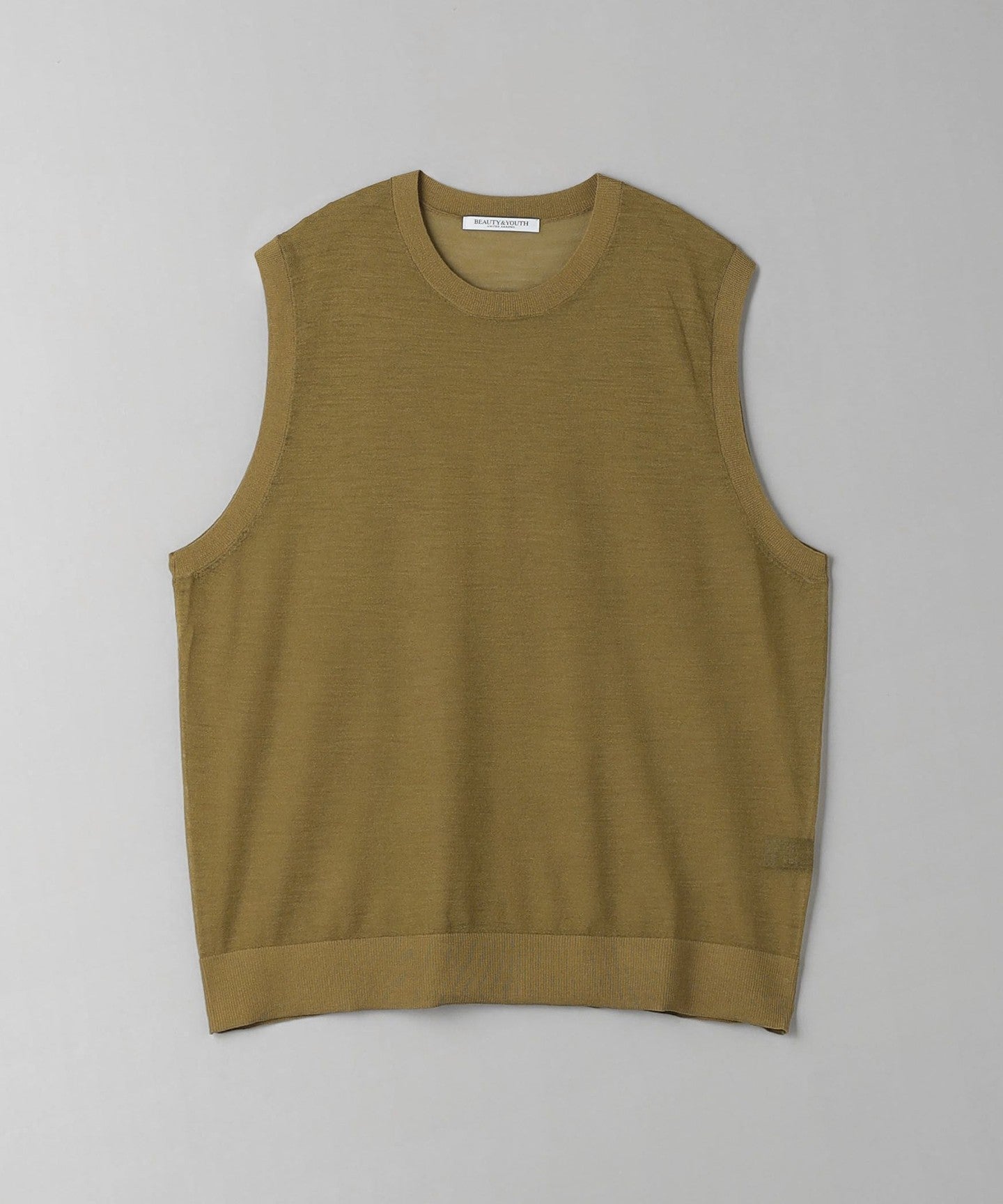A sheer knit sleeveless top made from a high-gauge wool blend material.
