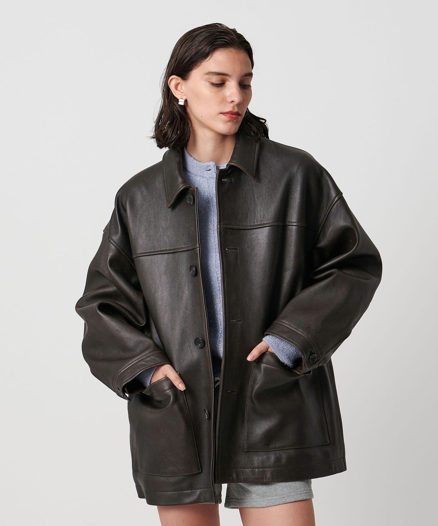 These coveralls are crafted from sheepskin Boston leather with a striking vintage look. After dyeing, the leather is sprayed with black dye pigment and then rubbed under heat to create an uneven surface. The processed, casual feel gives it just the right amount of relaxed appeal, leading to a free and unpretentious urban style.