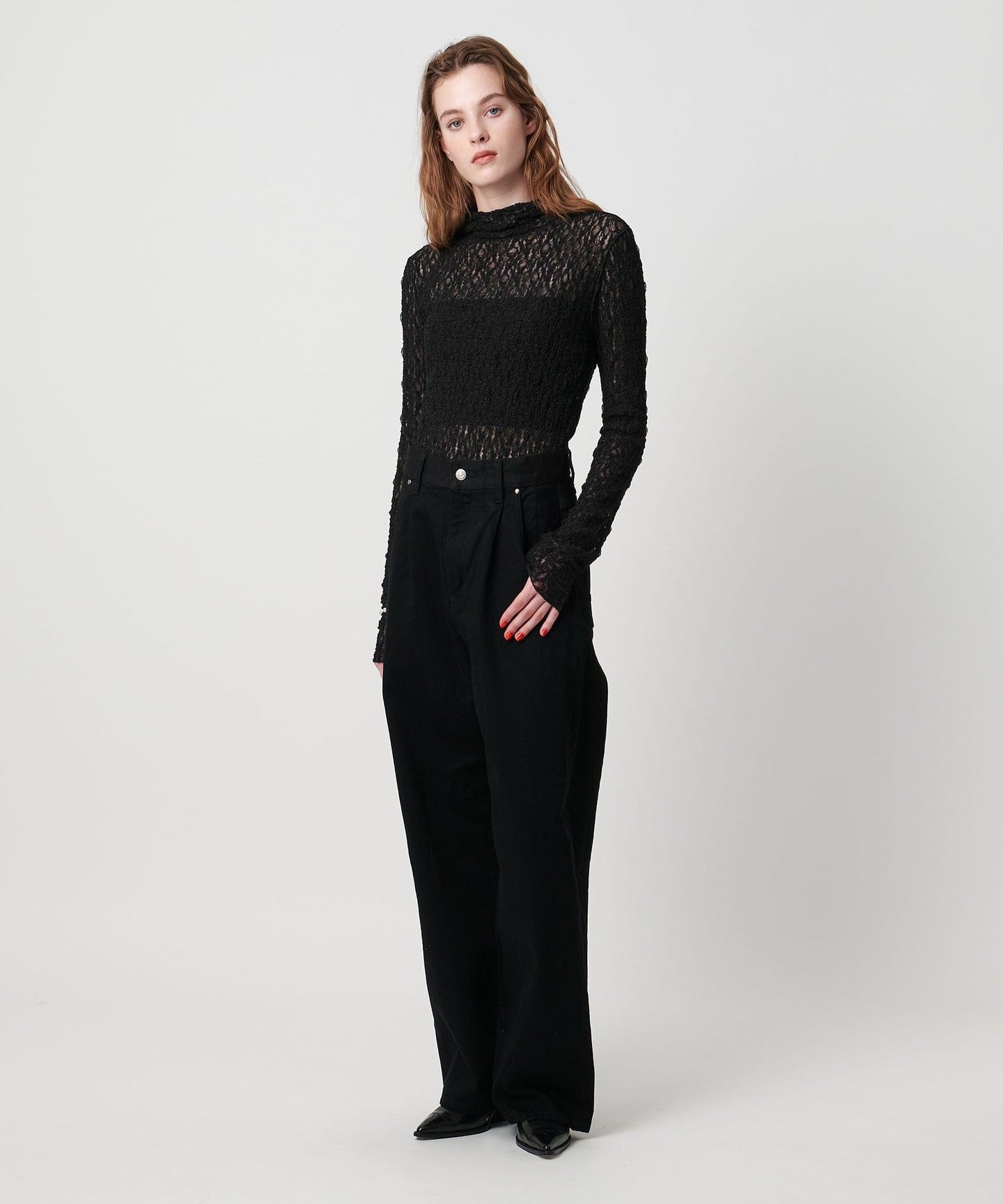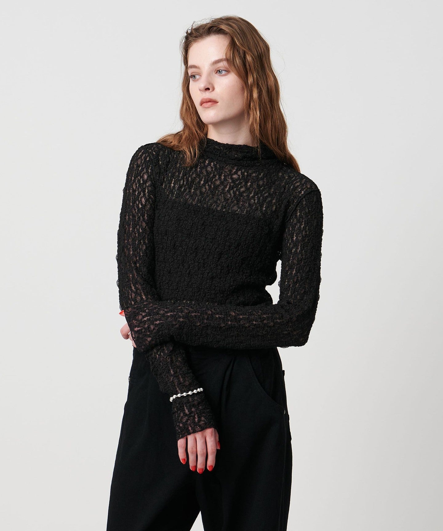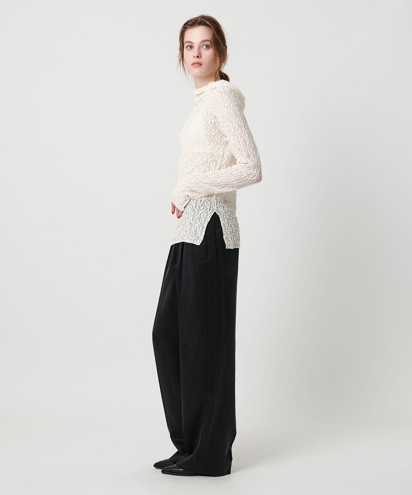 A lace-patterned cut-and-sew top that doesn't look too sweet and features a smooth, soft texture that feels good against the skin.
