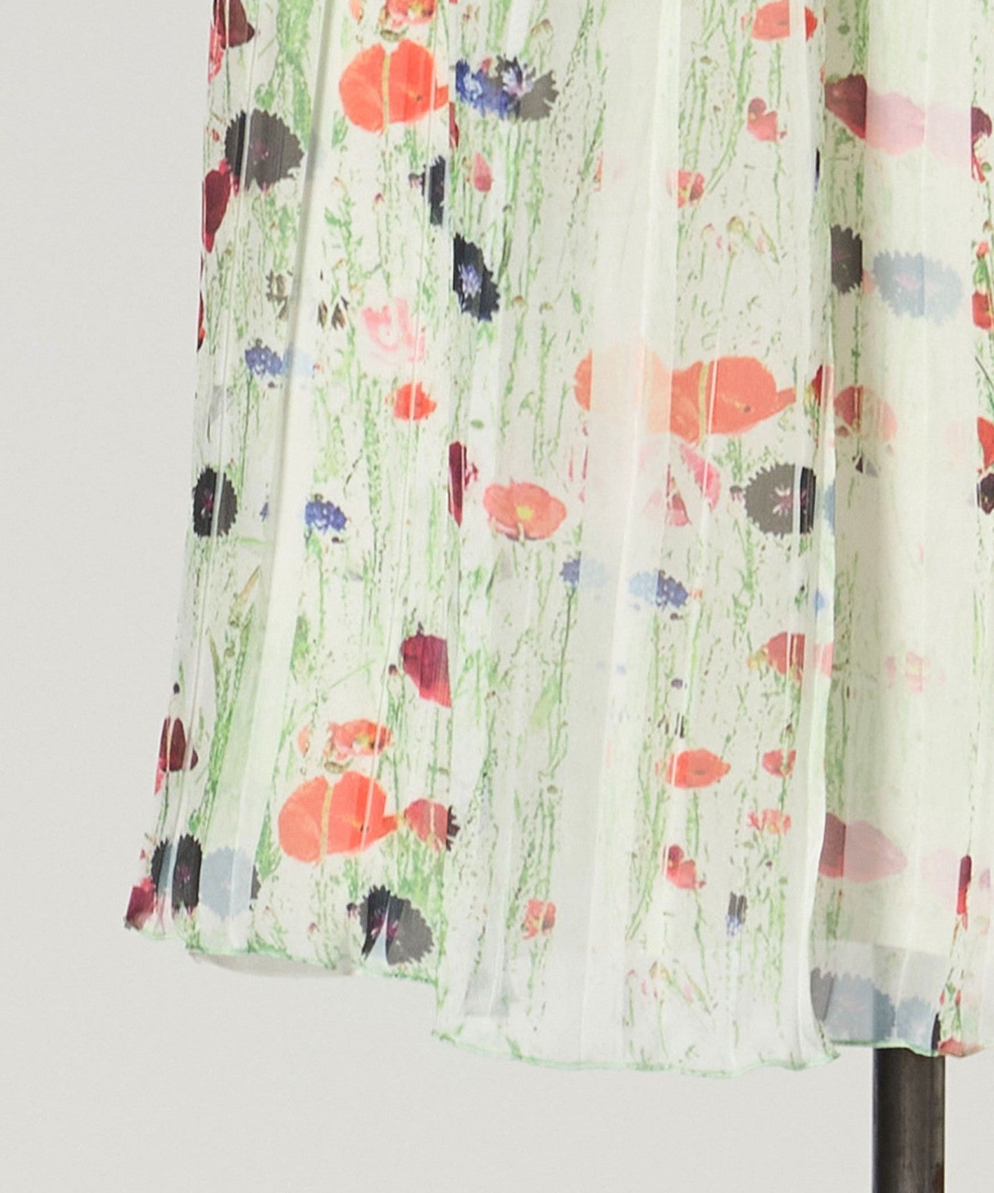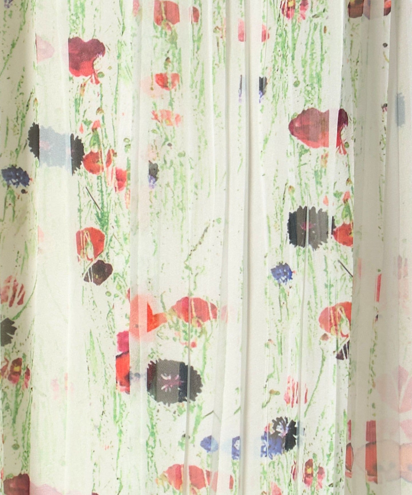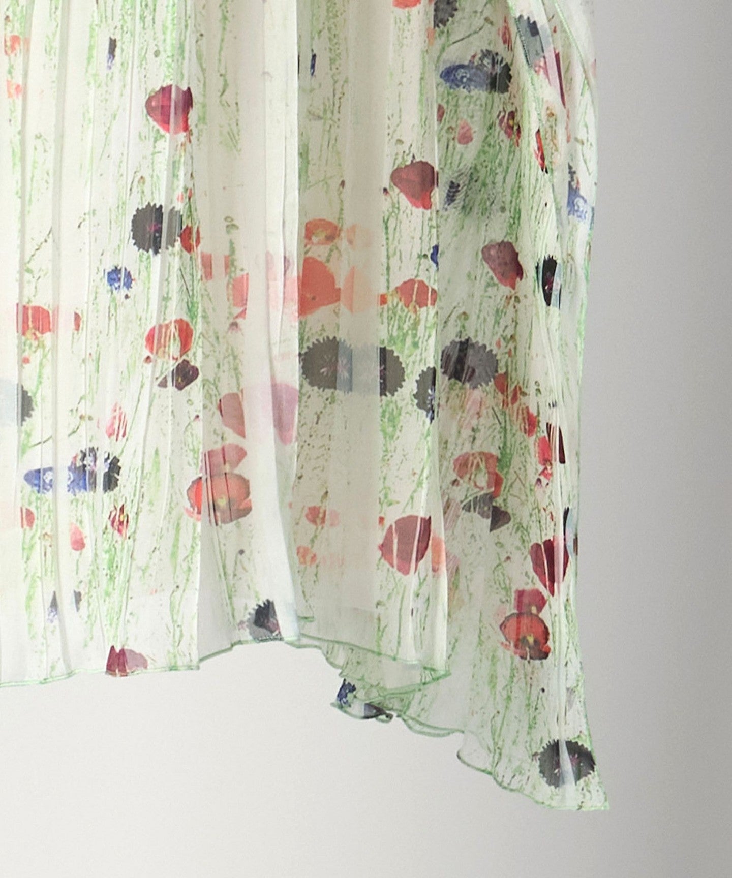 A botanical print of a poppy motif is applied over the pleated fabric, and the area behind the folds is left unprinted, giving it an uneven look.