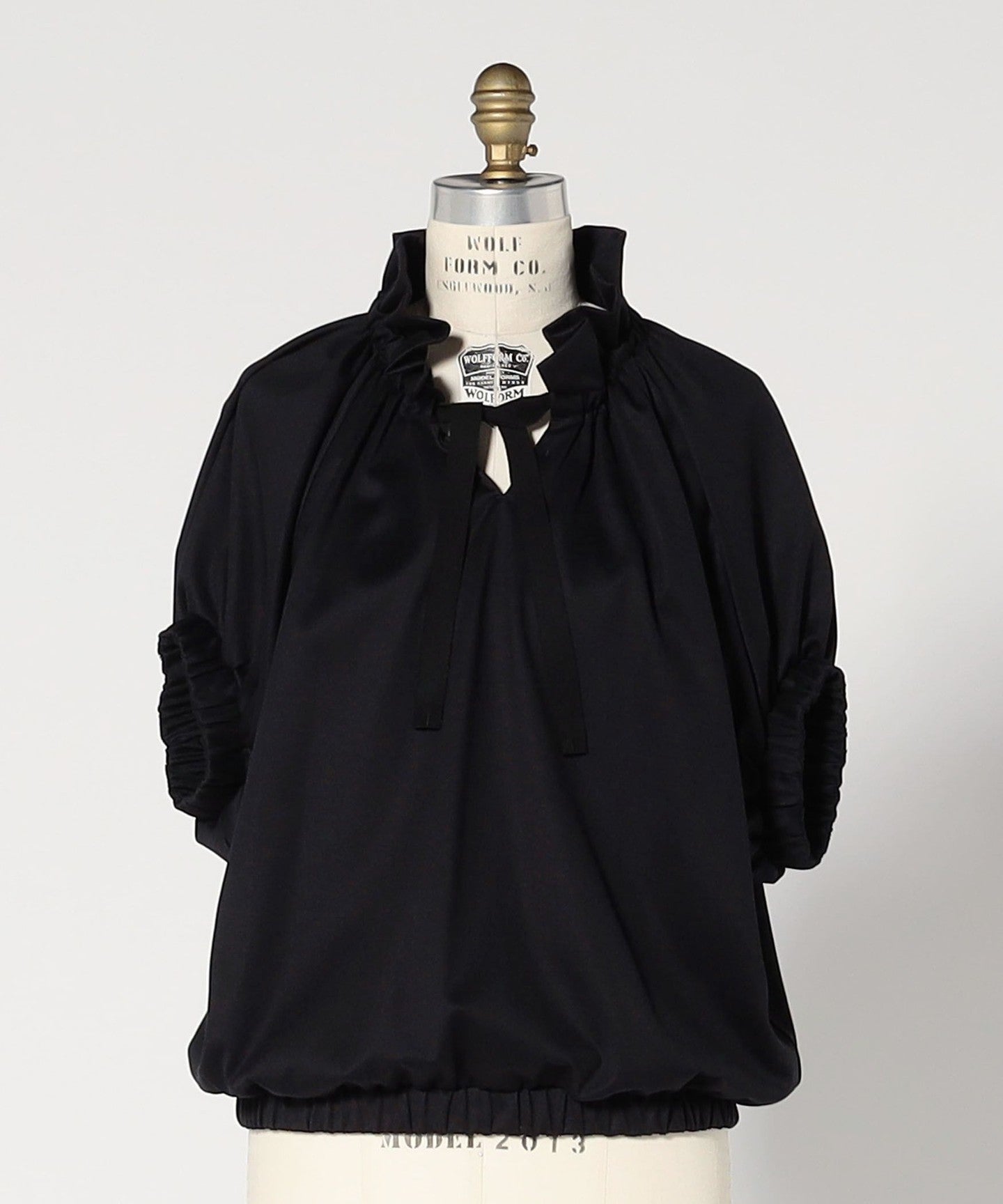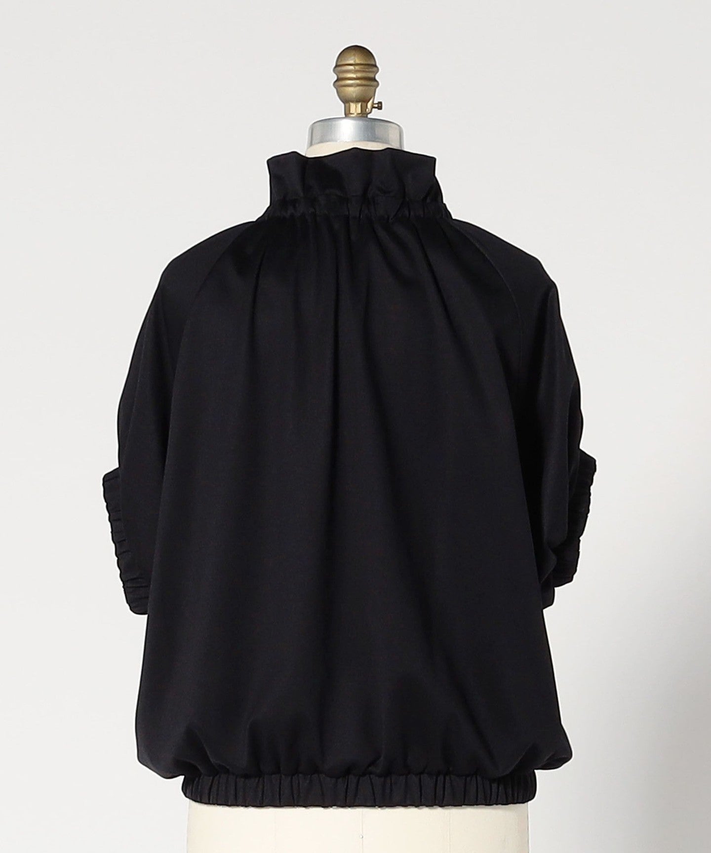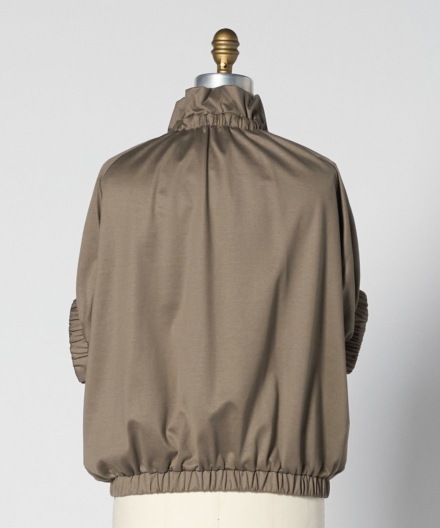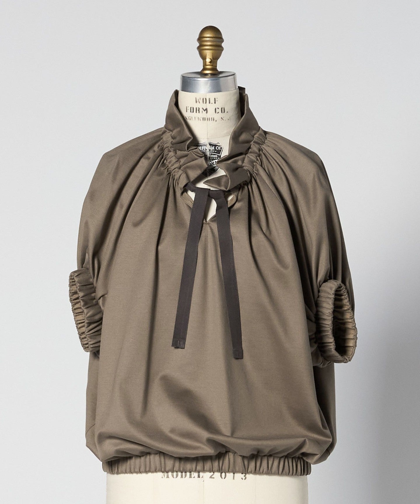 The design features gathered elastic at the collar, cuffs, and hem, making it look like a blouse even though it is a cut-and-sew item.