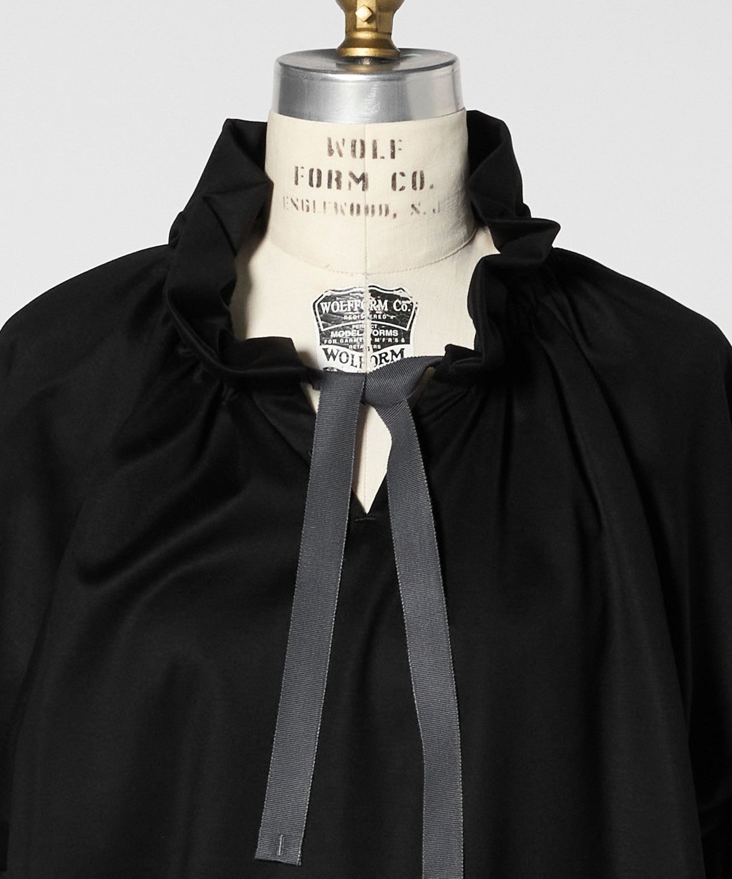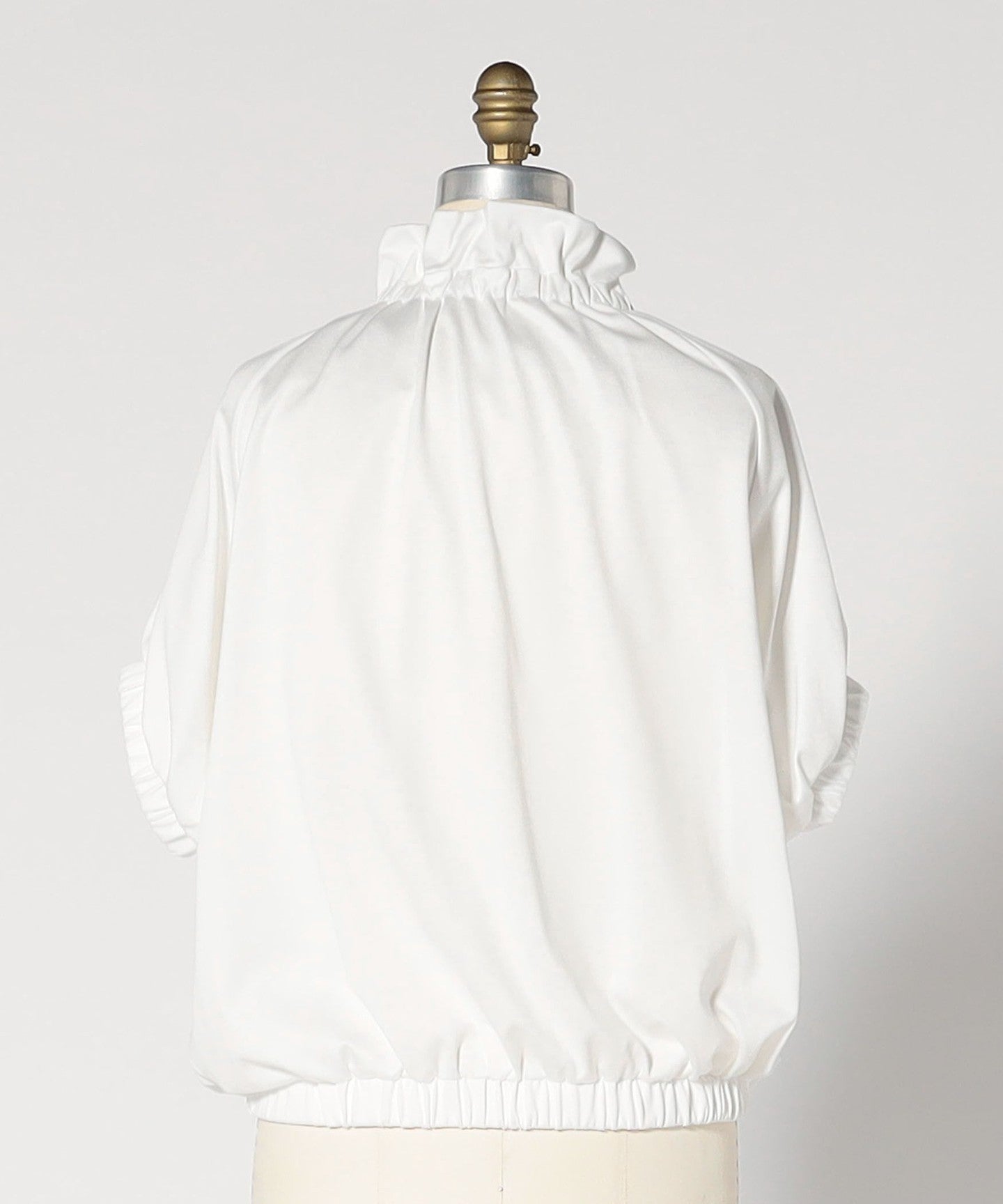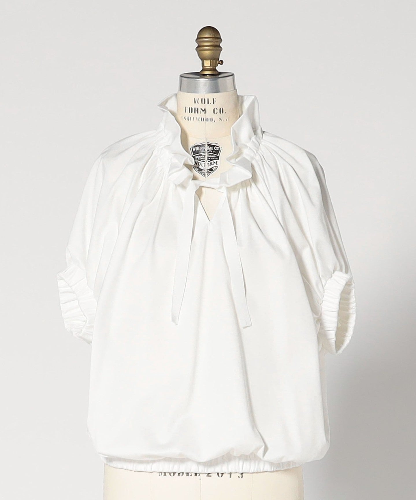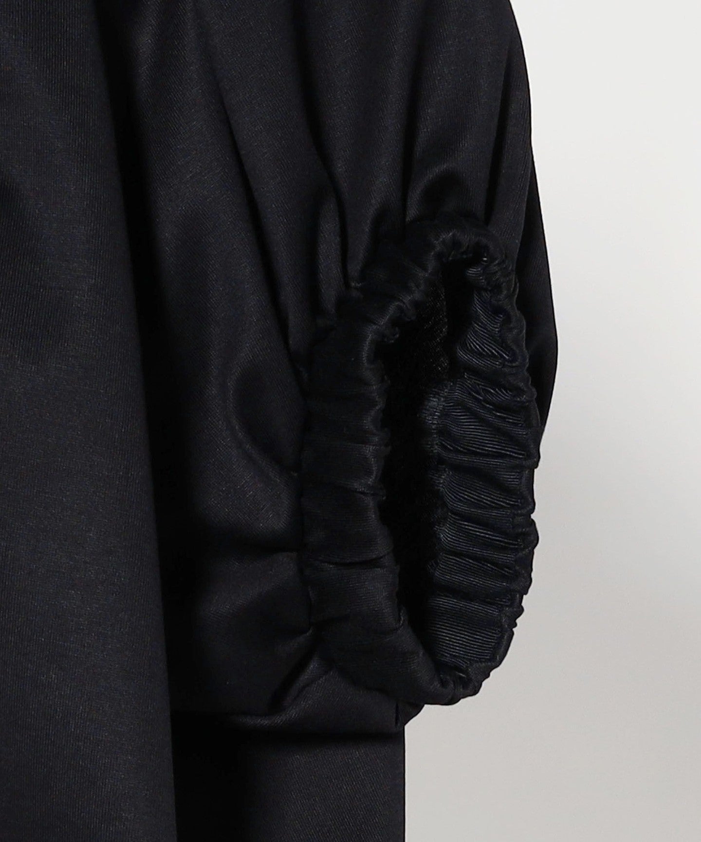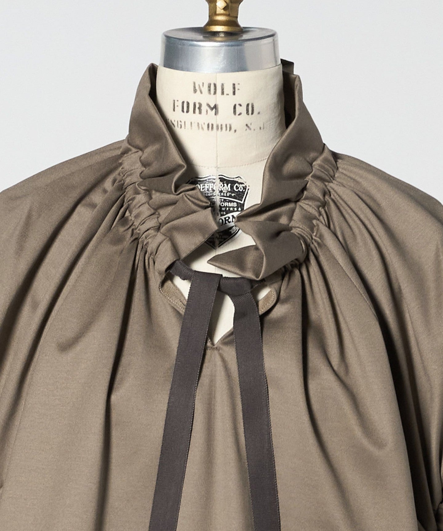 The design features gathered elastic at the collar, cuffs, and hem, making it look like a blouse even though it is a cut-and-sew item.