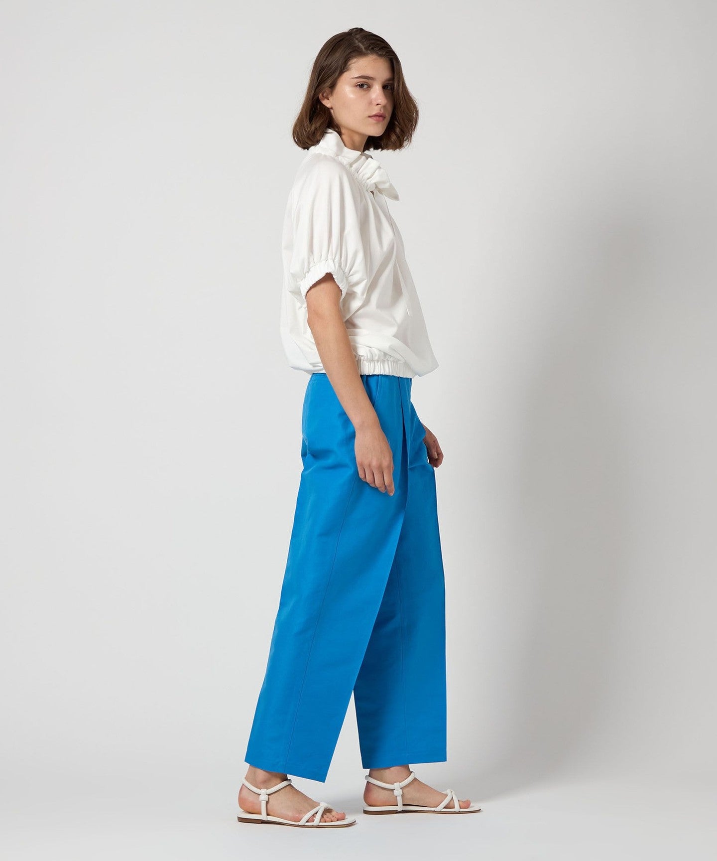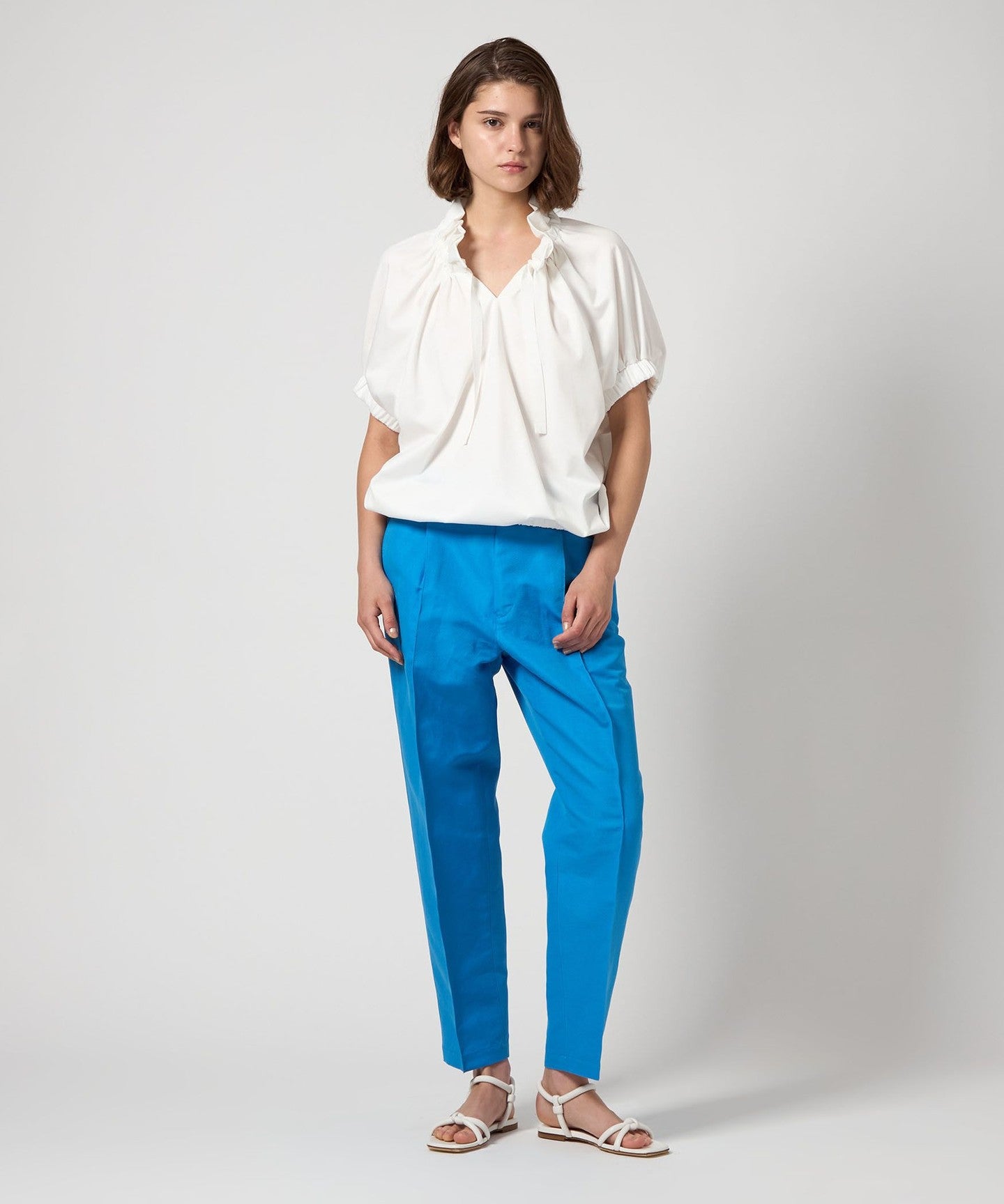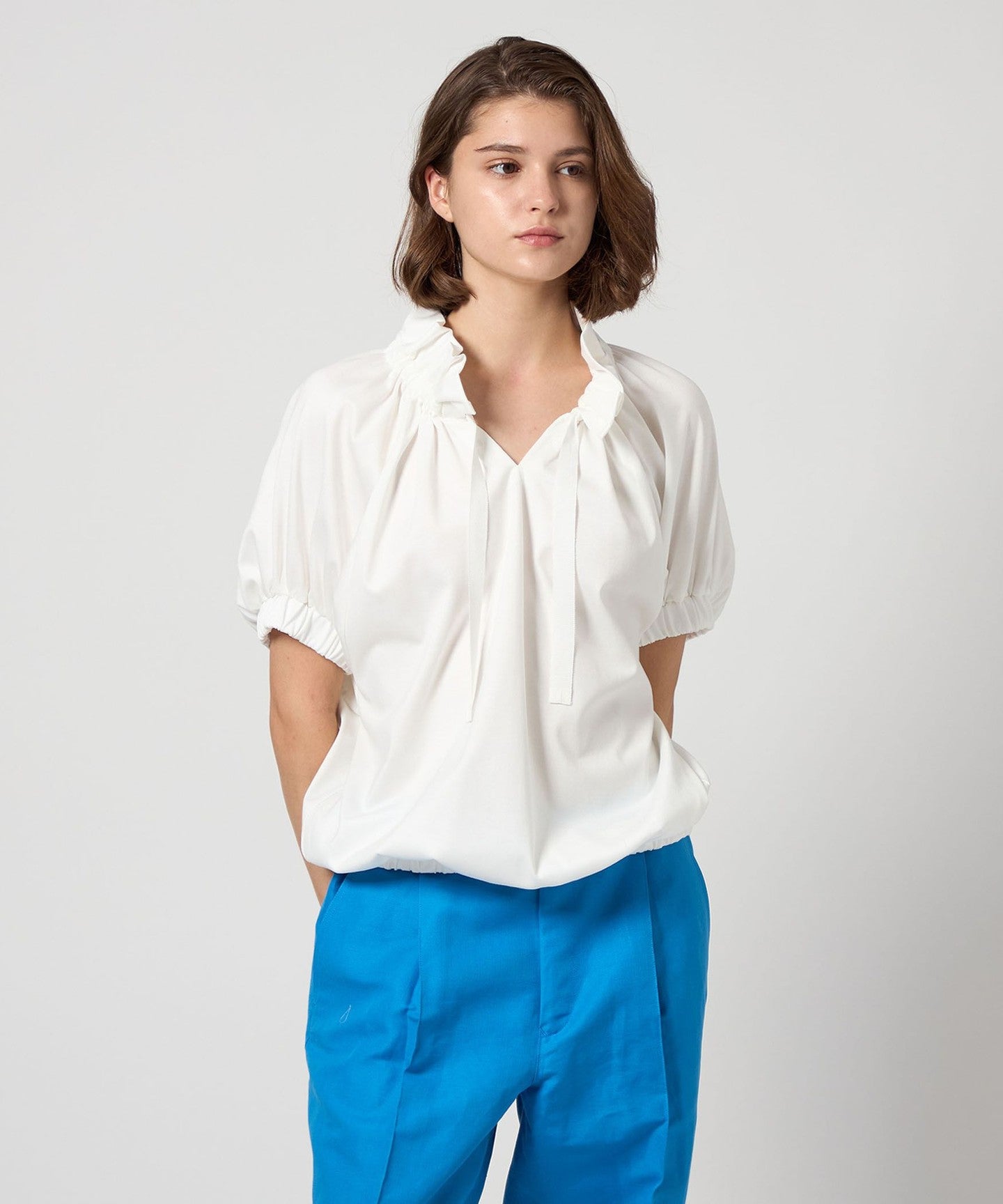 This cut-and-sew blouse takes advantage of the body's moderate volume and has gathered fabric to create a silhouette that sits away from the skin.