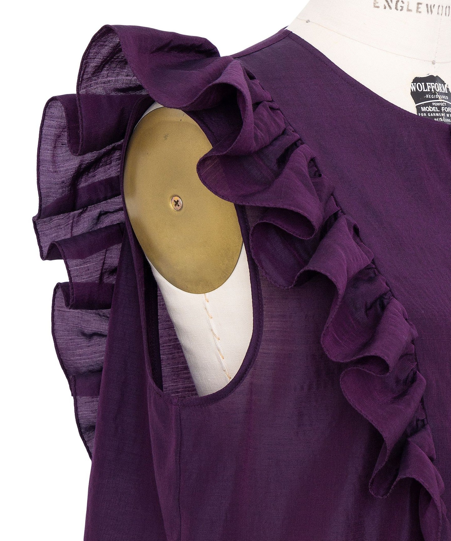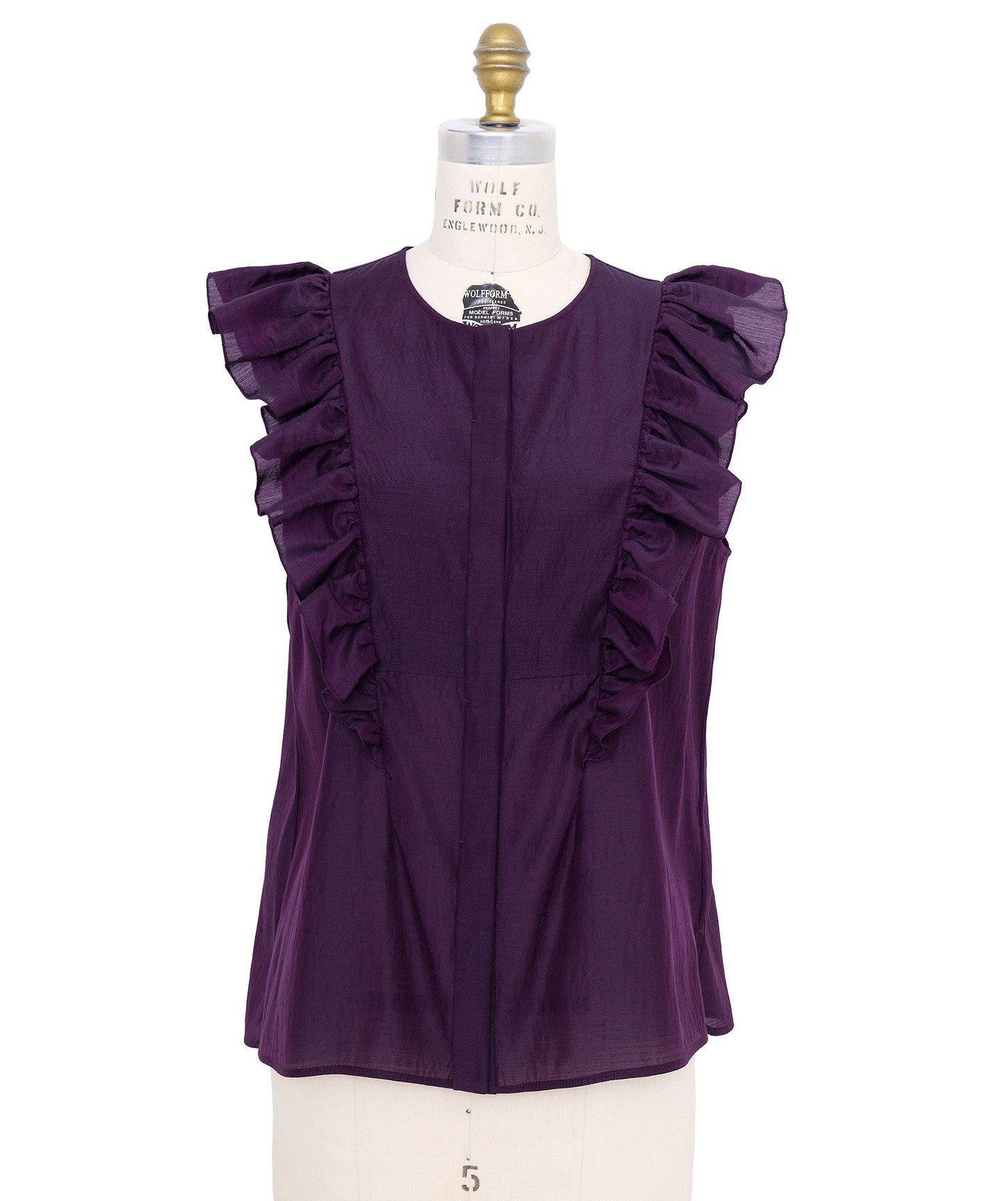 The generous ruffle design wraps around the sleeve line, giving the blouse an elegant look while still maintaining the lightness of a sleeveless top.