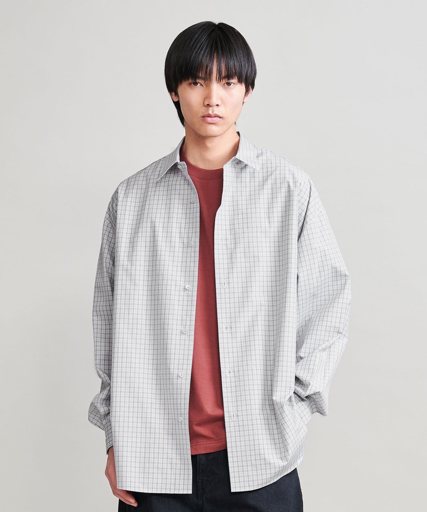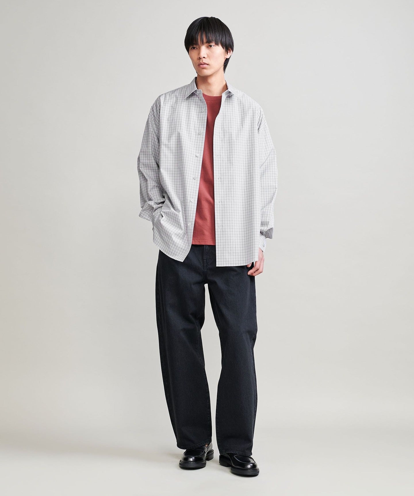 This shirt is crafted from high-density 120/2 broadcloth from Borghi, a long-established Italian fabric manufacturer. The firm, thick fabric beautifully complements the slightly oversized, dynamic silhouette. It features a French front closure and a compact, regular collar with a narrow spread. The sleeves are double-paneled and feature no hem, creating an outerwear-like look. While simple, its stylish appearance sets it apart from ordinary shirts, creating a special mood. This is a recommended piece that will create a sophisticated, clean look with just a casual throw.