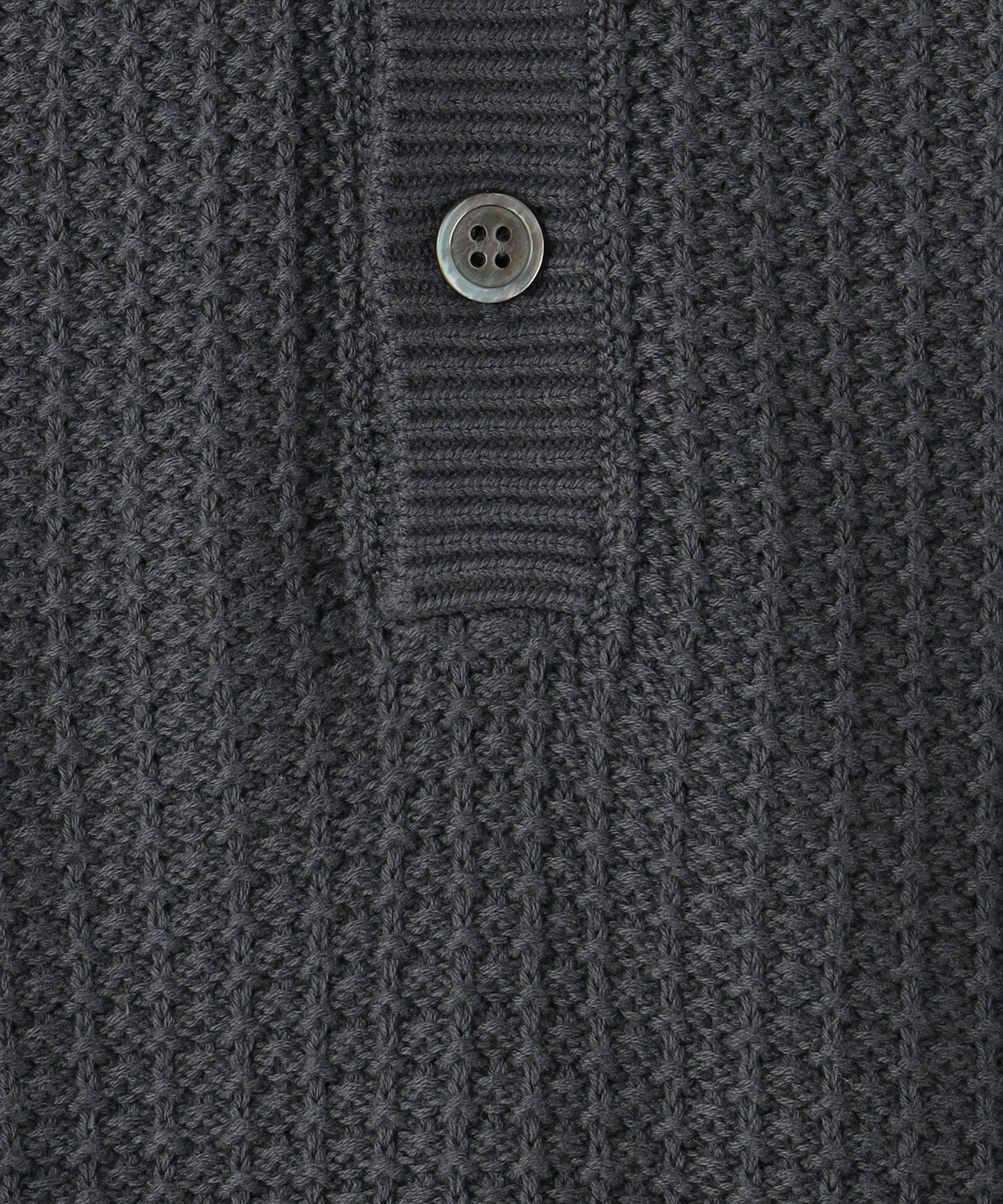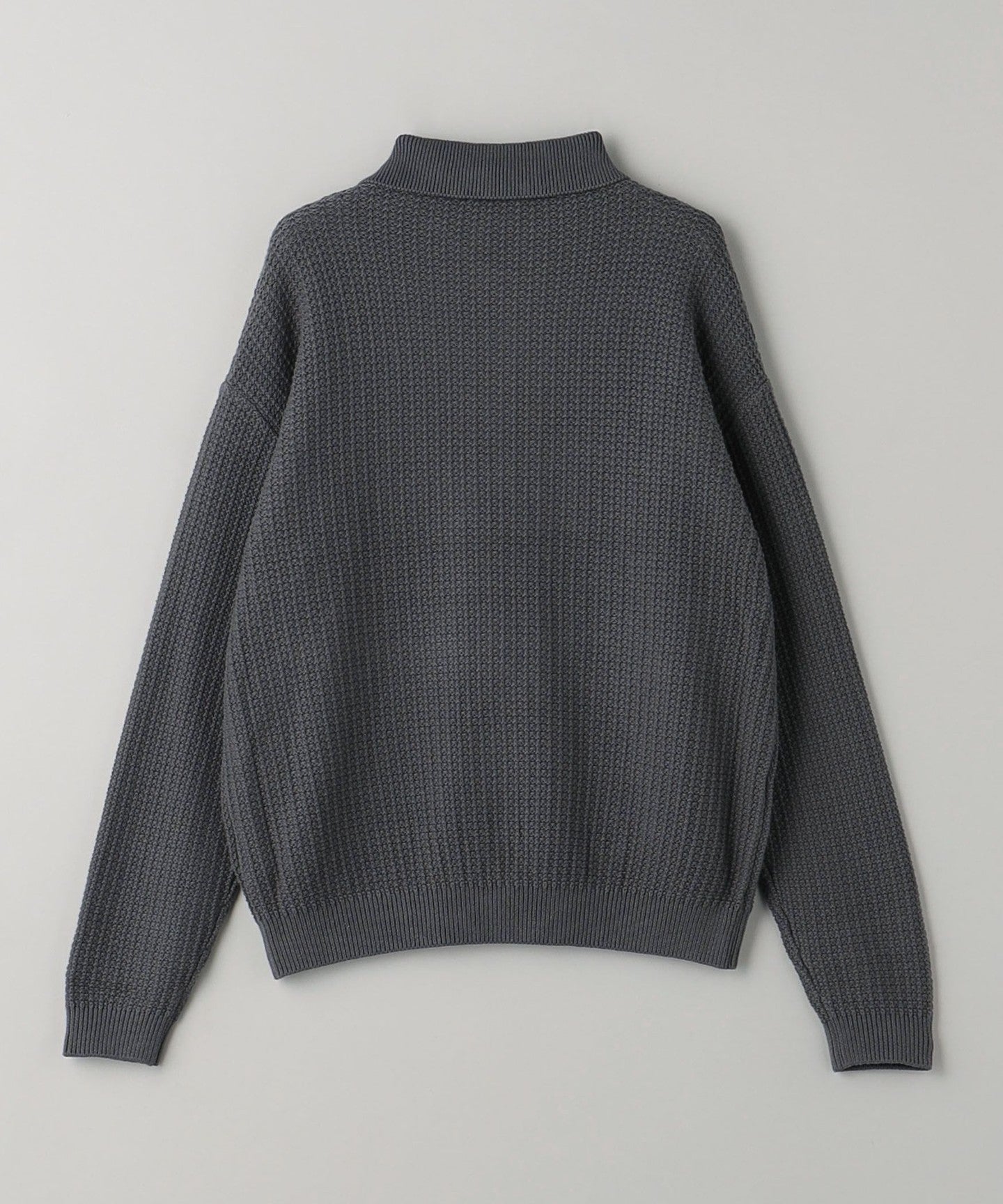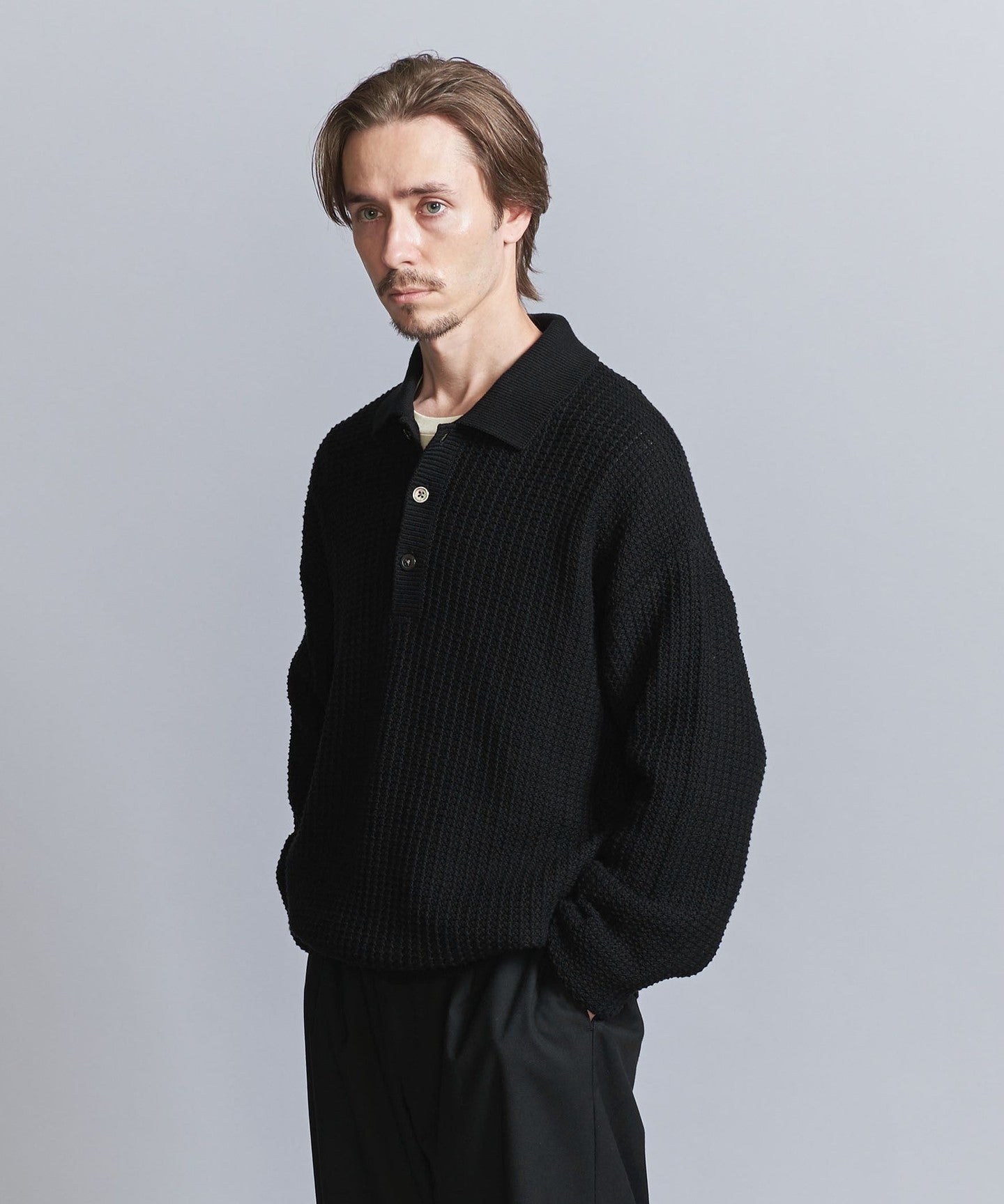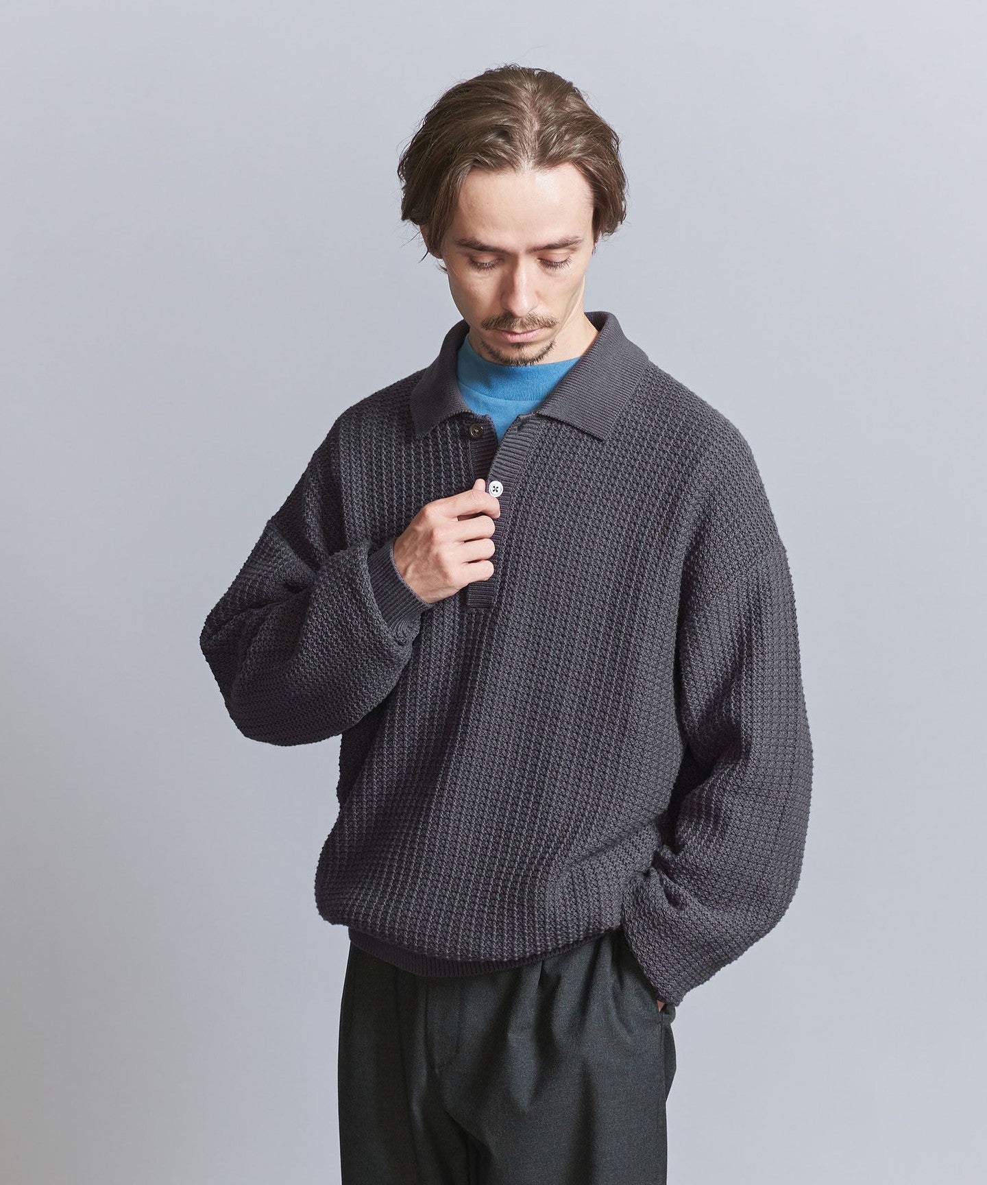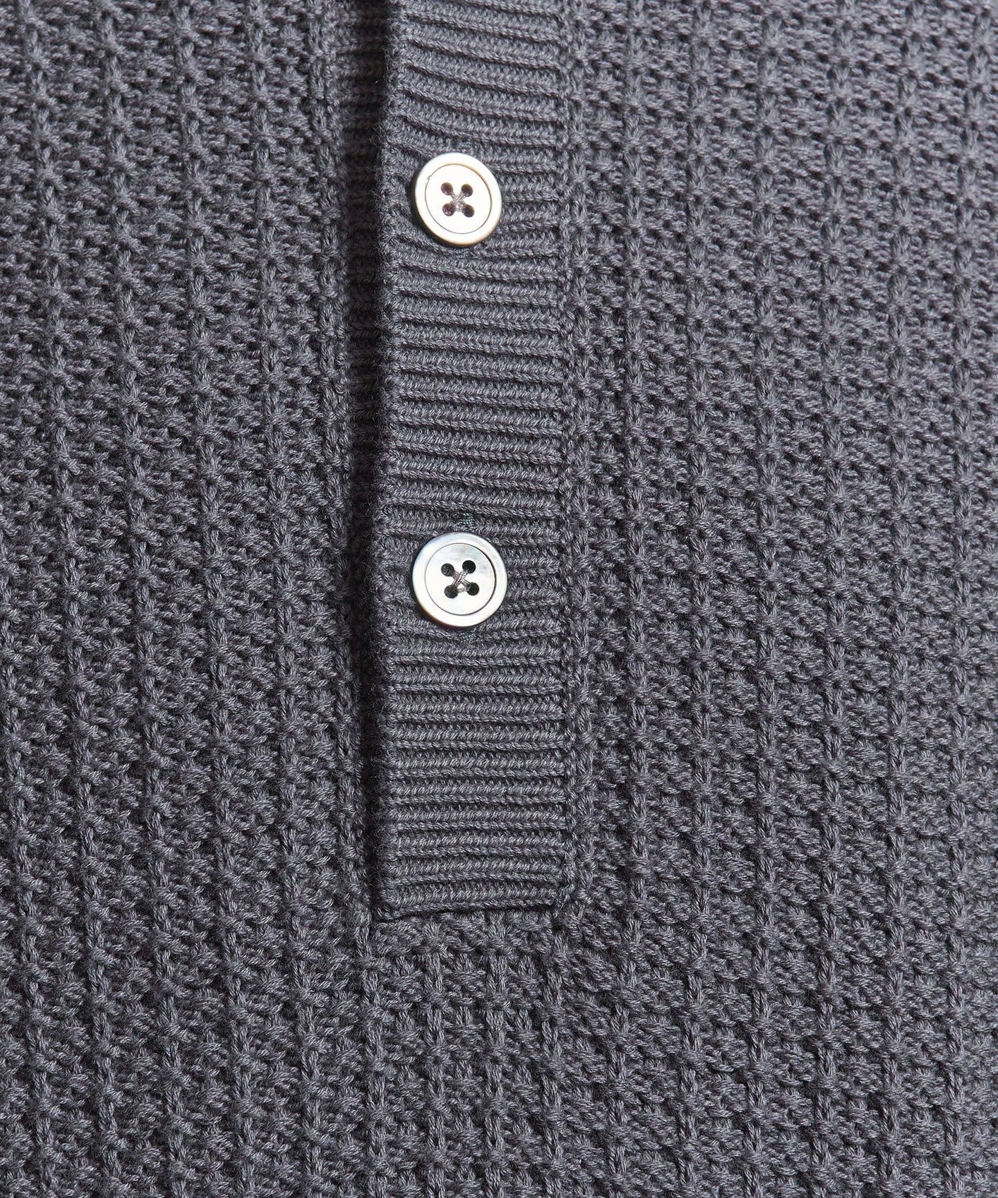 A knit polo shirt with a three-dimensional knit pattern and a special rib knit that resembles a checkered pattern.