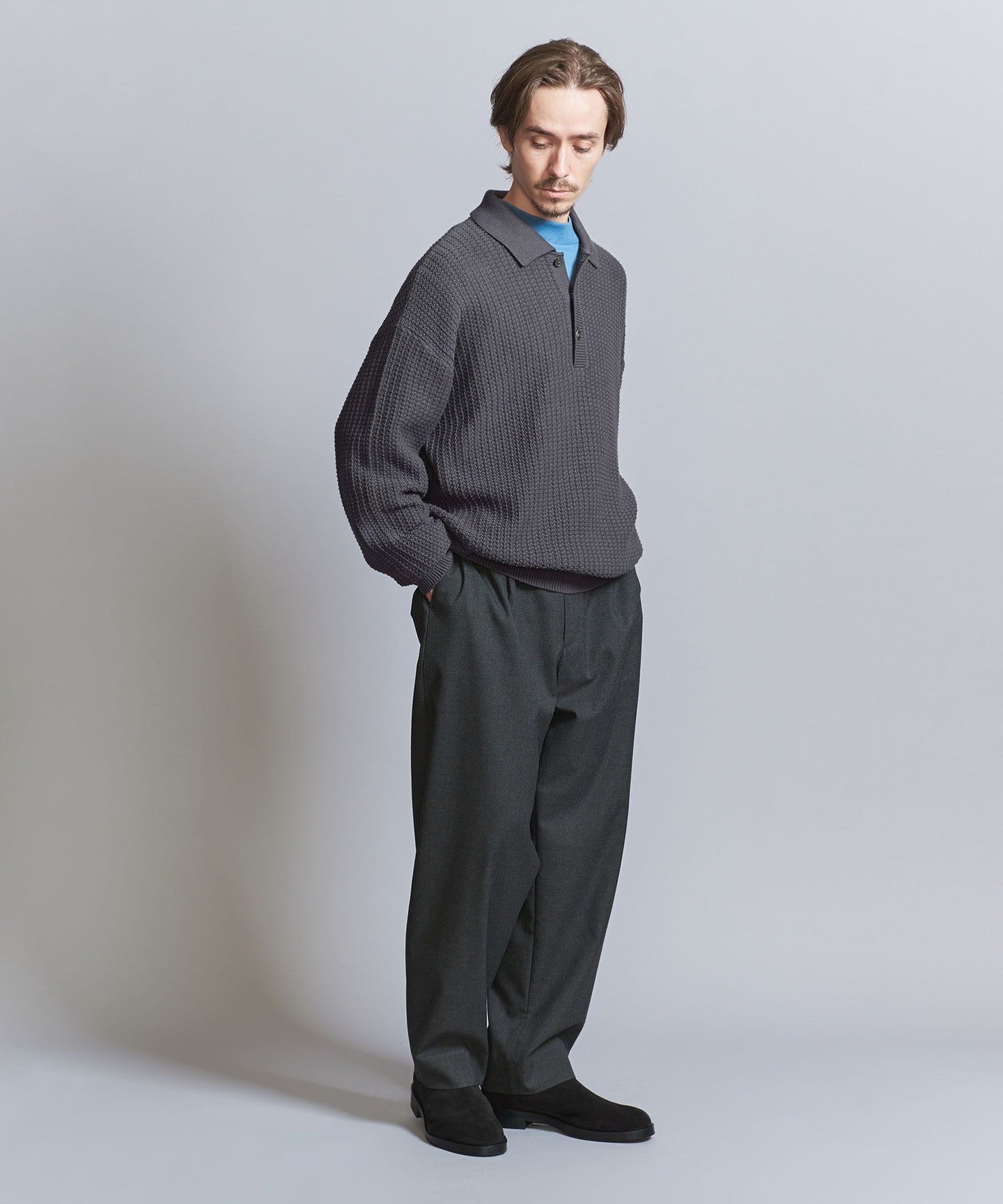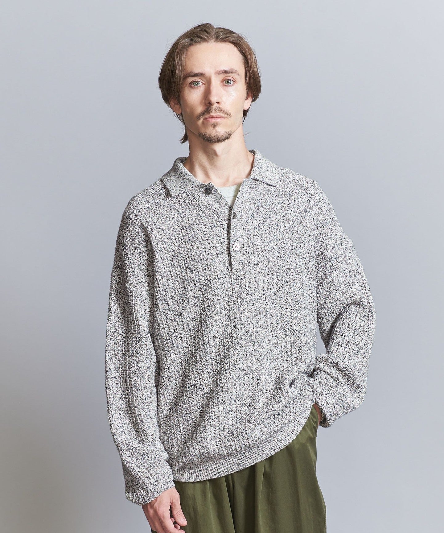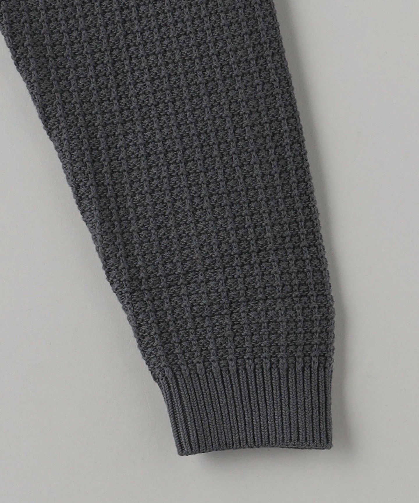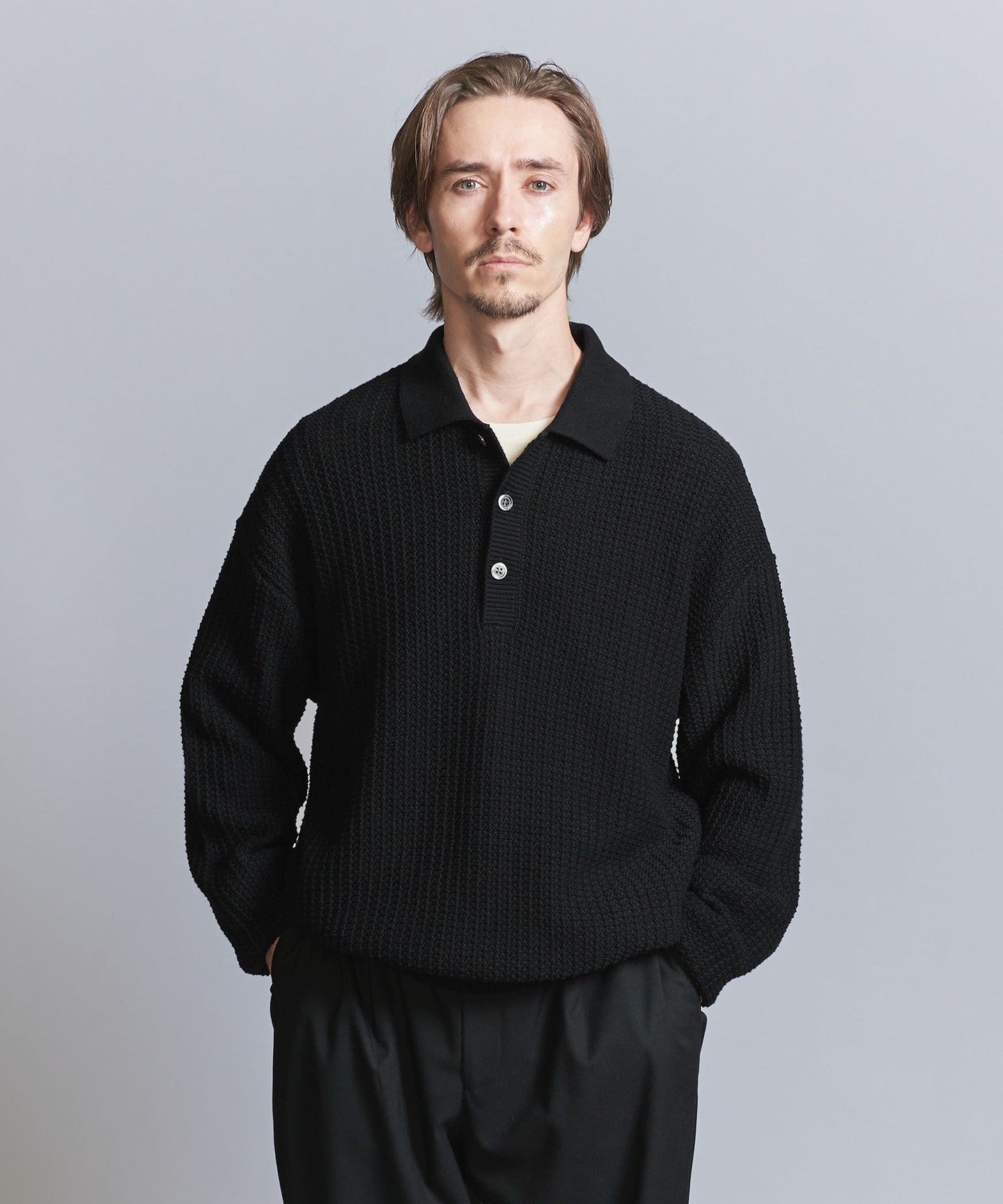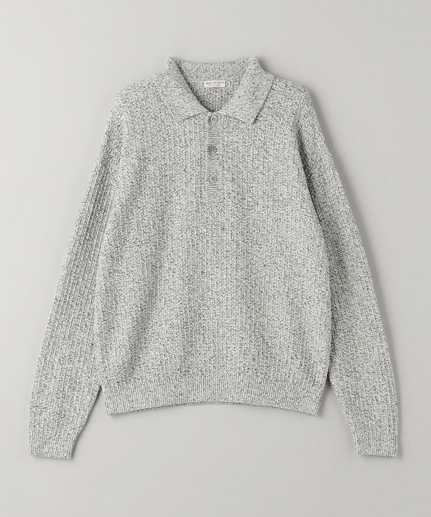 A knit polo shirt with a three-dimensional knit pattern and a special rib knit that resembles a checkered pattern.