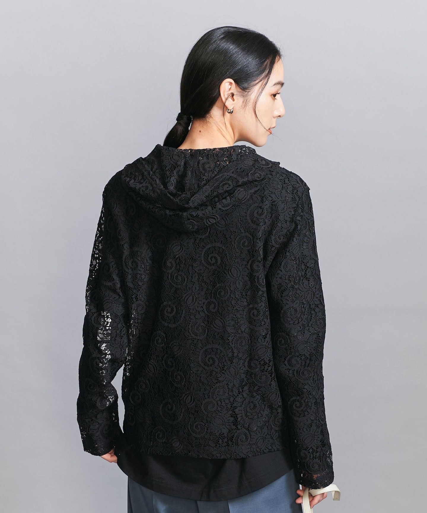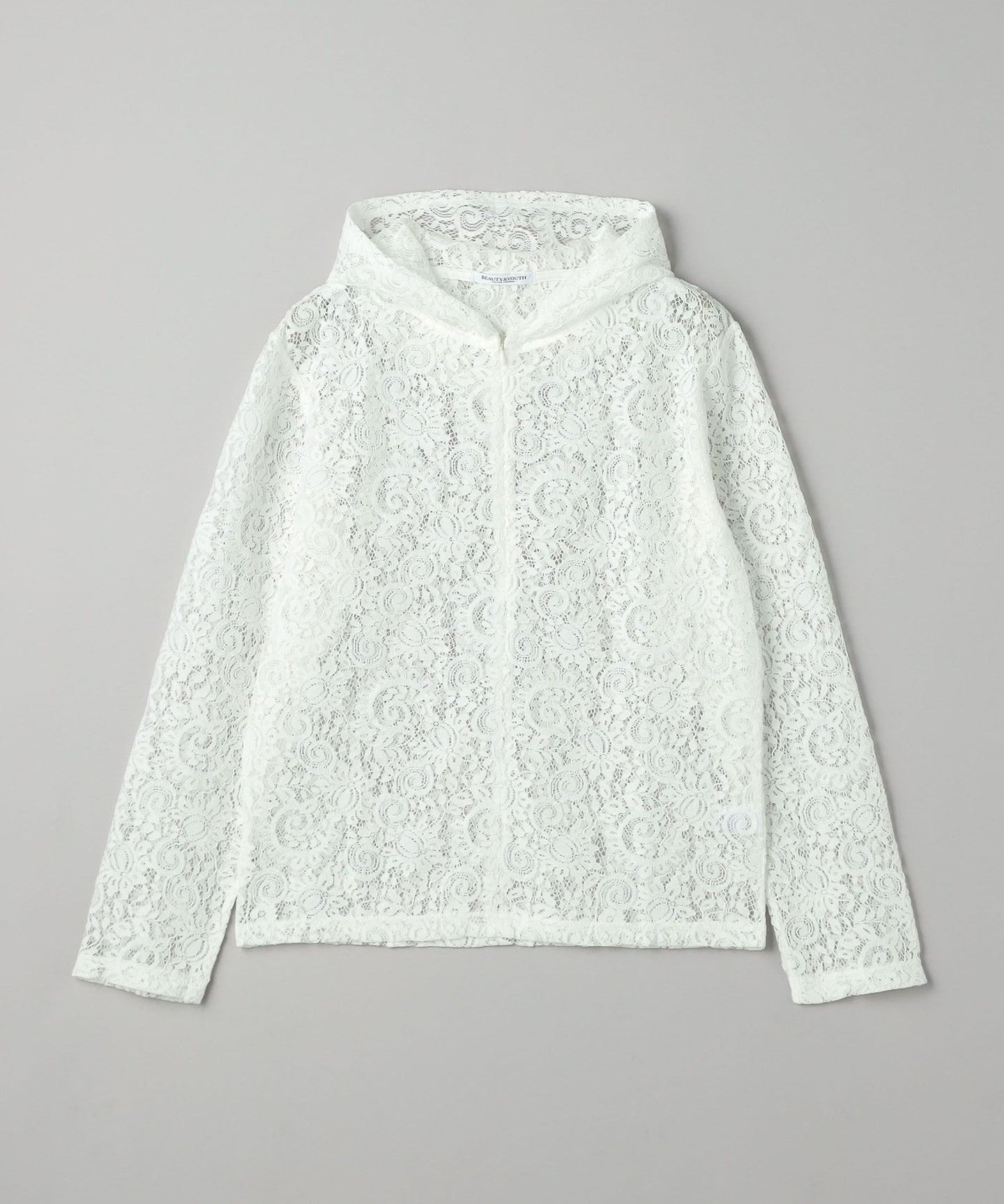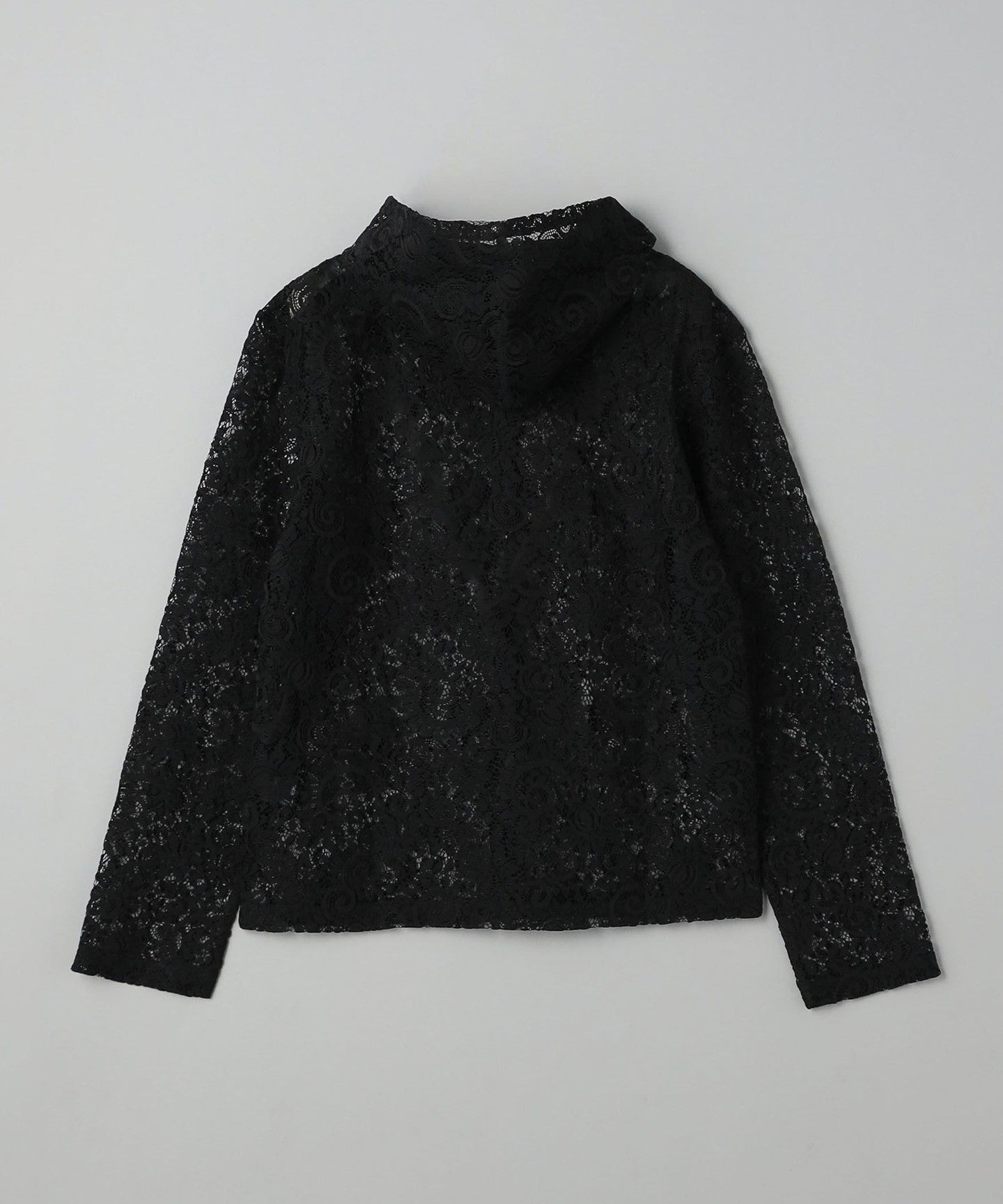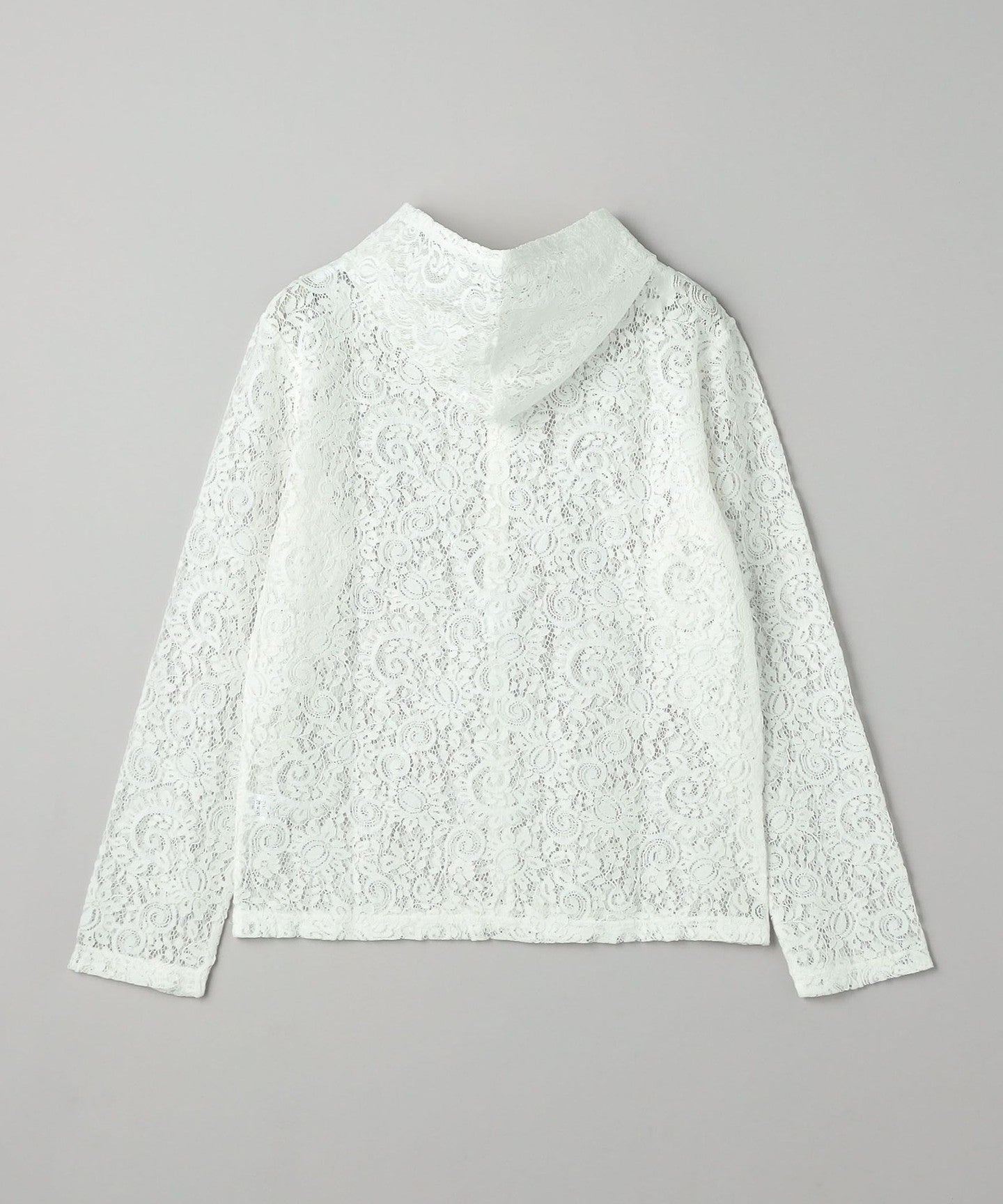 A casual hoodie-style top made from dressy lace material.