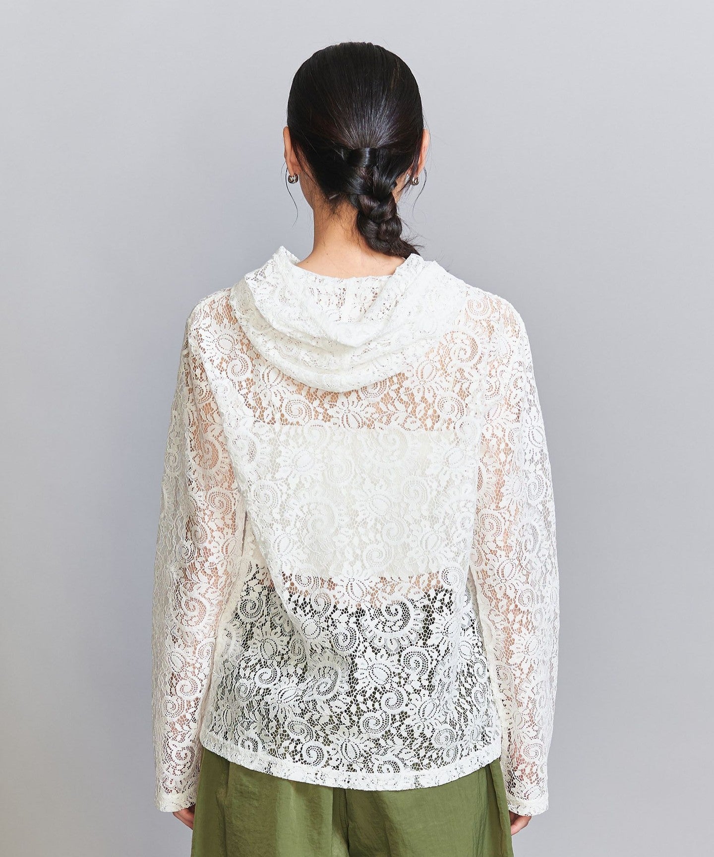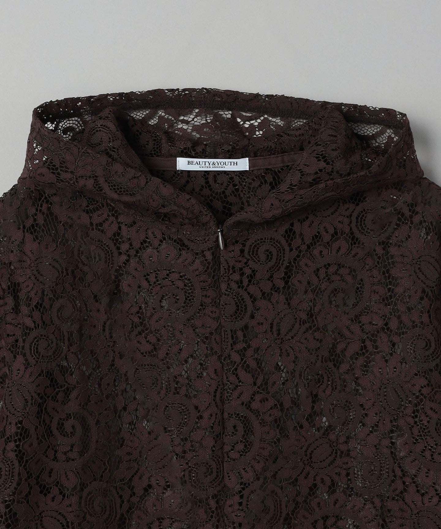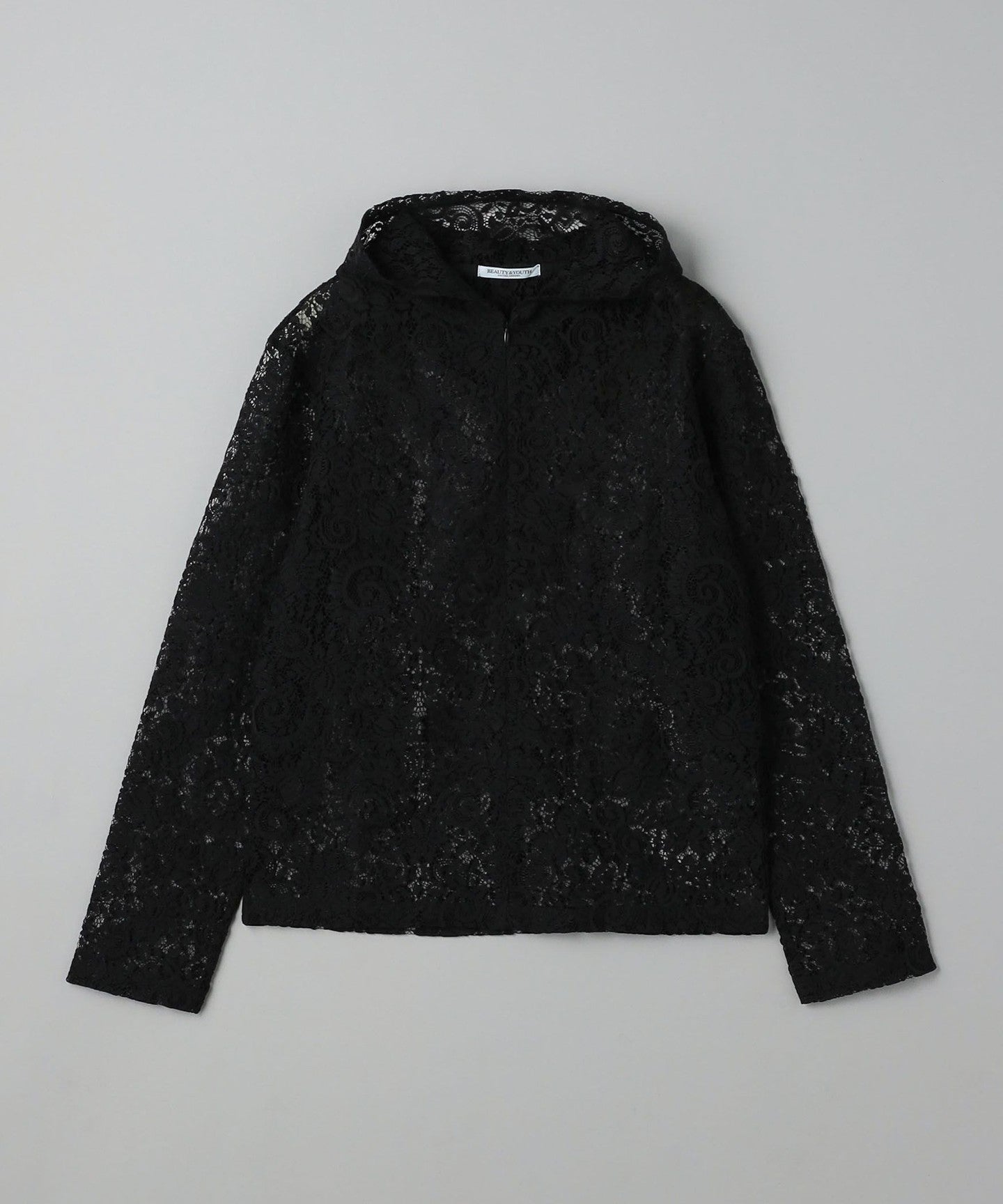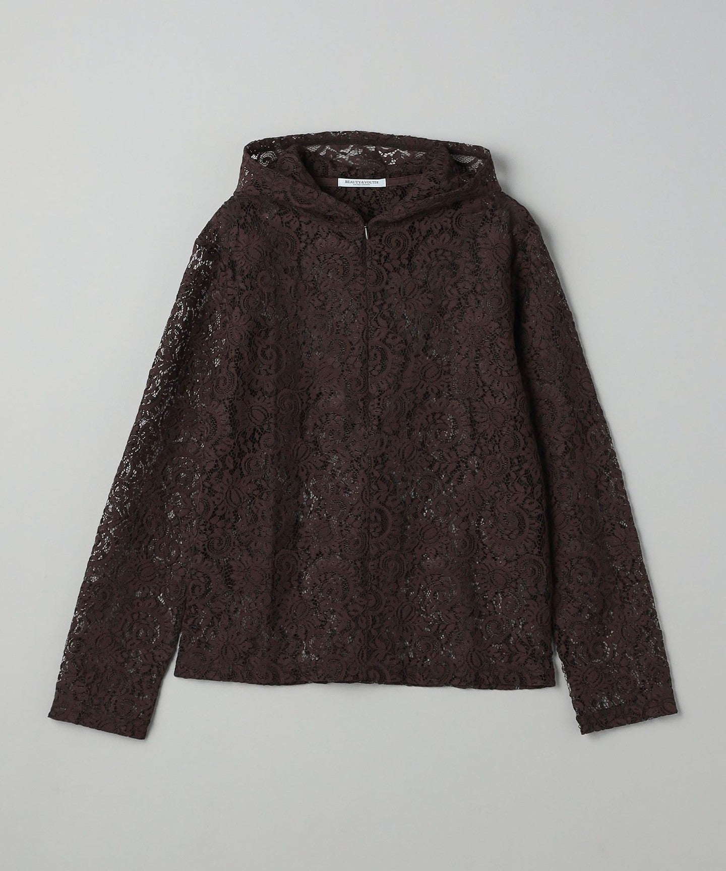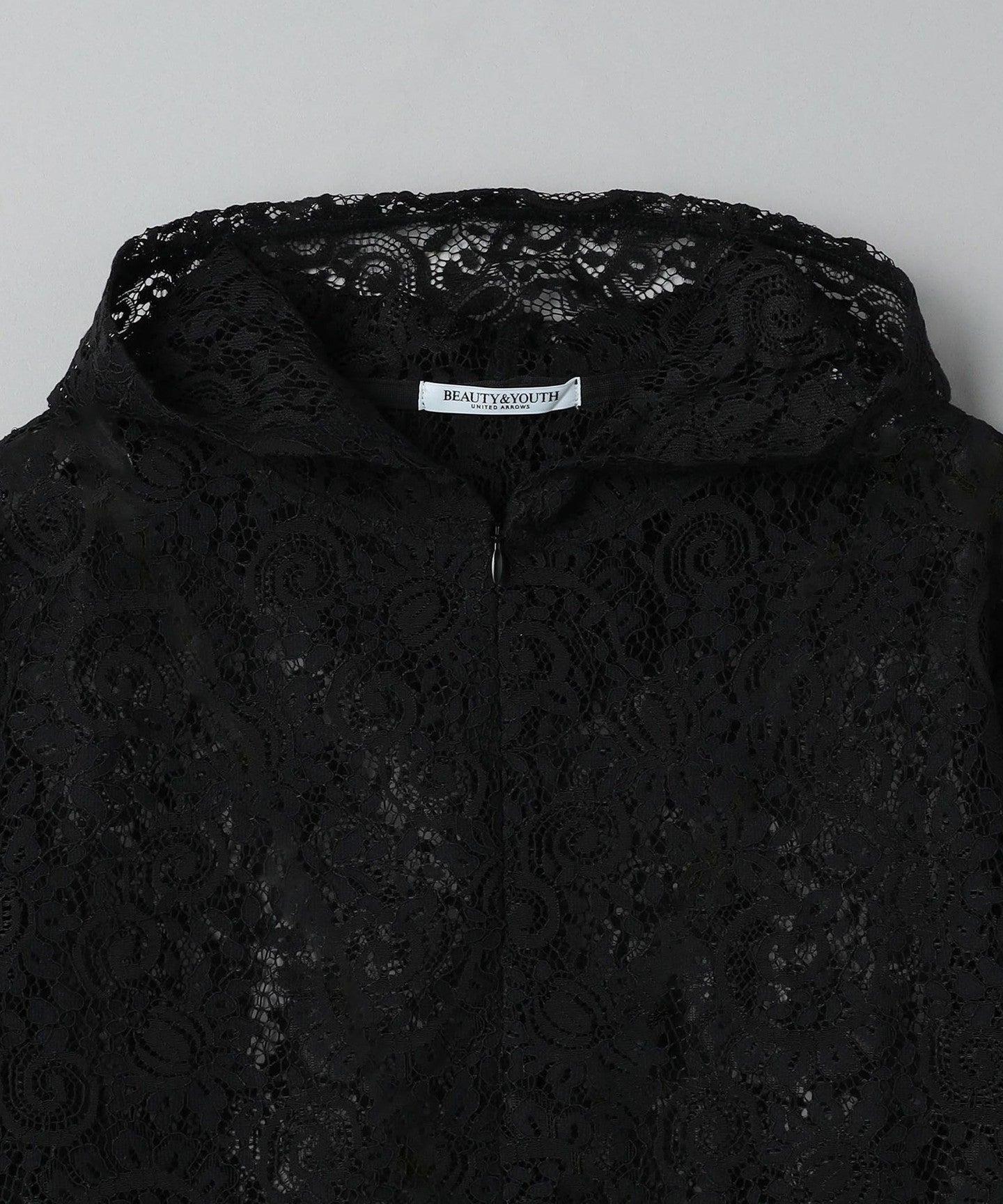 A casual hoodie-style top made from dressy lace material.