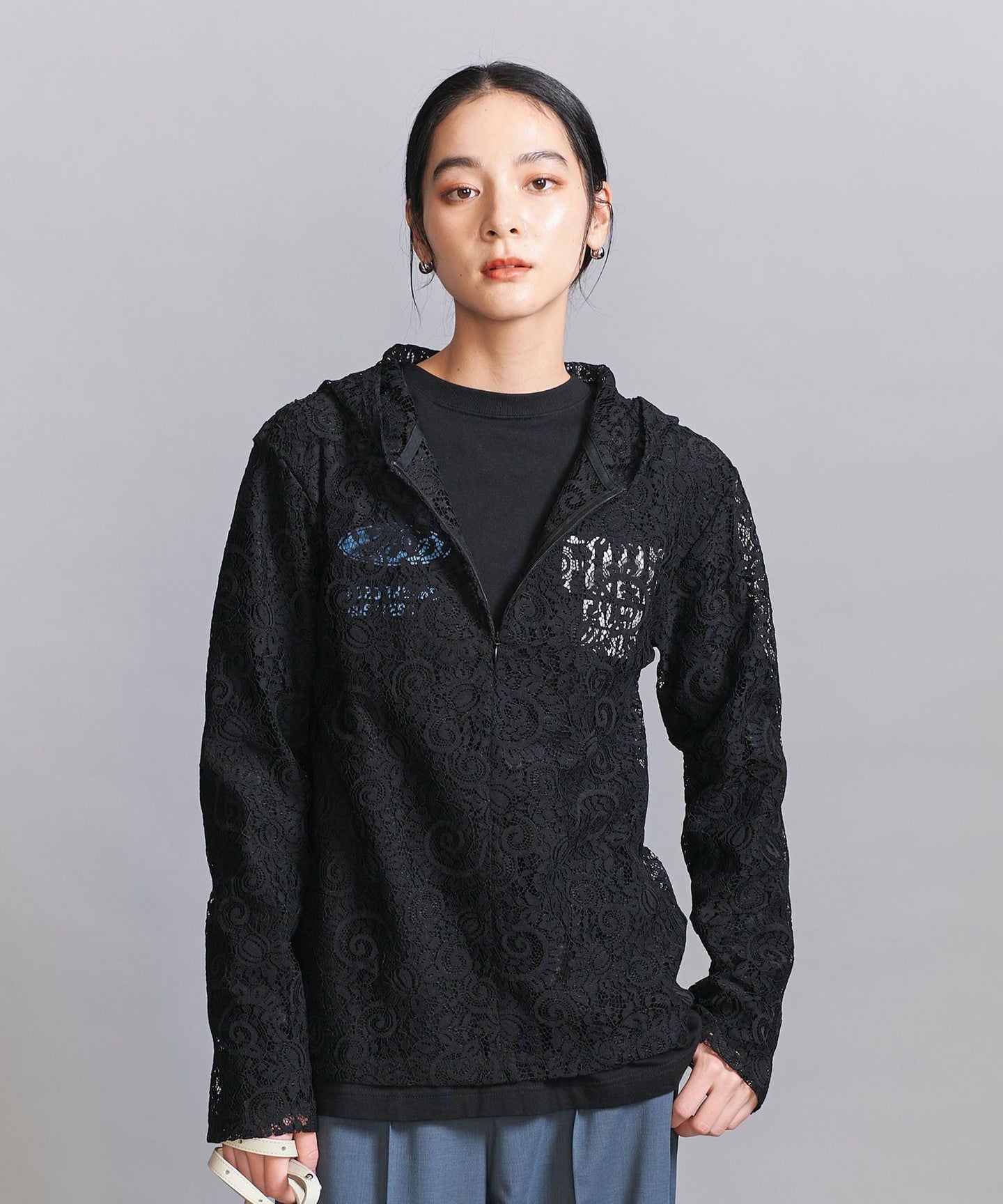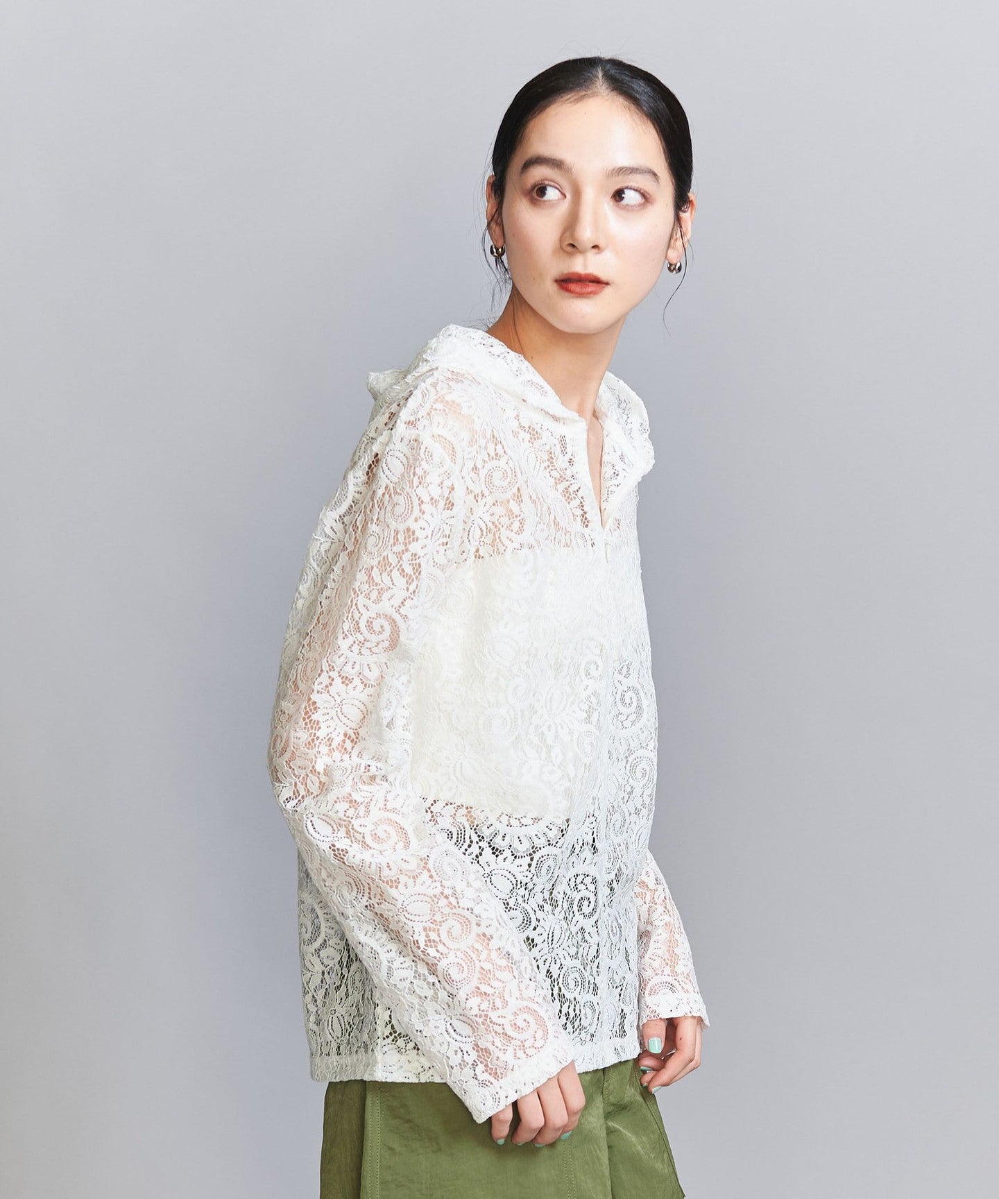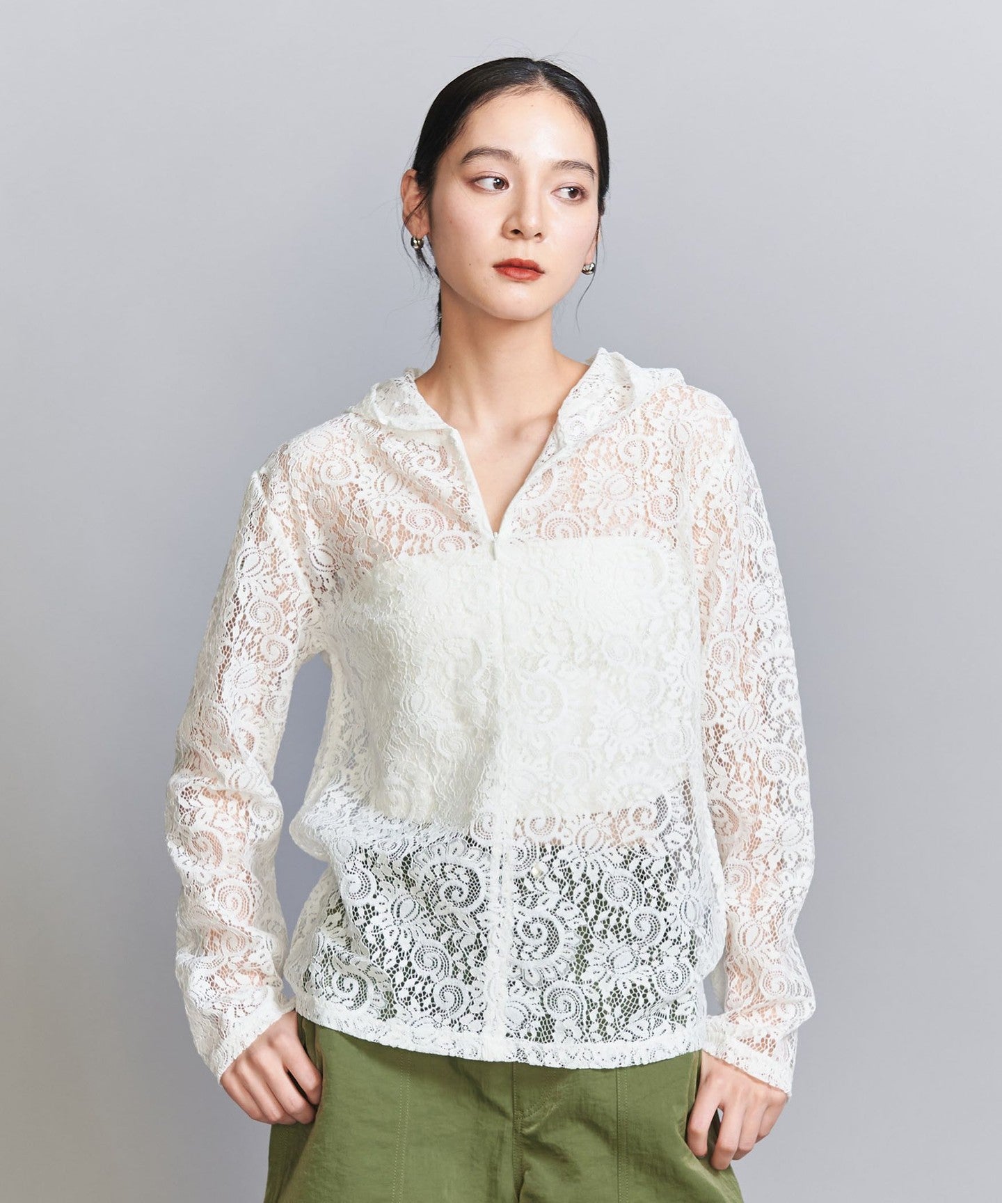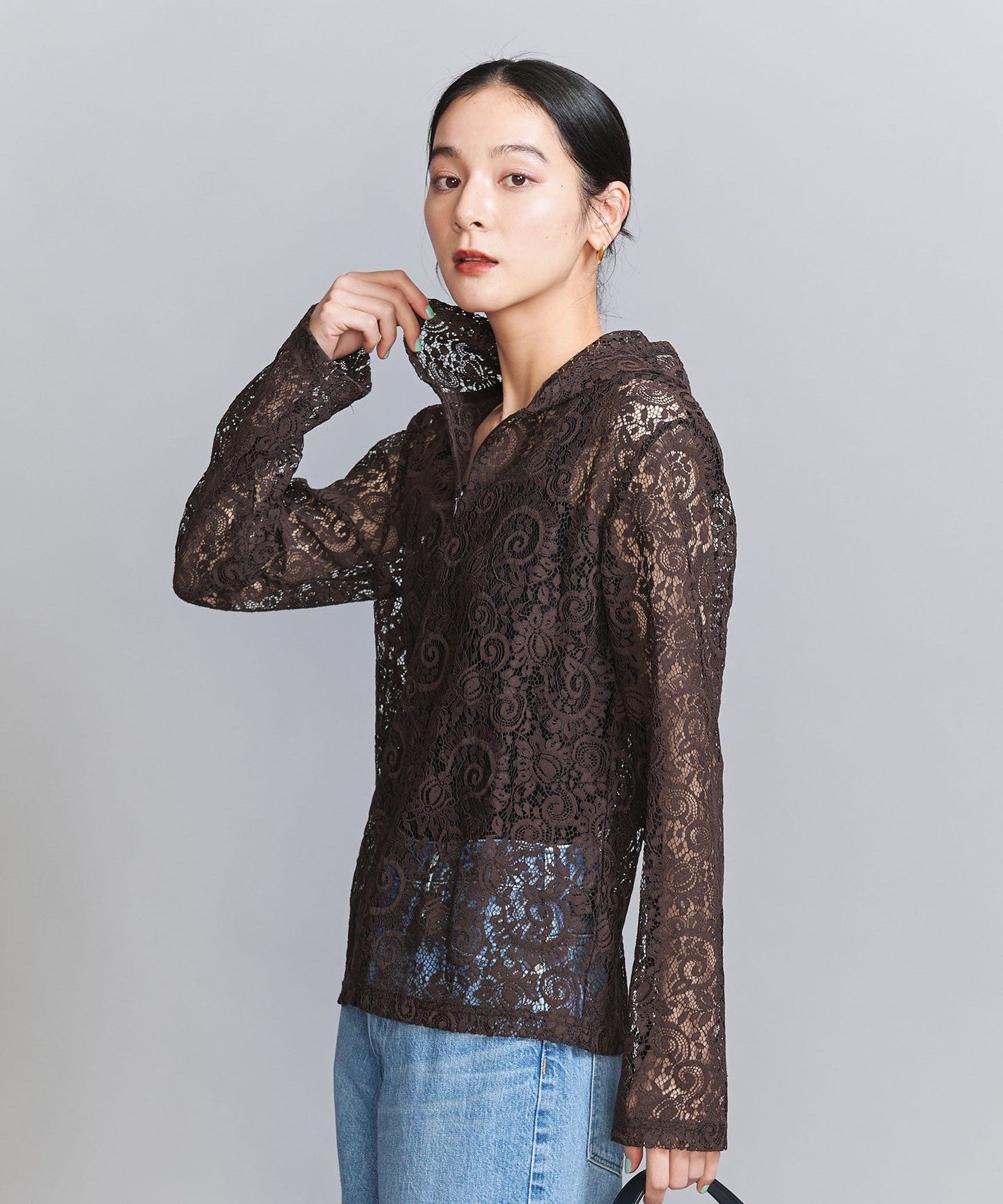 A casual hoodie-style top made from dressy lace material.