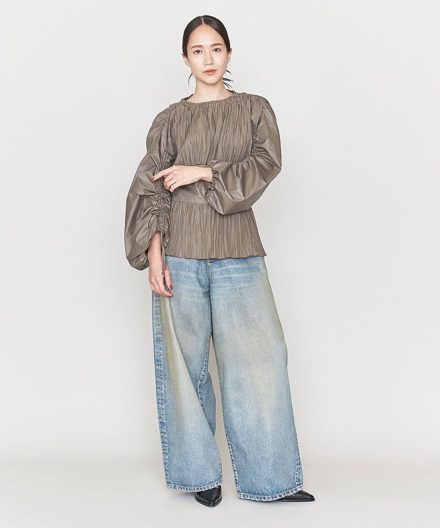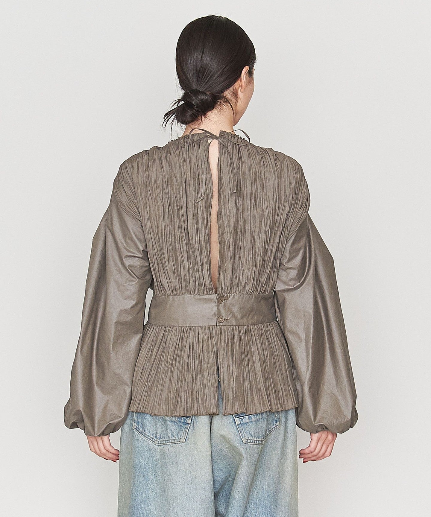 This blouse has a bold design with pleats on the body and gathered sleeves.