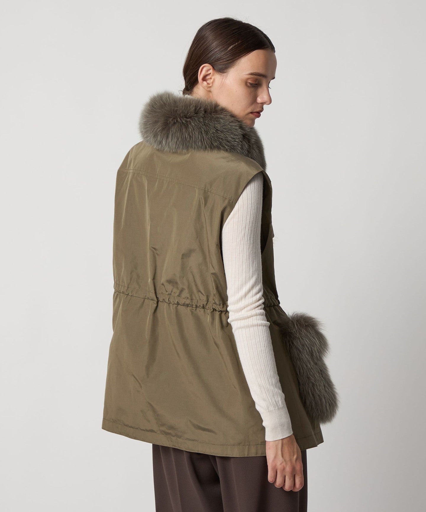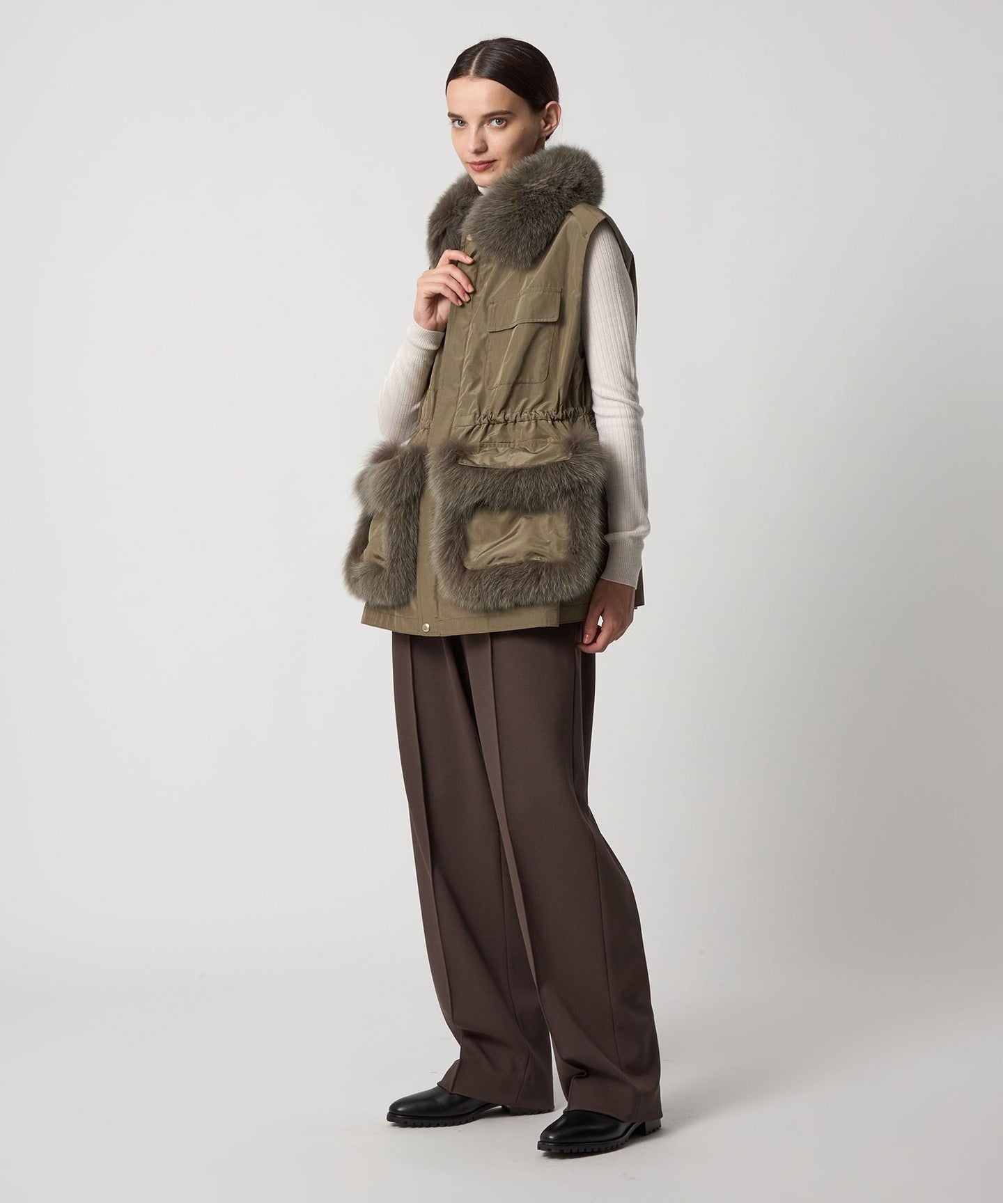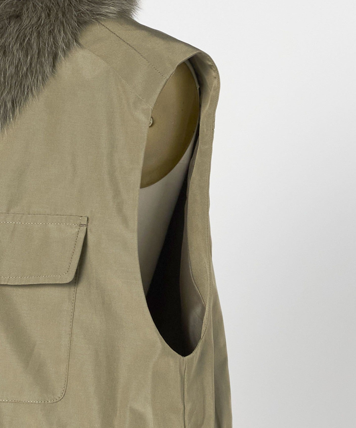 OLIVE:本体; 表生地;コットン67% シルク33% 裏生地;ポリエステル100% テープ部分;レーヨン100% ファー部分;毛皮(フォックス)