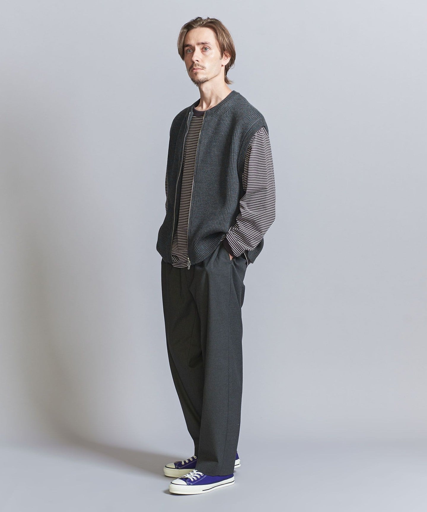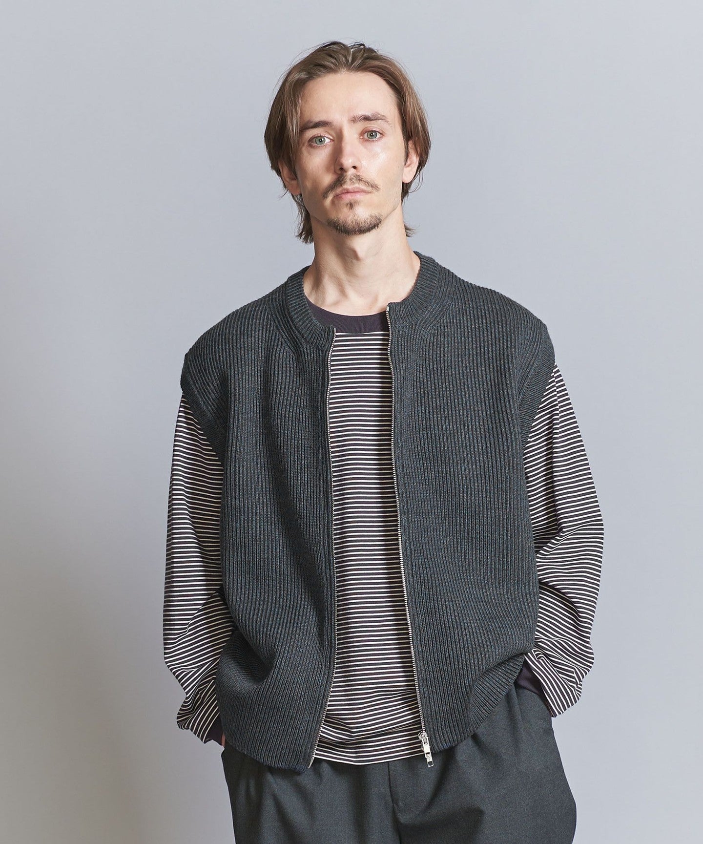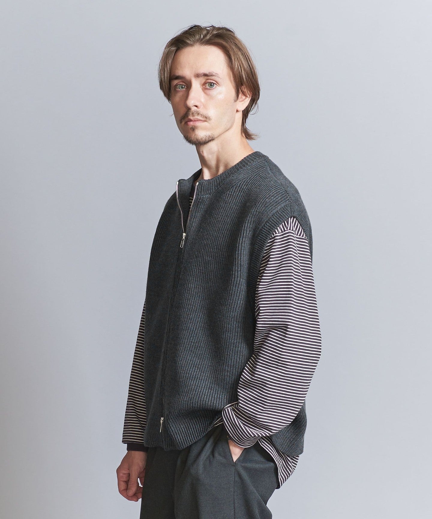 This knit zip vest is sure to be a great addition to any layered outfit, creating a sophisticated casual style.