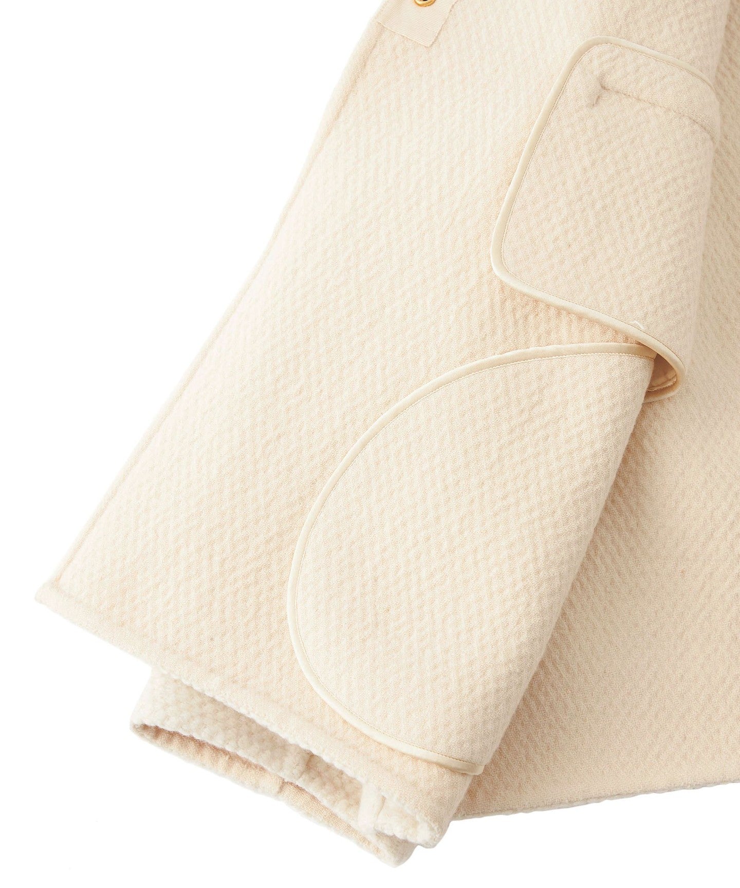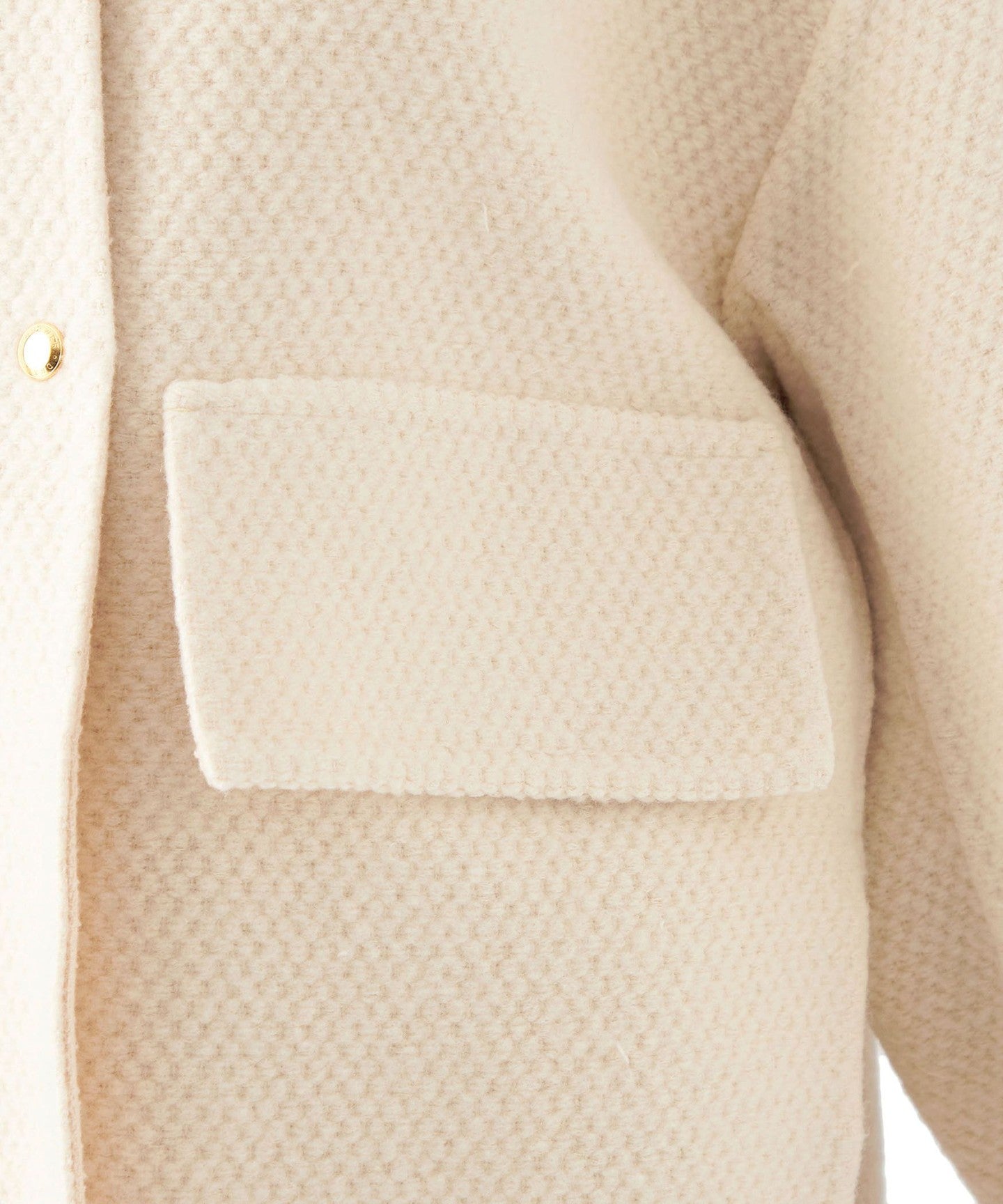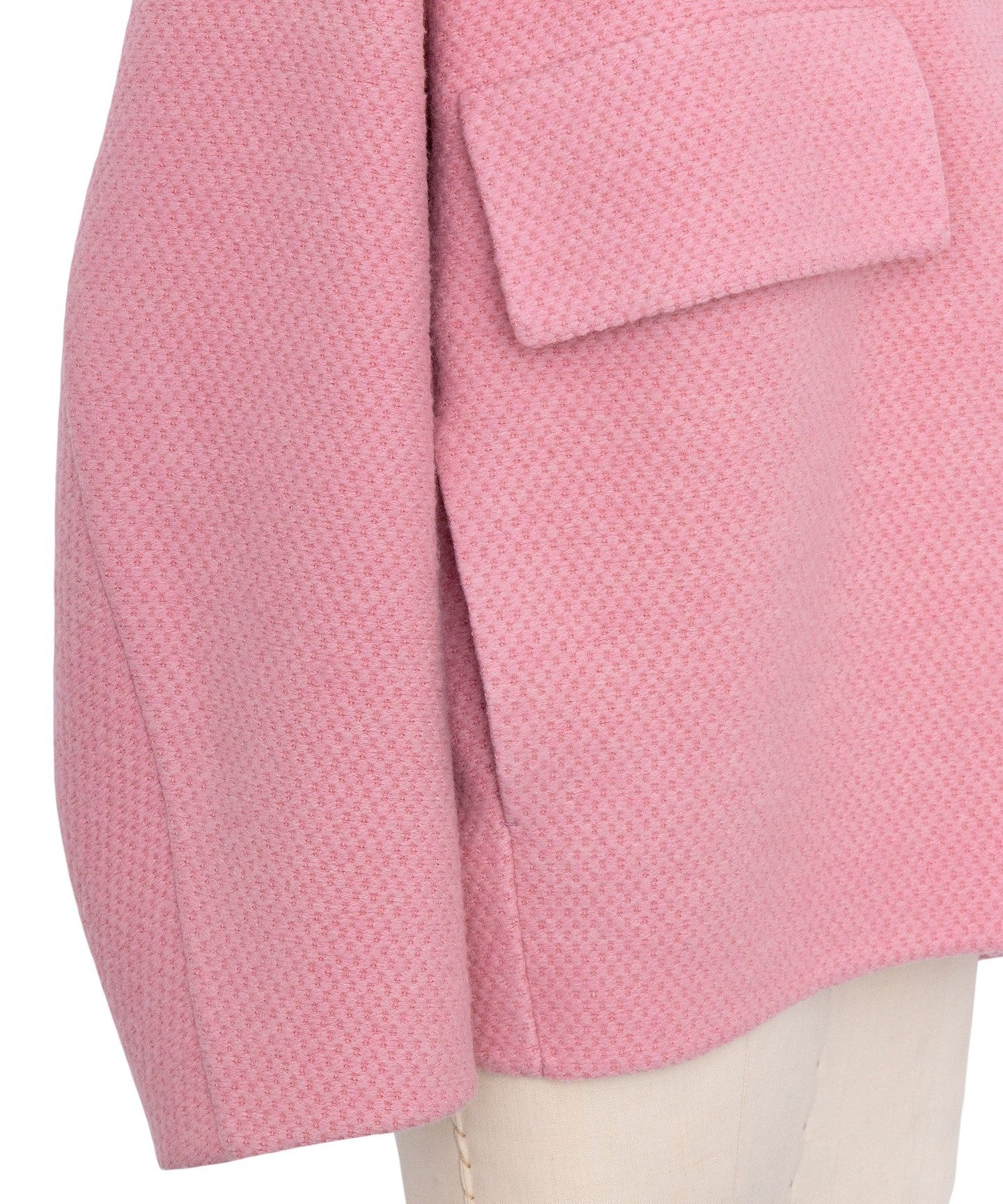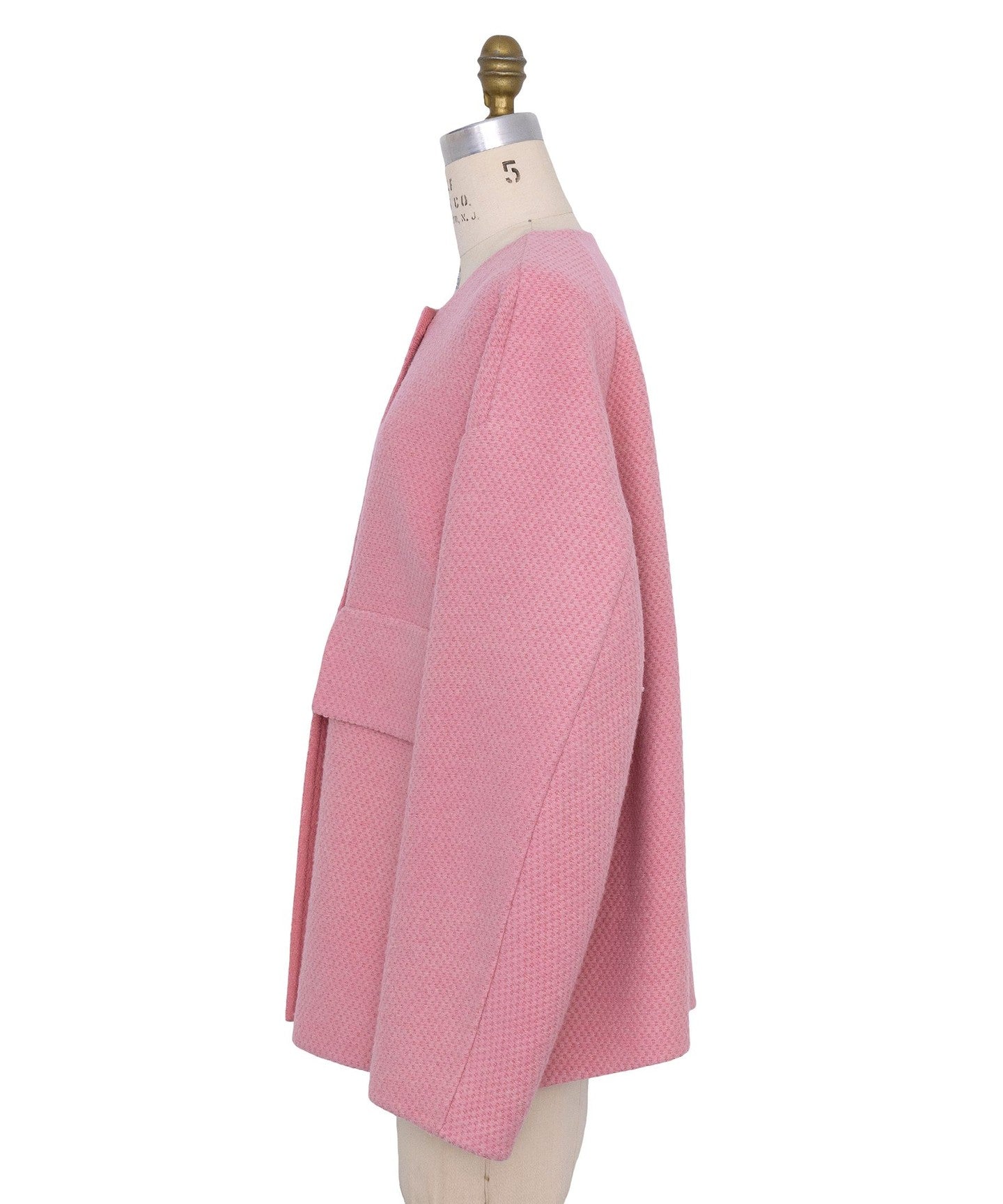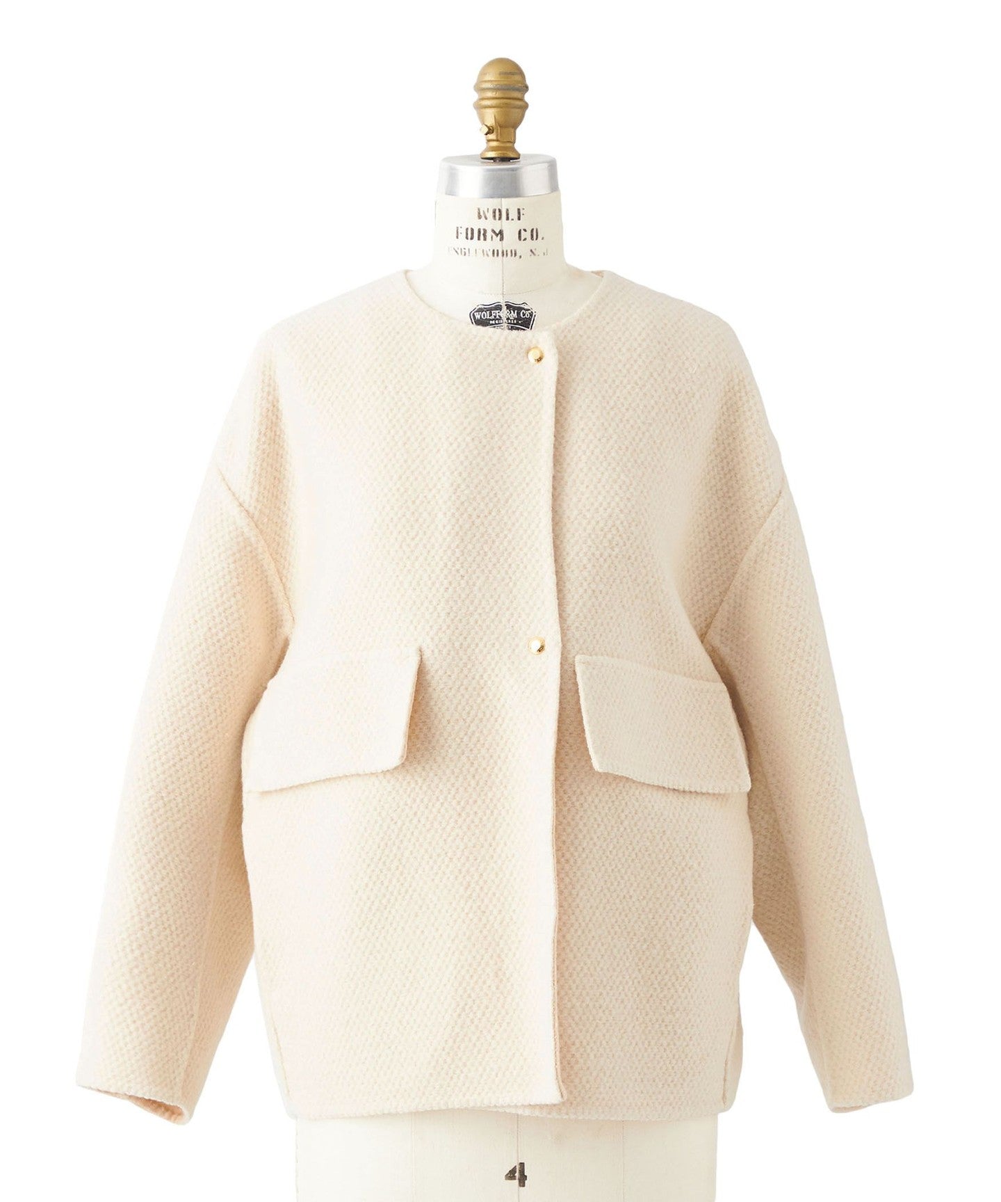 This collarless jacket features large flap pockets placed high on the front for a relaxed look.