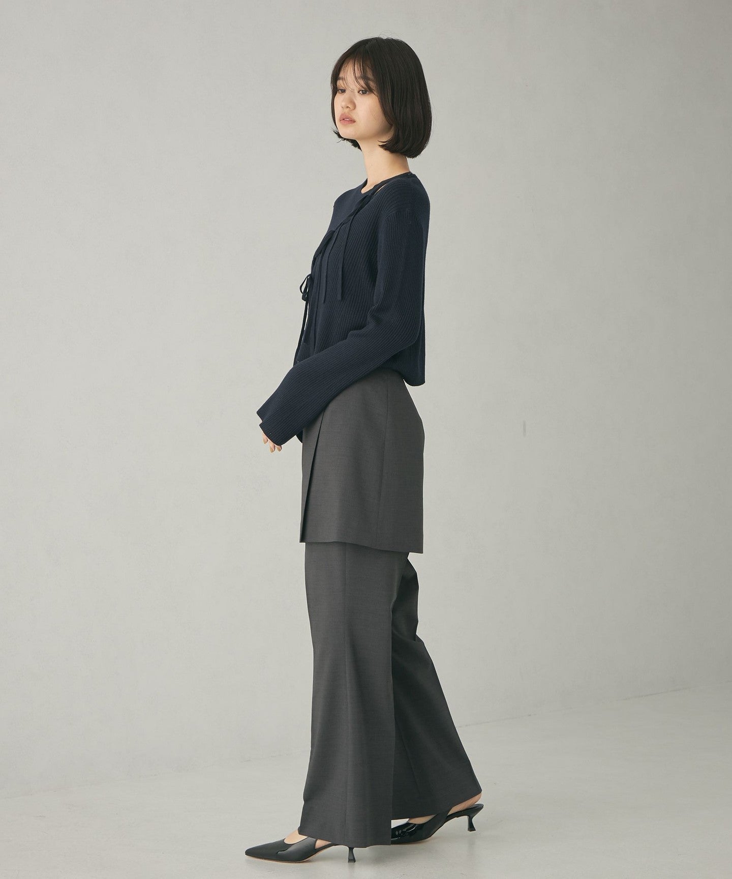 A wrap skirt and flared pants set that lets you enjoy a trendy look