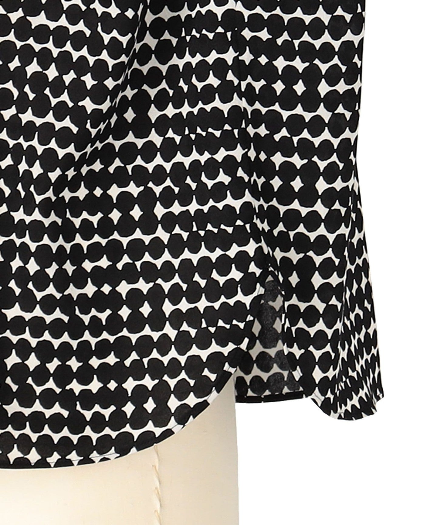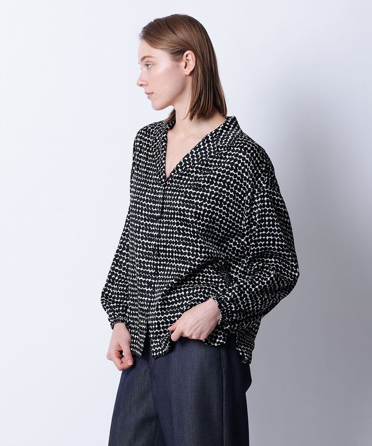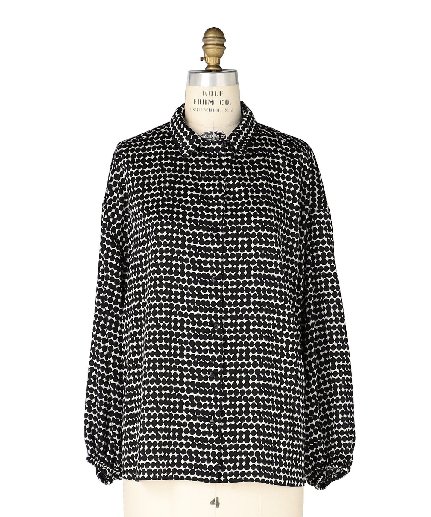 A front button blouse with an eye-catching polka dot pattern that gives it a modern feel.