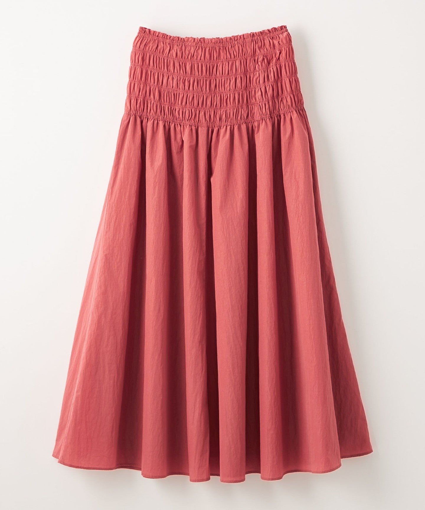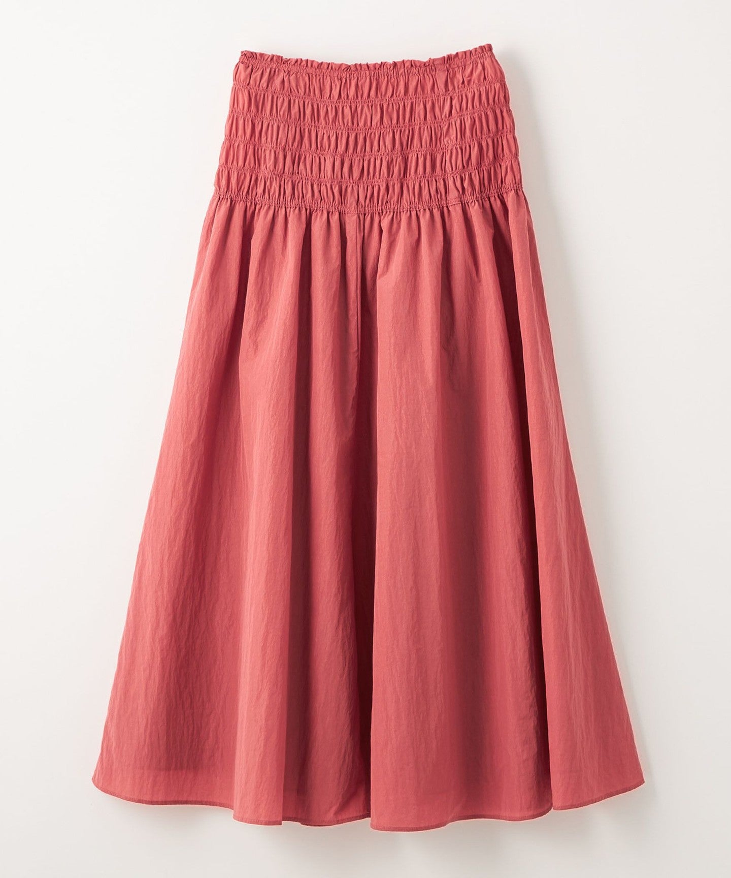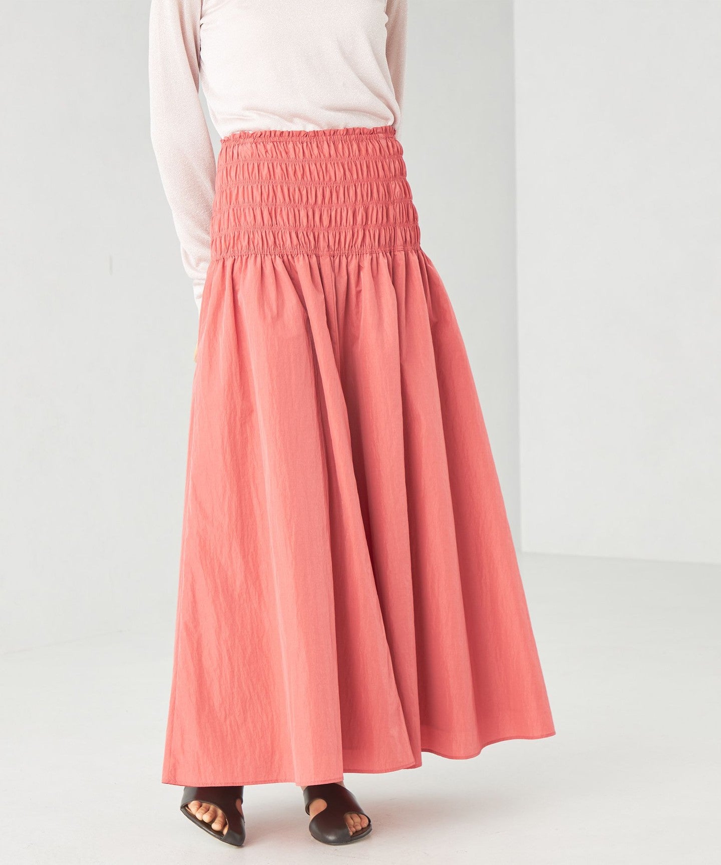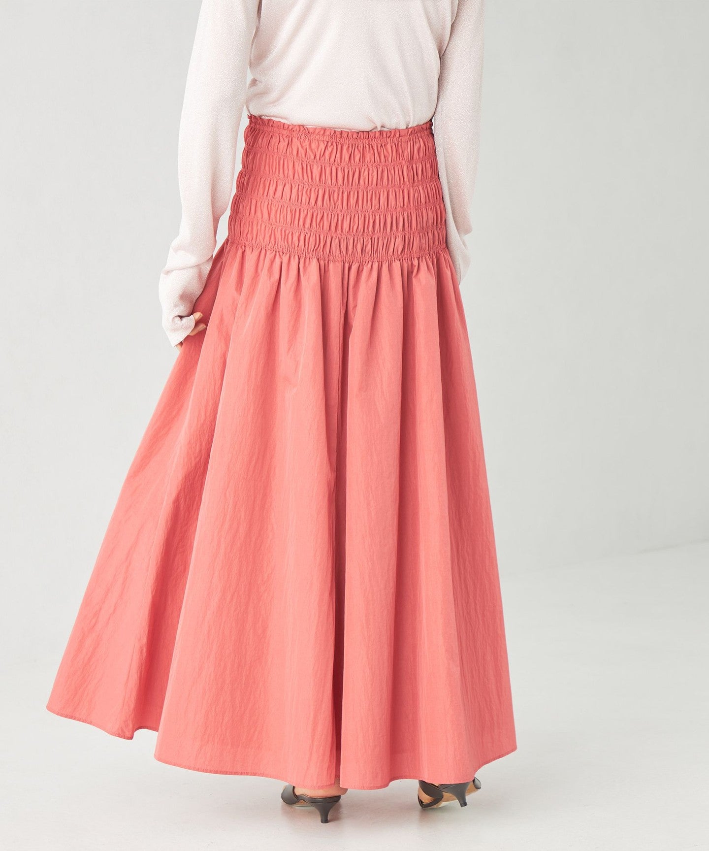 This long skirt's vibrant color will look great with any spring or summer outfit, and the shirring at the waist and dramatic silhouette are key features.