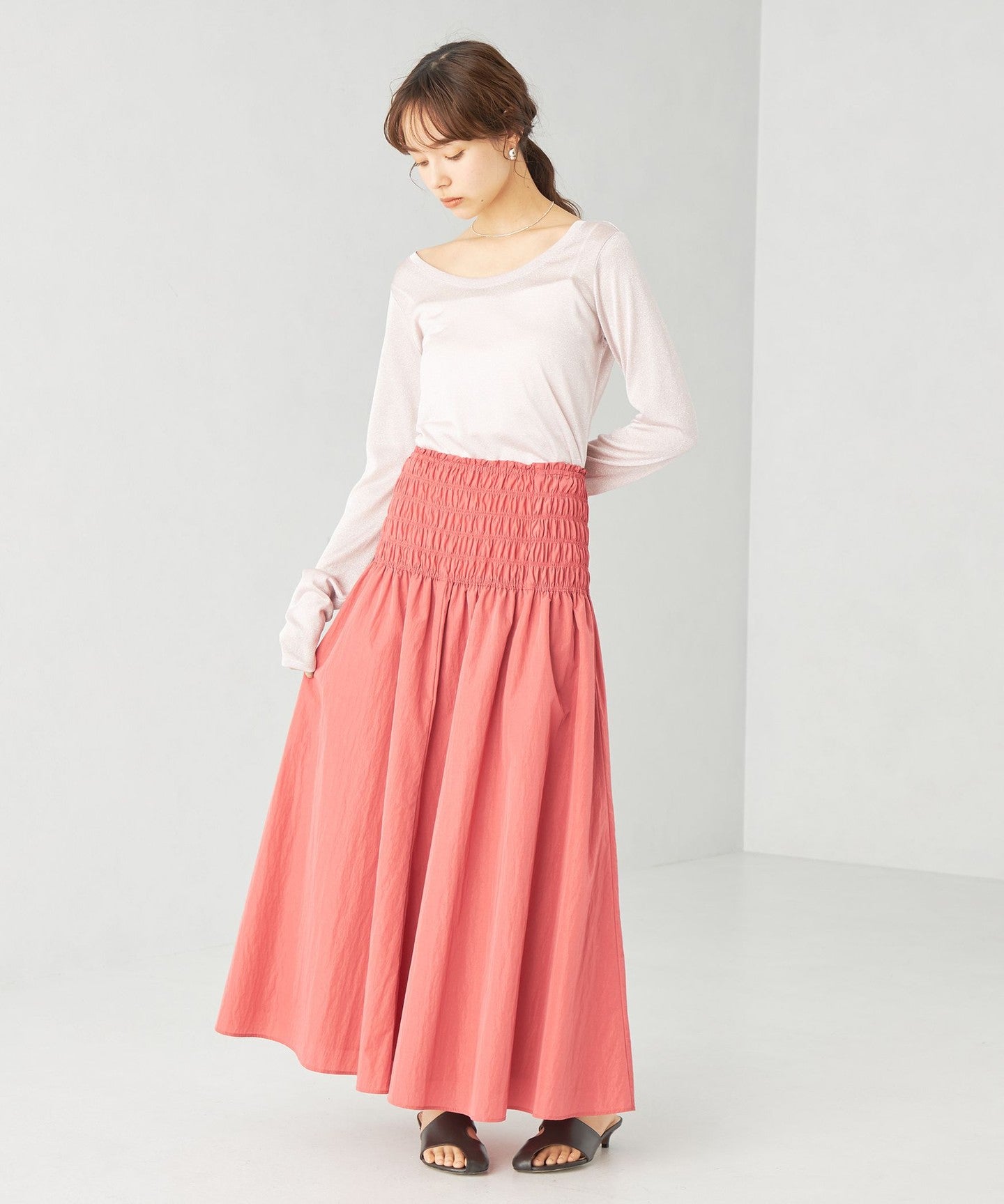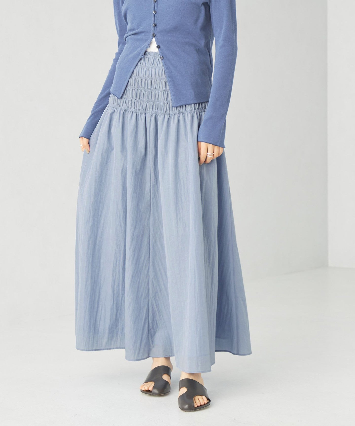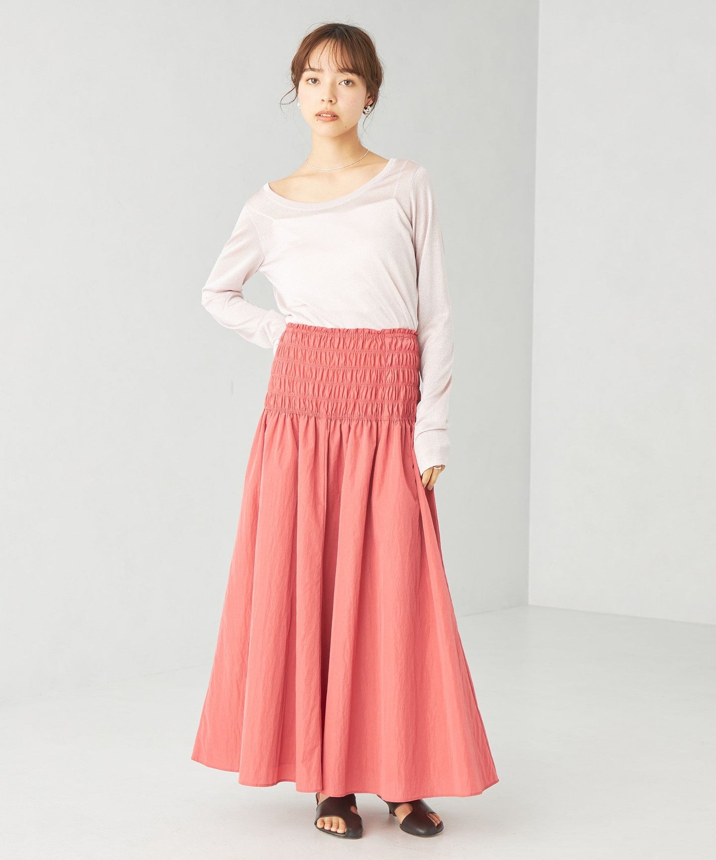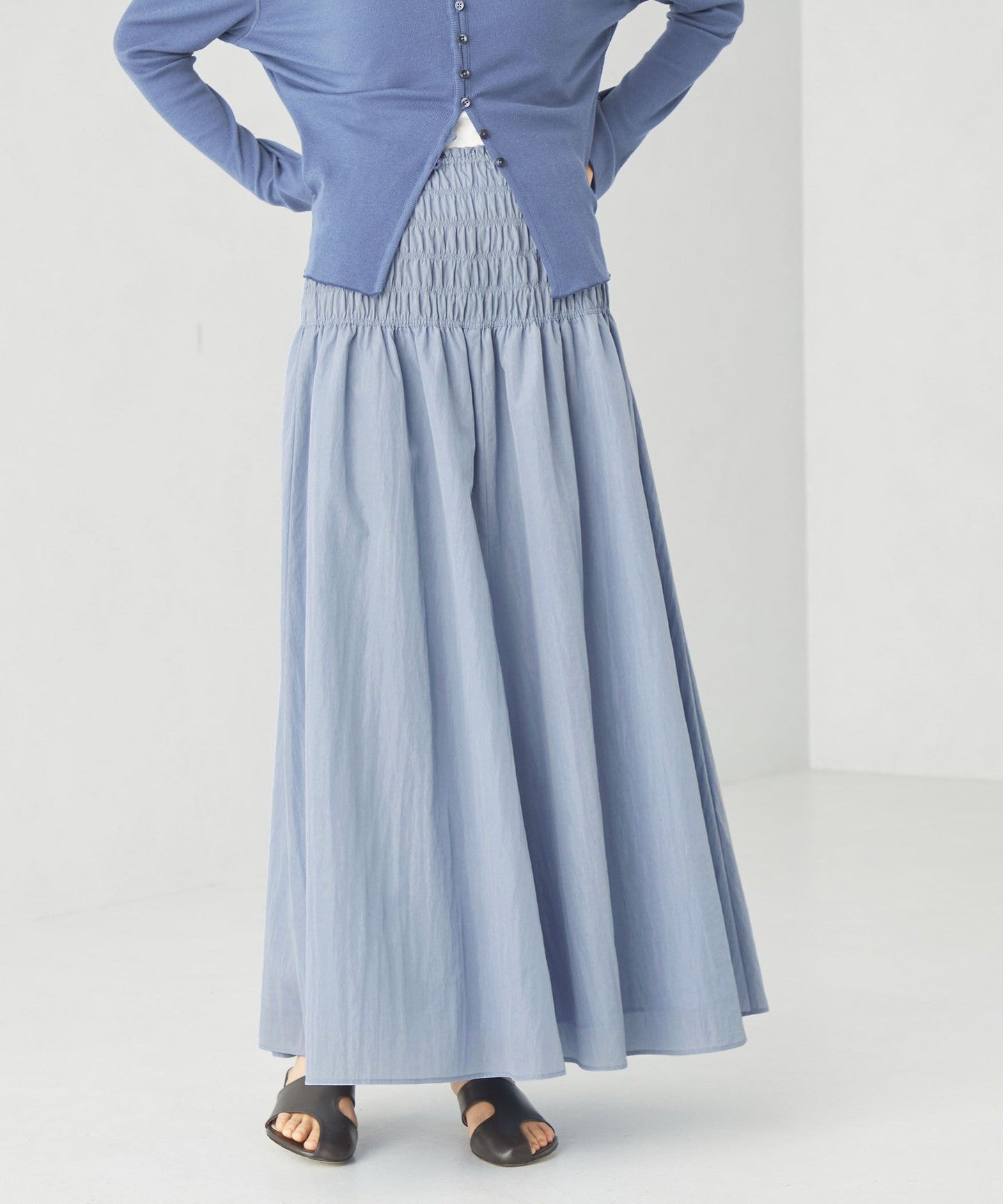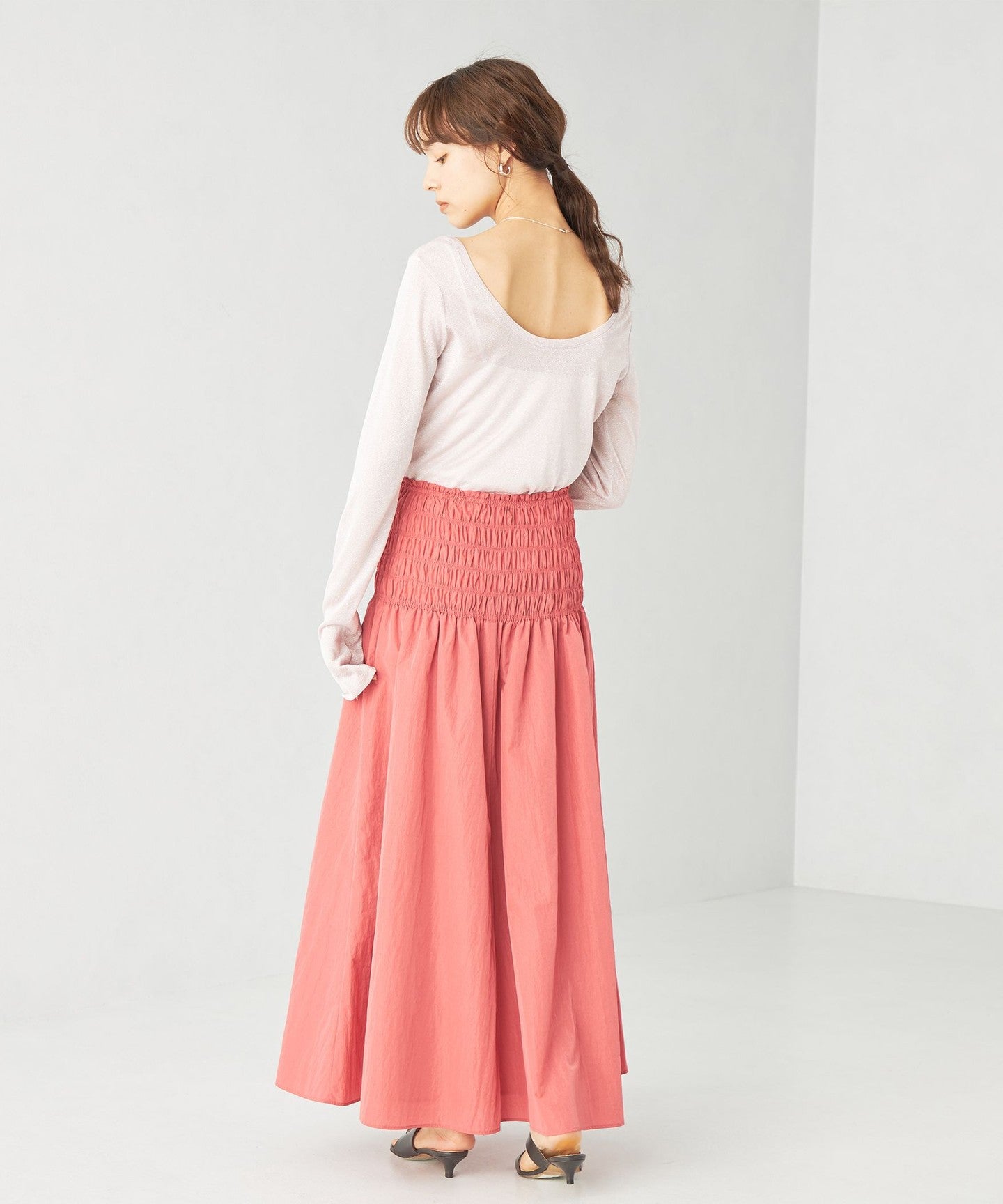 This long skirt's vibrant color will look great with any spring or summer outfit, and the shirring at the waist and dramatic silhouette are key features.