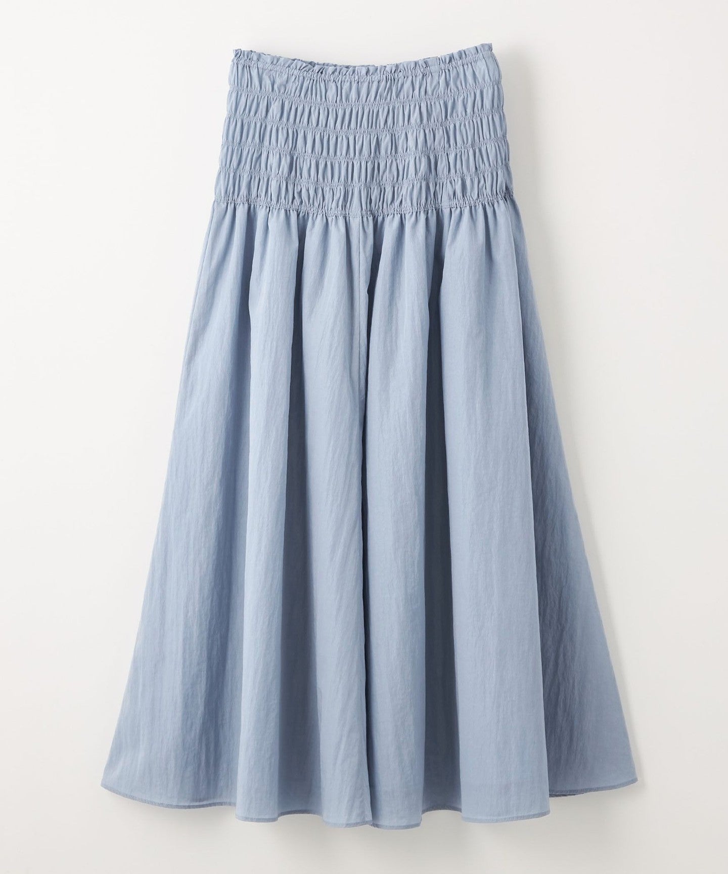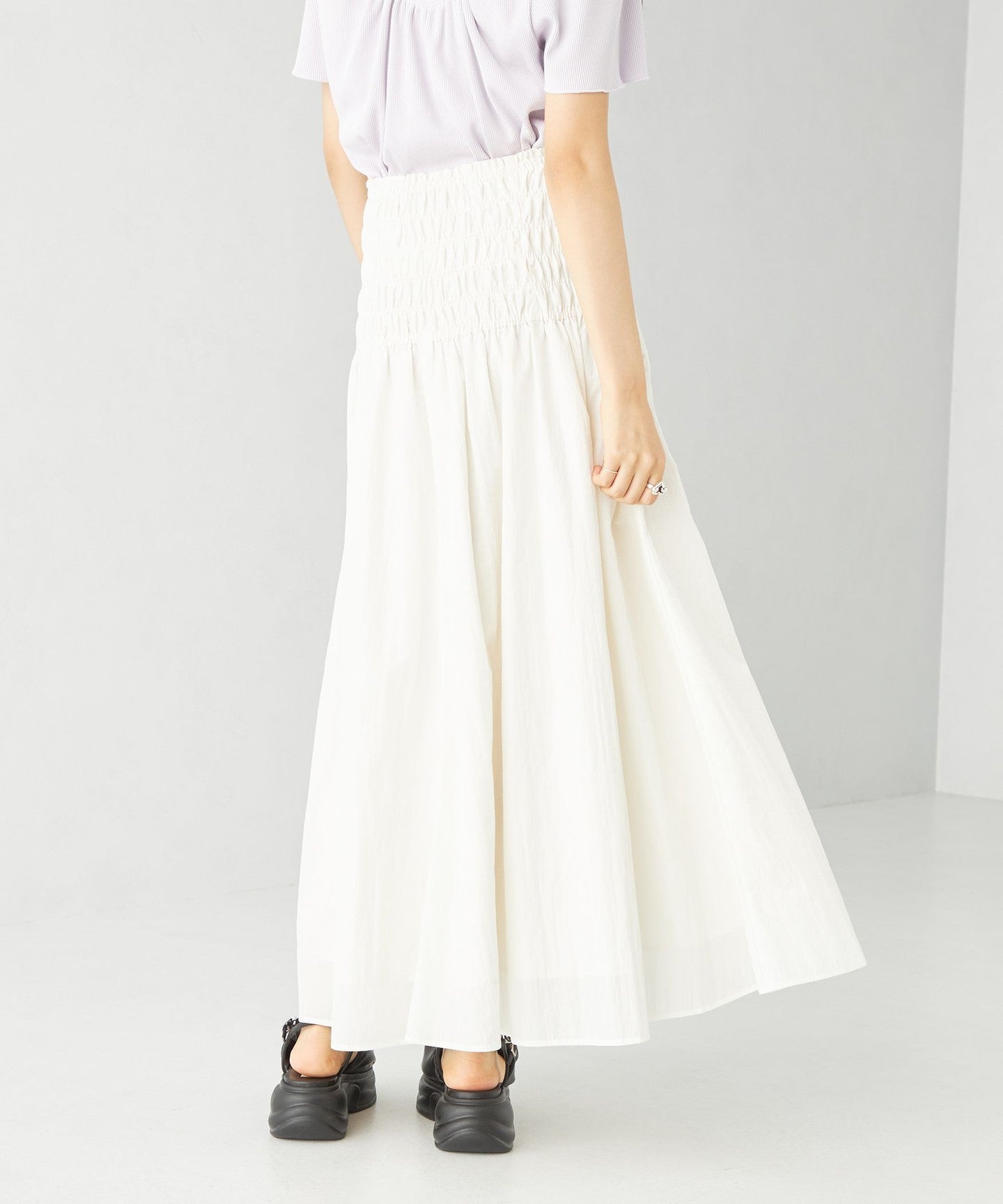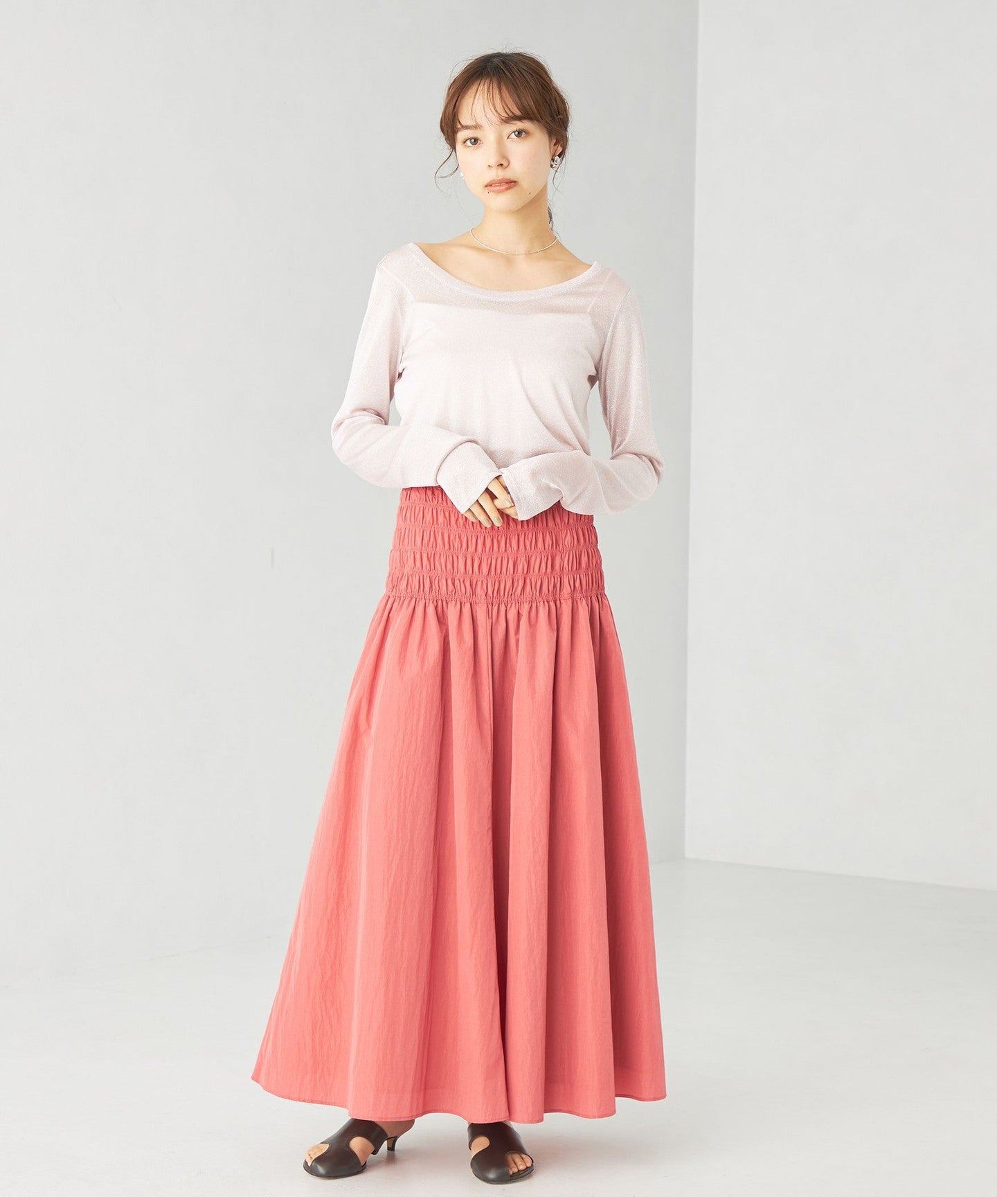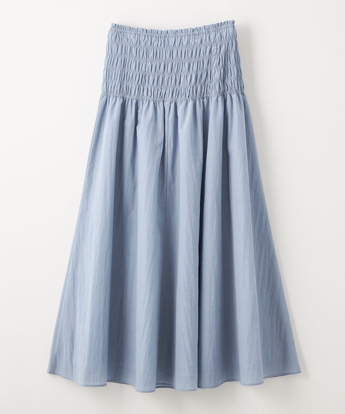 This long skirt's vibrant color will look great with any spring or summer outfit, and the shirring at the waist and dramatic silhouette are key features.