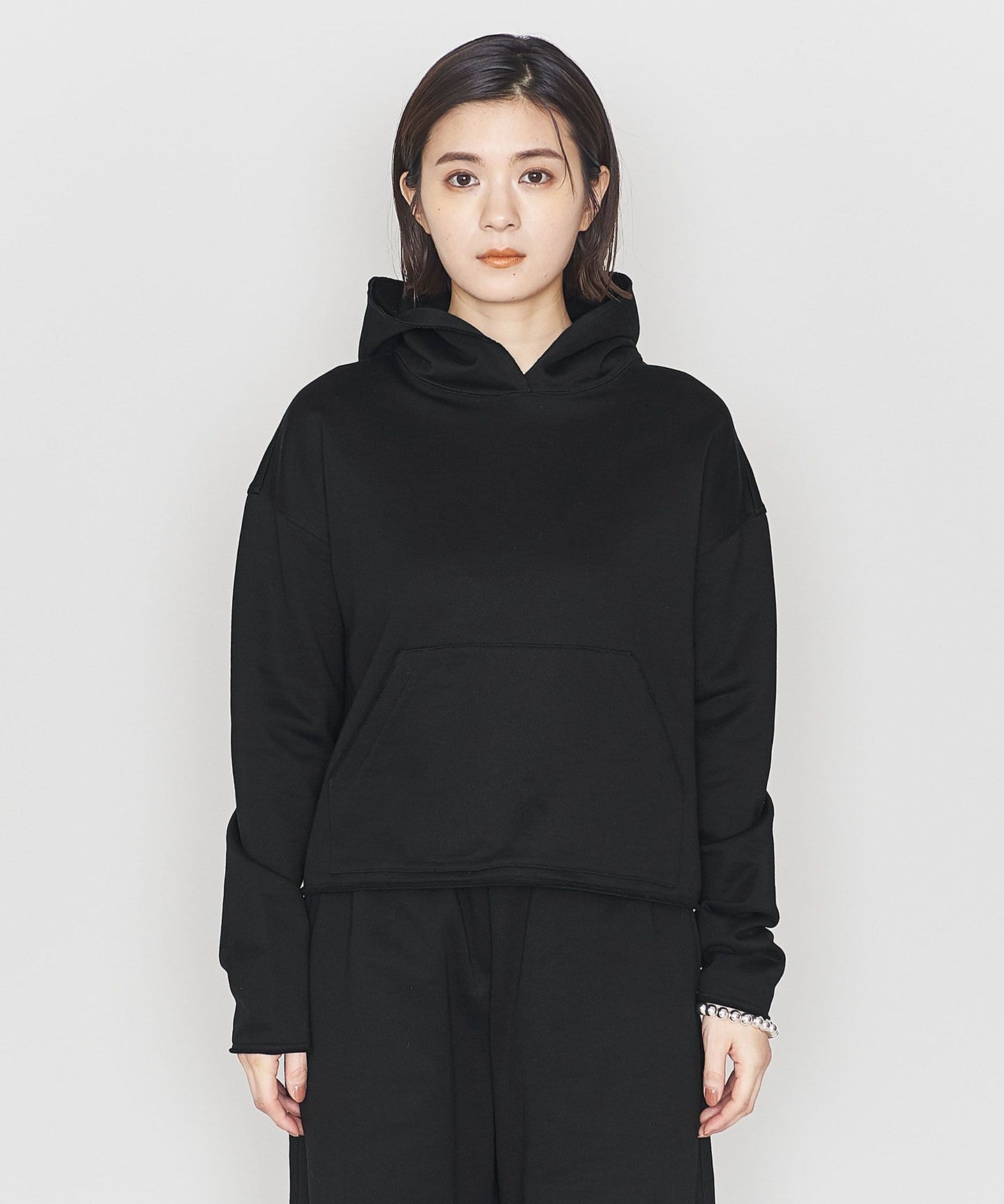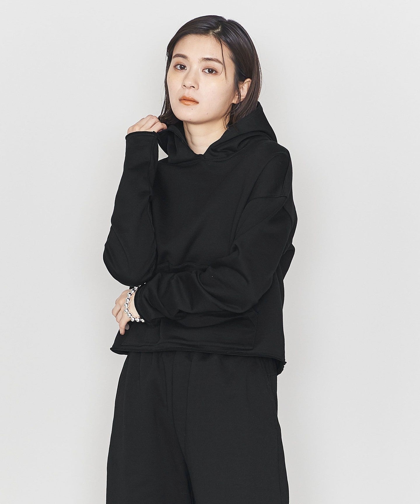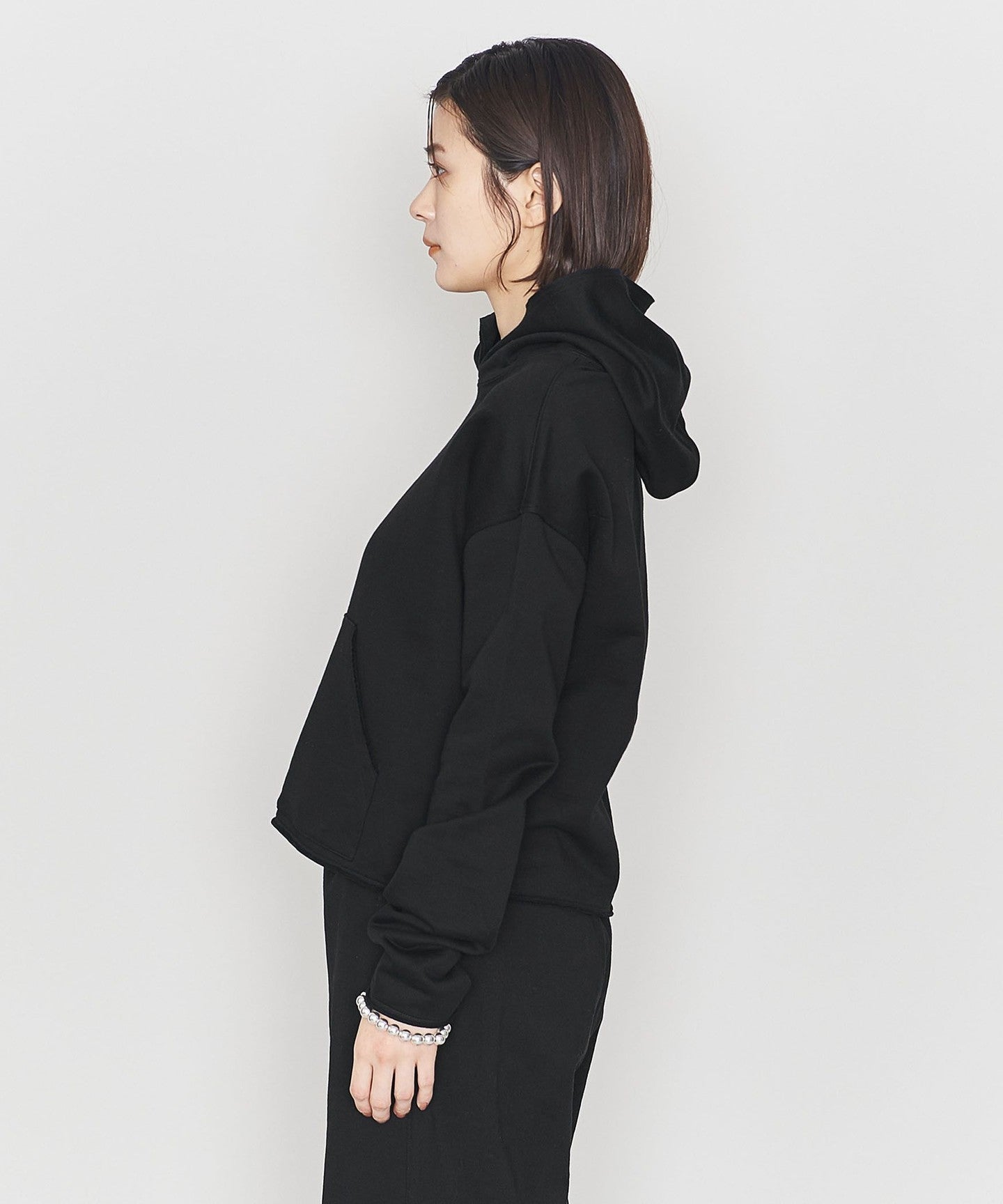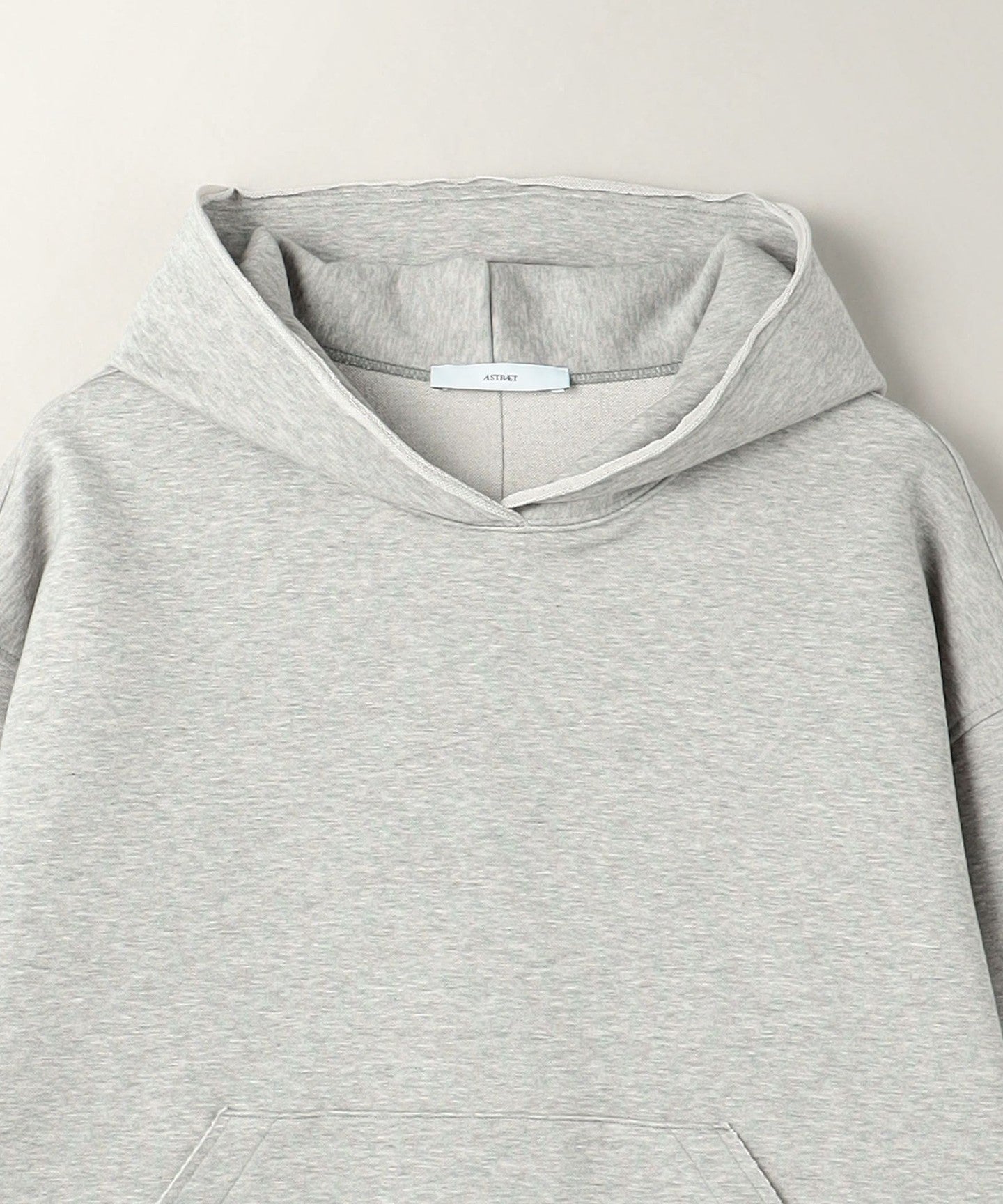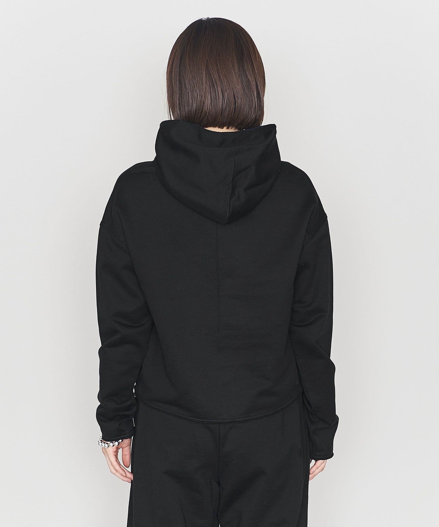 SLEEVE OPENING, HEM A pullover hoodie with a raw edge design around the hood.